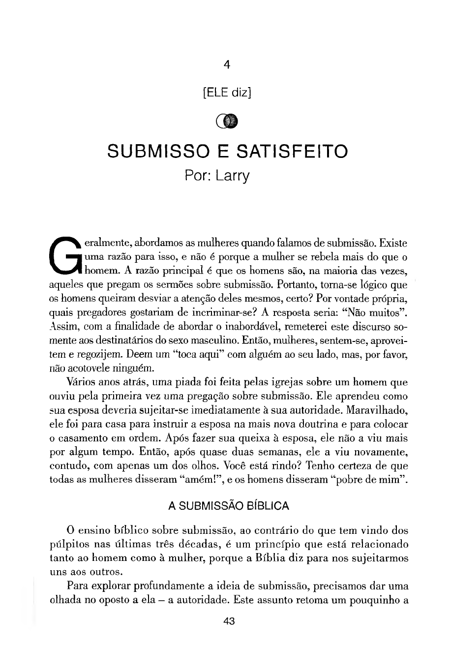 4 [ELE diz] SUBMISSO E SATISFEITO Por: Larry Geralmente, abordamos as mulheres quando falamos de submissão. Existe uma razão para isso, e não é porque a mulher se rebela mais do que o homem. A razão principal é que os homens são, na maioria das vezes, aqueles que pregam os sermões sobre submissão. Portanto, toma-se lógico que os homens queiram desviar a atenção deles mesmos, certo? Por vontade própria, quais pregadores gostariam de incriminar-se? A resposta seria: “ Não muitos” . Assim, com a finalidade de abordar o inabordável, remeterei este discurso so mente aos destinatários do sexo masculino. Então, mulheres, sentem-se, aprovei tem e regozijem. Deem um “ toca aqui” com alguém ao seu lado, mas, por favor, não acotovele ninguém. Vários anos atrás, uma piada foi feita pelas igrejas sobre um homem que ouviu pela primeira vez uma pregação sobre submissão. Ele aprendeu como sua esposa deveria sujeitar-se imediatamente à sua autoridade. Maravilhado, ele foi para casa para instruir a esposa na mais nova doutrina e para colocar o casamento em ordem. Após fazer sua queixa à esposa, ele não a viu mais por algum tempo. Então, após quase duas semanas, ele a viu novamente, contudo, com apenas um dos olhos. Você está rindo? Tenho certeza de que todas as mulheres disseram “ amém!” , e os homens disseram “ pobre de mim” . A SUBMISSÃO BÍBLICA 0 ensino b íblico sobre submissão, ao contrário do que tem vindo dos púlpitos nas últimas três décadas, é um princípio que está relacionado tanto ao homem com o à mulher, porque a Bíblia diz para nos sujeitarmos uns aos outros. Para explorar profundamente a ideia de submissão, precisamos dar uma olhada no oposto a ela — a autoridade. Este assunto retoma um pouquinho a 43 E L E D I Z , E L A D I Z questão do controle, mas a autoridade é muito mais do que simplesmente ser a cabeça do lar enquanto dá liberdade à sua esposa. Vamos levar em con sideração a definição da verdadeira autoridade bíblica e identificar o que a autoridade não é. A autoridade pode dar vida ou devastar a de alguém. A autoridade opres siva, unilateral, supressiva e ditadora é má, antibíblica e profana. Mas a exercida de forma apropriada é um modelo organizacional libertador, produ tivo, bem-sucedido e altamente eficiente. A AUTORIDADE DEMONÍACA O mau uso da autoridade pode tornar-se demoníaco. Ao longo dos séculos da civilização humana, os ditadores abusaram da autoridade e abriram uma porta para a atividade de Satanás. Por favor, perceba que o que distingue a autoridade de Satanás da do Espírito Santo é o ódio do diabo à submissão. Satanás exige submissão dos seus súditos, mas ele resiste sujeitar-se às ou tras autoridades, principalmente à de Jesus. 0 diabo sabe que a autoridade bíblica exigiria que ele também se sujeitasse ao senhorio de Cristo. Satanás odeia a doutrina da submissão. Quando ensinamos esse assun to, não é de se admirar que ele incentive resistência e oposição ao tema. A submissão é o que impede que a autoridade se torne algo maligno. 0 diabo precisa desesperadamente de autoridade, mas não de submissão. Talvez al guém deva dizer a Satanás e seus súditos que eles se sujeitarão tanto nessa vida como na próxima; mas se sujeitarão ao final. Pelo que também Deus o exaltou soberanamente e lhe deu um nome que é sobre todo o nome, para que ao nome de Jesus se dobre todo joelho dos que estão nos céus, e na terra, e debaixo da terra, e toda língua confesse que Jesus Cristo é o Senhor, para glória de Deus Pai. Filipenses 2.9-11 Você vê como é importante para quem exerce autoridade estar debaixo dela? Jesus a tinha, porque se sujeitava à autoridade do Pai. E você a tem, porque se sujeita a Jesus e àquele que tem autoridade sobre você. Sua esposa e filhos têm autoridade quando se sujeitam à sua. É perigoso para um líder exercer autoridade sem submeter-se à liderança. 0 arreio da submissão beneficia líderes e liderados, pois isso produz quebranta mento, humildade e compaixão, que geram um bom líder. Porém, o mais impor tante: se um líder não se mantém submisso a uma autoridade superior, ele corre o risco de abusar de sua própria autoridade e de também perdê-la. 44 Submisso e Satisfeito A submissão é essencial para a liderança eficiente. Um coração submisso é igual a um obediente e rendido. A submissão que vem de uma atitude subserviente e relutante à autoridade destrói a eficácia da submissão. Este tipo de atitude aniquila o sucesso do líder. “ Oh, acho que serei submis so se for obrigatório” não corresponde à sua autoridade, nem move a mão de Deus, que conhece seu coração e consegue reconhecer suas motivações impuras. A autoridade religiosa, exercida sob a direção bíblica, deve ser o objetivo final de todos os líderes. Cada um deles deve ser completamente submisso aos que estão acima dele. Os líderes que não se sujeitam aos outros irão, por fim, fracassar. A submissão é uma ideia divina. A palavra submissão é um termo militar que significa “ colocar-se debaixo de quem possui um nível acima do seu” . A palavra grega hupotasso vem da palavra hupo, uma preposição que significa “ de baixo” , e tasso, um verbo que quer dizer “ organizar de forma ordenada” . Cada um no exército de Deus deve alinhar-se sob alguém. [Por exemplo,] se você é um tenente, deve alinhar-se sob o capitão. Do mesmo modo, os capitães sujeitam-se aos majores, que se sujeitam aos coronéis, que se submetem aos generais. Todos no exército de Deus começam como soldados, os quais se sujeitam a todos! Con tudo, todos devem alinhar-se diante do Senhor para honrar Sua autoridade. Deus não se move coletiva ou individualmente até que todo mundo se alinhe e mova-se conforme Sua posição prescrita. A submissão não é uma questão de gênero sexual, de acordo com as Escrituras. Todos devem sujeitar-se à autoridade, ou não 