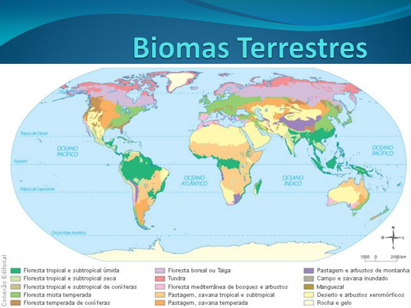 Biomas Terrestres São grandes ecossistemas constituídos por comunidades que atingiram o estagio climácico, caracterizado pelo seu clima, flora e fauna. É uma comunidade de plantas e animais com formas de vida e condições ambientais semelhantes. Um bioma é influenciado pelo macroclima, tipo de solo, condição do substrato, e outros fatores físicos como, a latitude, temperaturas médias e extremas da região, o relevo, o regime de chuvas e o tipo de solo. Praticamente a cada tipo climático corresponde um bioma, marcado por uma determinada cobertura vegetal. Biomas Floresta Tropical Desenvolvem-se em baixas altitudes e próximas do Equador, entre os trópicos de câncer e capricórnio, estando presente em ambos hemisférios. Clima úmido e quente, chuvas abundantes, estações mal definidas, com temperaturas elevadas ( Clima Tropical). A vegetação é exuberante com árvores de grande porte, muito densa e rica em espécies. A reciclagem da matéria orgânica é muito rápida, forma-se um solo escuro rico em matéria orgânica (húmus) Apesar de podermos distinguir subtipos de florestas tropicais, elas têm algumas características em comum: A copa das grandes árvores se tocam formando uma cobertura sob a qual se encontram as copas das árvores menores. Essas copas impedem a penetração dos raios solares, por essa razão o solo da floresta é escuro mesmo durante os dia. Os principais exemplos são a floresta Amazônica, a floresta do Congo (África), e a da Indonésia (Ásia). Mais afastadas do Equador, as florestas tropicais recebem menor quantidade de calor e chuva, por isso são menos exuberantes que as equatoriais, ocupavam grande parte da faixa tropical da América do Sul (Brasil), da América Central, do norte da Austrália e do Sudeste Asiático. -> São Heterogêneas: vegetação constituída de grande variedade de espécies; -> Perenes: floresta sempre verde, não perde suas folhas em nenhuma estação; -> Higrófilas: plantas adaptadas em climas muito úmidos; -> Latifoliadas: plantas de folhas largas. -> Maior Biodiversidade: variedade de espécies animais e vegetais. Destacam-se os mamíferos arborícolas (macacos, lémures, preguiças) gorila, chimpanzé, leopardo (África); orangotango, Tigre (Ásia) aves. Dentre os terrestres citam-se: serpentes, onças, gatos-do-mato, cotias, capivaras, tapires ,insectos como: mosquitos, besouros, formigas, grandes mamíferos são raros. Este é o bioma de maior produtividade biológica da Terra. Floresta Temperada É um bioma encontrado nas regiões situadas entre os pólos e os trópicos. Recobre as áreas que hoje são as mais povoadas da superfície terrestre: Europa, China, Japão, Leste da América do Norte, no hemisfério sul – Austrália, Nova Zelândia e Chile. Clima temperado oceânico, estações do ano bem definidas, com queda de neve no inverno, é uma floresta decídua ou de folhas caducas, ou seja, plantas que perdem suas folhas em determinada época do ano, principalmente no inverno. No outono, as folhas mudam de cor, assumindo um lindo tom avermelhado. É o bioma mais devastado do mundo, pois seu solo fértil foi muito aproveitado para a agricultura, dentre suas áreas de ocorrência, o maior números das espécies dessa floresta está na América do Norte. As florestas temperadas não são todas iguias. Podem ser encontradas espécies perenes entre as decíduas, bem como flores e tapetes de musgos e cogumelos. Na fauna são encontrados javalis, veados, raposas doninhas, esquilos, vários tipos de pássaros, corujas e várias espécies de insetos. Taiga ou Floresta Boreal A taiga é também chamada de floresta boreal, porqu ocorre apenas no hemisfério norte. Os invernos são muito rigorosos, com queda de neve, e os verões são quentes ( clima temperado continental). É uma floresta Homegênea, pois é formada quase só por coníferas (abertos e pinheiros), plantas aciculifoliadas ( plantas com folhas em forma de agulhas), resistentes ao frio e perenes ( sem perda de folhas). Cobre grandes extensões da Rússia, do Alasca, da Noruega, da Suécia, Finlândia e do Canadá. Na Escandinávia e no Canadá alimenta importantes industrias madeireiras, de papel e celulose, dos quais a madeira que fornece é a principal metéria-prima. A fauna mostra mamíferos característicos, como: alces, ursos polares, lobos, raposas, marta, lince, vários tipos de insetos e aves migradoras. Tundra Situam-se nas regiões próximas ao Pólo Ártico. Suas áreas de ocorrências são as regiões próximas ao oceano glacial ártico: Alasca, Norte do Canadá. Groelândia, Norte da Rússia e da Escandinávia. É o bioma mais frio do mundo e é basicamente um deserto gelado, pois apresentam poucas precipitações (neve) durante o ano. É característica do seu clima possuir apenas duas estações: um inverno longo e frio com noites contínuas, e um verão curto com temperaturas amenas. A estação mais quente dura mais ou menos 60 dias e a temperatura mais alta não ultrapassa 10°C Todo o solo passa o inverno congelado, e durante o verão apenas uma fina camada superior, cerca de 15 cm, descongela, e o subsolo continua congelado. A composição botânica é influenciada pelas condições do solo e do clima. A tundra, portanto só cresce no períodos de degelo, suas principais espécies são os musgos e os liquens, plantas rasteiras, pois as árvores não sobrevivem nesse tipo de clima. Possui um solo com pouca profundidade e encharcado no verão, A fauna é composta na sua maioria de animais migratórios que chegam durante o verão, mas alguns animais são residentes como o caribu, as raposas, as aves predadoras, o urso polar e pequenos mamíferos que constroem túneis no manto da vegetação, como os lemingues(roedores), bois almiscarados, renas, alces, lebres, perdizes da neve, também são vistos nestas áreas. Montanhas O fator climático que caracteriza esse bioma é a altitude, por isso encontramos neves em altas montanhas, em ple