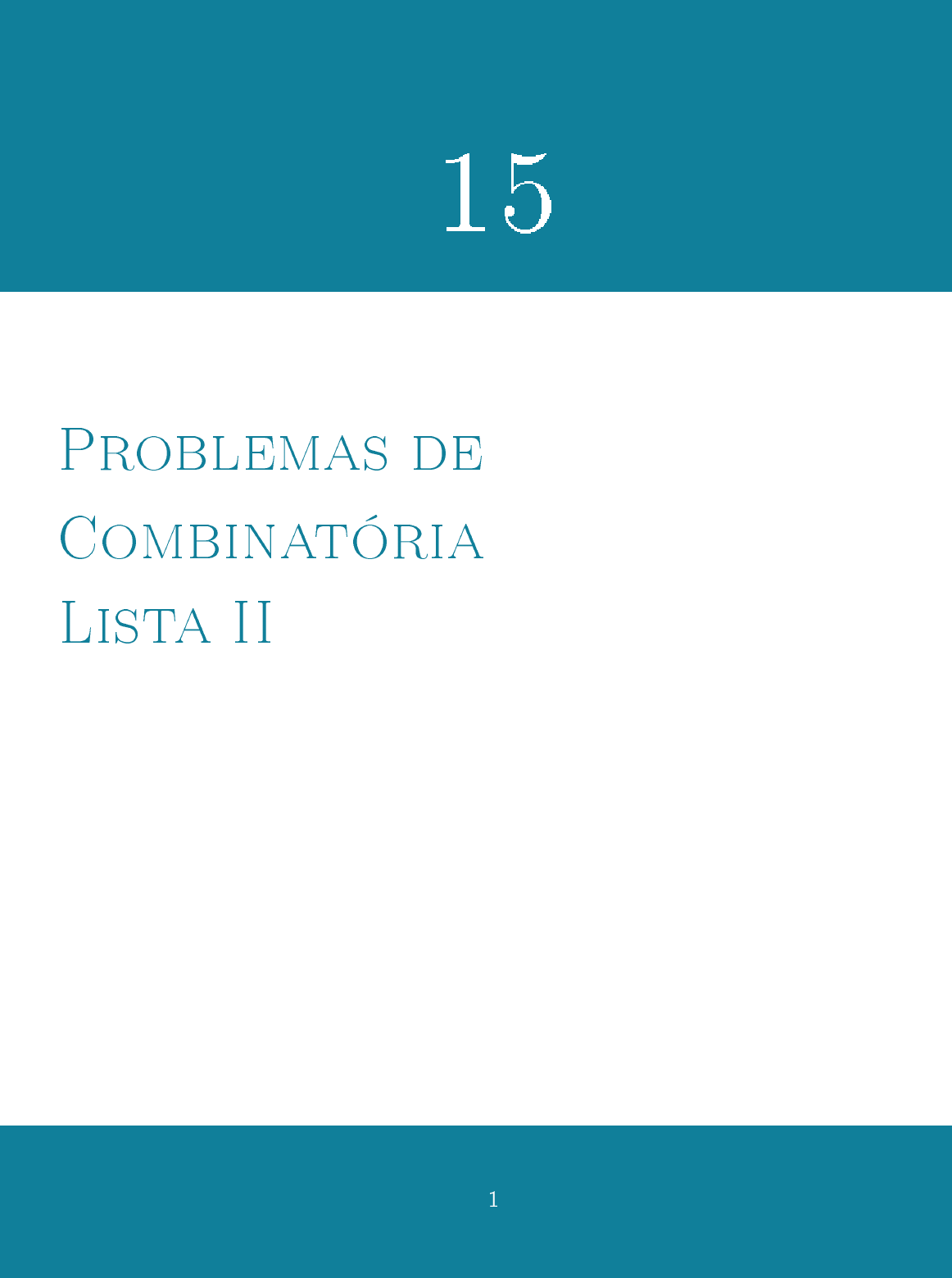 15 1 Problemas de Combinatória Lista II Unidade 15 Problemas Lista 2 1. De quantos modos é possível colocar r rapazes e m moças em fila de modo que as moças permaneçam juntas? 2. Quantos dados diferentes é possível formar gravando números de 1 a 6 sobre as faces de um cubo? a) Suponha uma face de cada cor. b) Suponha faces iguais. c) Suponha que as faces são iguais e que a soma dos pontos de faces opostas deva ser igual a 7. 3. Resolva o problema anterior, no caso b), para os outros 4 poliedros regu- lares. 4. Determine n para que n∑ k=1 k! seja um quadrado perfeito. 5. Quantos são os anagramas da palavra �ESTRELADA�? 6. O conjunto A possui n elementos. Quantos são os seus subconjuntos com p elementos? 7. Uma faculdade realiza seu vestibular em dois dias de provas, com 4 maté- rias em cada dia. Este ano a divisão foi: Matemática, Português, Biologia e Inglês no primeiro dia e Geografia, História, Física e Química no segundo dia. De quantos modos pode ser feito o calendário de provas? 8. Qual é o erro na solução do problema abaixo? Com 5 homens e 4 mulheres, quantas comissões de 5 pessoas, com pelo menos 3 homens, podem ser formadas? �Solução: Primeiramente vamos escolher 3 homens para a comissão, o que pode ser feito de C35 = 10 modos. Agora devemos escolher mais duas pessoas para a comissão, homens ou mulheres, entre as 6 pessoas restantes, o que pode ser feito de C26 = 15. A resposta é 10×15 = 150.� 2 Unidade 15 Problemas de Combinatória Lista II 9. Quantas diagonais possui: a) um octaedro regular? b) um icosaedro regular? c) um dodecaedro regular? d) um cubo? e) um prisma hexagonal regular? 10. Sejam Im = {1, 2, . . . ,m} e In = {1, 2, . . . , n}, com m 6 n. Quantas são as funções f : Im → In estritamente crescentes? 11. Quantos são os números naturais de 7 dígitos nos quais o dígito 4 figura exatamente 3 vezes e o dígito 8 exatamente 2 vezes? 12. Quantos são os subconjuntos de {a1, a2, . . . , an}, com p elementos, nos quais: a) a1 figura; b) a1 não figura; c) a1 e a2 figuram; d) pelo menos um dos elementos a1, a2 figura; e) exatamente um dos elementos a1 e a2 figura. 13. De um baralho de pôquer (7, 8, 9, 10, valete, dama, rei e ás, cada um desses grupos aparecendo em 4 naipes: copas, ouros, paus, espadas), sacam-se simultaneamente 5 cartas. a) Quantas são as extrações possíveis? Quantas são as extrações nas quais se forma: b) um par (duas cartas em um mesmo grupo e as outras três em três outros grupos diferentes)? c) dois pares (duas cartas em um grupo, duas em outro grupo e uma em um terceiro grupo)? d) uma trinca (três cartas em um grupo e as outras duas em dois outros grupos diferentes)? 3 Unidade 15 e) um �four� (quatro cartas em um grupo e uma em outro grupo)? f) um �full hand� (três cartas em um grupo e duas em outro grupo)? g) uma sequência (5 cartas de grupos consecutivos, não sendo todas do mesmo naipe)? h) um �flush� (5 cartas do mesmo naipe, não sendo elas de 5 grupos consecutivos)? i) um �straight flush� (5 cartas de grupos consecutivos, todas do mesmo naipe)? j ) um �royal straight flush� (10, valete, dama, rei e ás de um mesmo naipe)? 14. O conjunto A possui p elementos e o conjunto B possui n elementos. Determine o número de funções f : A→ B sobrejetoras para: a) p = n; b) p = n+ 1; c) p = n+ 2. 15. Considere um conjunto C de 20 pontos do espaço que tem um subcon- junto C1 formado por 8 pontos coplanares. Sabe-se que toda vez que 4 pontos de C são coplanares, então eles são pontos de C1. Quantos são os planos que contêm pelo menos três pontos de C? 4 Problemas de Combinatória 6mm Lista II