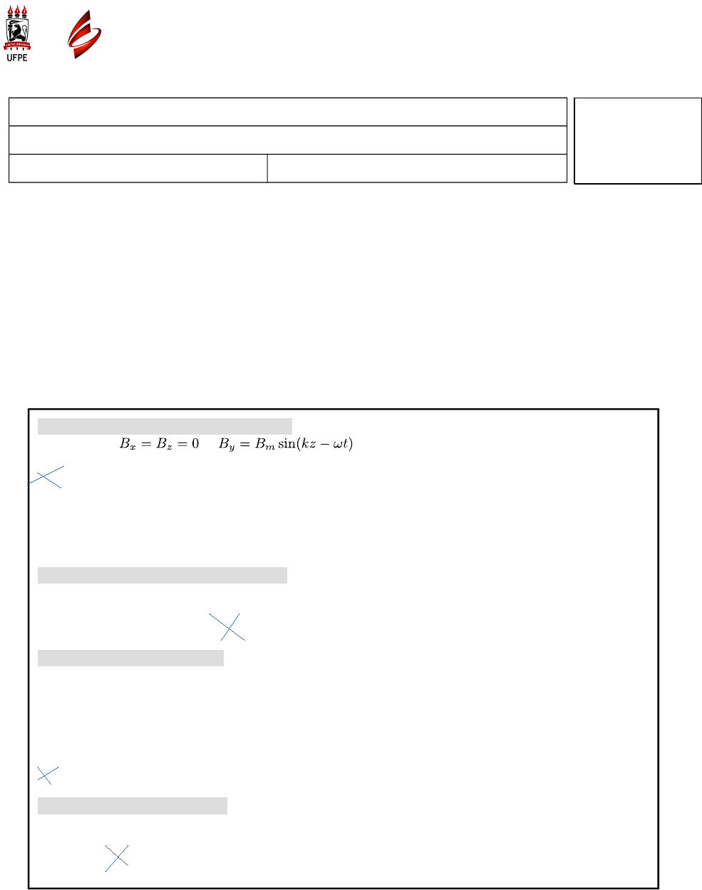 UNIVERSIDADE FEDERAL DE PERNAMBUCO Departamento de Física Física Geral 4 – Prova Final – Segundo Semestre/2017 11/12/2017 – 13:00 às 15:00 Nome CPF Turma 1. Esta prova contém 12 questões objetivas, de múltipla escolha. Marque com um X uma das alternativas usando caneta azul ou preta. Questões com mais de uma opção marcada não serão pontuadas 2. Devolva apenas esta prova com as respostas assinaladas 3. Evite ingerir líquidos durante a prova porque não dispomos de fiscais para acompanhar idas ao banheiro 4. Celulares devem estar desligados e mantidos fora do alcance, junto com o restante do seu material didático 5. Os cálculos numéricos são simples, por isso não é permitido o uso de calculadoras eletrônicas 6. Devolver a prova apenas após as 13:40 h 7. Algumas fórmulas e constantes fundamentais se encontram no fim da prova 8. Boa prova para todos. 1ª Unidade (3,0 pontos) 2ª Unidade (3,5 pontos) Questão 1 [0,5] (ondas eletromagnéticas) O campo magnético de uma onda etromagnética plana tem componentes e . A direção de propagação da onda e o plano de oscilação do campo elétrico E são (a) Direção de propagação: z positivo; plano de oscilação de E: xz. (b) Direção de propagação: z negativo; plano de oscilação de E: xy. (c) Direção de propagação: x positivo; plano de oscilação de E: yz. (d) Direção de propagação: x negativo; plano de oscilação de E: xz. (e) Direção de propagação: y positivo; plano de oscilação de E: xz. Questão 2 [0,5] (ondas eletromagnéticas) Se dois filtros polarizadores forem superpostos de tal forma que as direções de polarização façam um ângulo de 30° e forem iluminados com luz não polarizada, a razão entre a intensidade da luz transmitida e a intensidade da luz incidente será (a) 1/4 (b) 1/3 (c) 1/2 (d) 3/4 (e) 3/8 Questão 3 [1,0] (interferência) As ondas que passam por duas fendas estão inicialmente em fase e produzem o terceiro máximo lateral da figura de interferência em uma tela distante. A diferença de percurso das duas ondas corresponde a (a) meio comprimento de onda. (b) um comprimento de onda. (c) três meios comprimentos de onda. (d) dois comprimentos de onda. (e) três comprimentos de onda. Questão 4 [1,0] (interferência) Em um experimento de Young, uma luz com um comprimento de onda de 500 nm é usada para iluminar duas fendas separadas por uma distância de 1 mm. A distância entre franjas claras vizinhas em uma tela situada a 5 m de distância das fendas é (a) 0,10 cm (b) 0,25 cm (c) 0,50 cm (d) 1,0 cm (e) Nenhuma das respostas anteriores. NOTA UNIVERSIDADE FEDERAL DE PERNAMBUCO Departamento de Física Física Geral 4 – Prova Final – Segundo Semestre/2017 11/12/2017 – 13:00 às 15:00 3ª Unidade (3,5 pontos) Questão 5 [1,0] (relatividade) Uma régua com um comprimento próprio de 1,0 m, que se move paralelamente ao seu comprimento, atravessa um laboratório com uma velocidade de 0,8c. Qual o comprimento da régua medido por um observador em repouso no laboratório? (a) 1,0 m (b) 1,7 m (c) 0,8 m (d) 0,1 m (e) 0,6 m Questão 6 [0,5] (relatividade) Um relógio está em repouso em relação a um referencial S’. O referencial S’ se move com velocidade de 0,6c em relação a um referencial S. Qual o intervalo de tempo registrado pelo relógio quando ele se desloca de uma distância de 180 m em relação ao referencial S? (a) 0,60 ms (b) 0,80 ms (c) 1,00 ms (d) 1,25 ms (e) 1,67 ms Questão 7 [1,0] (difração) Uma fenda de 1 mm de largura é iluminada com luz de comprimento de onda de 600 nm. Uma figura de difração é observada em uma tela situada a 3,00 m de distância da fenda. Qual o comprimento da metade da largura do máximo central de difração na tela de observação? (a) 0,1 mm (b) 0,2 mm (c) 0,9 mm (d) 1,8 mm (e) 5,4 mm Questão 8 [1,0] (redes de difração) Quando uma luz monocromática incide normalmente em uma rede de difração que tem 1 cm de largura e contém 10.000 fendas, a linha de primeira ordem faz um ângulo de 30° com a direção de incidência. Qual é o comprimento de onda da luz incidente? (a) 300 nm (b) 400 nm (c) 500 nm (d) 600 nm (e) 1000 nm Questão 11 [1,0] (átomo de hidrogênio) Os primeiros 4 níveis de energia do átomo de hidrogênio tem os seguintes valores: – 13,6 eV; – 3,4 eV; – 1,5 eV; e – 0,85 eV. O átomo absorve um fóton e vai para o 2º estado excitado. Considerando todas as formas possíveis de decaimento, quais são aproximadamente o menor e o maior comprimento de onda dos fótons que ele pode emitir ao decair para o estado fundamental? (a) apenas um comprimento de onda pode ser emitido: 100 nm (b) menor: 200 nm; maior: 700 nm (c) menor: 100 nm; maior: 600 nm (d) apenas um comprimento de onda pode ser emitido: 200 nm (e) menor: 100 nm; maior: 2000 nm Questão 12 [1,0] (sistemas de muitas partículas confinadas) Em um poço de potencial infinito quadrado de lados existem 7 elétrons de massa . Qual a energia do primeiro estado excitado do sistema? (a) (b) (c) (d) (e) Questão 9 [1,0] (efeito fotoelétrico) Se a função trabalho de uma amostra é 2,3 eV, o potencial de corte dos elétrons ejetados da amostra por uma radiação eletromagnética de 7,0 × 1014 Hz é (Observação: use a constante de Planck em unidades apropriadas, veja o formulário abaixo) (a) 0 (b) 0,60 V (c) 2,3 V (d) 2,9 V (e) 5,2 V Questão 10 [0,5] (relações de de Broglie) Um elétron livre e um próton livre têm a mesma energia cinética. Considerando um regime não relativístico, isso significa que em comparação com a onda de matéria do próton, a onda de matéria do elétron tem (a) um comprimento de onda menor e uma frequência maior. (b) um comprimento de onda maior e uma frequência maior. (c) um comprimento de onda menor e a mesma frequência. (d) um comprimento de onda maior e a mesma frequência. (e) um comprimento de onda menor e uma frequência menor. UNIVERSIDADE FEDERAL DE PERNAMBUCO Departamento de Física Física Ger
