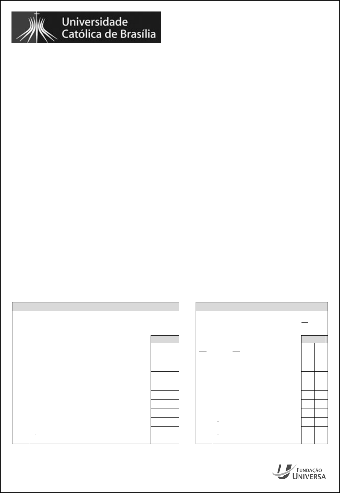 VESTIBULAR 2/2013 LÍNGUA PORTUGUESA, CONHECIMENTOS GERAIS, MATEMÁTICA, CIÊNCIAS E REDAÇÃO LEIA COM ATENÇÃO AS INSTRUÇÕES A SEGUIR. Aguarde a ordem do chefe de sala para abrir este caderno de provas. Ao iniciar, verifique se este caderno contém 30 (trinta) questões e duas propostas do tema de redação. Verifique, também, na folha de respostas, se as informações relativas a você estão corretas. Caso haja falha de impressão em seu caderno de provas e(ou) haja algum dado a ser retificado em sua folha de respostas, solicite ao chefe de sala que tome as providências cabíveis. A folha de respostas não pode ser dobrada, amassada, rasurada, manchada ou conter qualquer registro fora dos locais destinados às respostas. Você dispõe de 4 (quatro) horas para fazer as provas objetivas e a redação. Controle o tempo, pois não haverá prorrogação desse prazo. Na duração das provas, está incluído o tempo destinado à entrega do material, à identificação – que será feita no decorrer das provas – e ao preenchimento da folha de respostas e da folha de redação. Não se esqueça, ao término das provas, de devolver, devidamente preenchidas, a folha de respostas e a folha de redação. Somente será permitido levar este caderno de provas após 3 (três) horas e 30 (trinta) minutos do início das provas. Nas questões do tipo A, marque na folha de respostas, na coluna com o código V, o campo correspondente, caso julgue o item VERDADEIRO; ou na coluna com o código F, o campo correspondente, caso julgue o item FALSO. Nas questões do tipo B, marque na folha de respostas, na coluna com o código V (primeira coluna), o algarismo da dezena; e na coluna com o código F (segunda coluna), o algarismo da unidade. Para marcar corretamente o campo na folha de respostas, cubra, fortemente, com caneta esferográfica azul ou preta, o espaço a ele correspondente. Para sua orientação, veja, nos exemplos a seguir, como marcar as questões tipo A e tipo B. Exemplo de questão Tipo A Exemplo de questão Tipo B A cidade de Brasília, inaugurada em 21 de abril de 1960, destaca-se entre as demais por diversos motivos. Com base nessa afirmação, julgue os itens a seguir. Na equação seguinte, determine o valor de x: 01 10 2 =−x . Resolução: 0.( ) Cidade de estilo arquitetônico diferente das demais capitais brasileiras. V F V F z b z b 1.( ) Capital mais populosa do Estado Brasileiro. c z 5 1021 10 201 10 2 =⇒ =⇒=⇒=− x xxx c c d z Resposta: 05 d d 2.( ) A cidade brasileira com maiores problemas de poluição. z e e e f f f f 3.( ) A cidade onde está a sede do Poder Executivo Federal. g g g z h h h h Obs. 1a COLUNA – Marcação do item – VERDADEIRO i i Obs. 1a COLUNA – DEZENAS i i j j j j 2a COLUNA – Marcação do item – FALSO k k 2a COLUNA – UNIDADES k k Realização: A pl ic aç ão : 5 /5 /2 01 3 Universidade Católica de Brasília Pró-Reitoria de Graduação FUNDAÇÃO UNIVERSA | UCB VESTIBULAR 2/2013 1 LÍNGUA PORTUGUESA Texto para responder às questões de 1 a 3. 1 4 7 10 13 16 19 22 25 28 É verdade que o conceito de arte foi mistificado e houve época mesmo em que a habilidade técnica era tida como arte. Mas tudo isso foi posto abaixo pelos verdadeiros artistas. Aliás, a revolução estética, que marcou o início da arte moderna, consistiu precisamente em repelir essa falsa concepção de arte. Picasso disse certa vez: “Estou pintando uma tela, vou pôr ali um azul; se não tenho azul, ponho um verde”. Essa frase, que pode parecer uma piada, é de fato a desmistificação da atividade artística. O que ele disse, de fato, foi que a criação artística nasce de um jogo de acaso e necessidade. É que, ao iniciar o quadro, a tela está em branco, tudo ali pode acontecer, mas, desde o momento em que se lança a primeira pincelada, reduz-se a probabilidade e começa o processo que irá tornando necessário o que era mero acaso. Isso porque a pintura é uma linguagem, com leis e exigências, que não estão escritas, em função das quais a obra ganha coerência e significação. Expressão, em princípio, tudo é, já que o que existe expressa algo, tem um significado, seja um gato, uma pedra, uma mancha na parede. Mas são diferentes o significado natural que cada coisa tem e o significado criado pelo músico ao trabalhar a linguagem musical, pelo poeta ao trabalhar a linguagem literária, pelo pintor ao trabalhar a linguagem pictórica. Em suma, ainda que você admita que pôr casais nus num museu expresse algo, não negará que aqueles casais não são obra de nenhum artista como os quadros que estão ali nas paredes. Qualquer pessoa que tenha um mínimo conhecimento de arte sabe que a expressividade de uma obra artística é resultado da capacidade do autor de lidar com os elementos constitutivos de sua linguagem: a linha, a forma, as cores, a matéria pictórica, incutindo-lhes uma significação que só existirá ali. Exemplo: a noite estrelada que Van Gogh pintou é uma invenção única dele que a linguagem da arte possibilita. Não é simplesmente uma ideia, mas o produto de uma ação manual, técnica e semântica no âmbito de um universo linguístico chamado pintura. É diferente de simplesmente ter uma ideia, cuja criação em nada depende de você ter ou não capacidade técnica de realizá-la ou o domínio de uma linguagem, qualquer que seja. O artista conceitual não precisa saber fazer, não precisa fazer e, como não possui linguagem, usa o que já existe e que não foi ele quem fez. De onde vem então o significado do que não foi feito? A significação de uma coisa, um corpo, um objeto, decorre de sua inserção no sistema simbólico humano. Por exemplo, estar nu em um museu tem significação diferente de estar nu em seu quarto. A diferença óbvia é que o museu é um lugar público, o que torna a nudez chocante. Então, pergunto, por que ficar nu no museu é obra de arte e, no quarto, não? A resposta óbvia é que, para torna