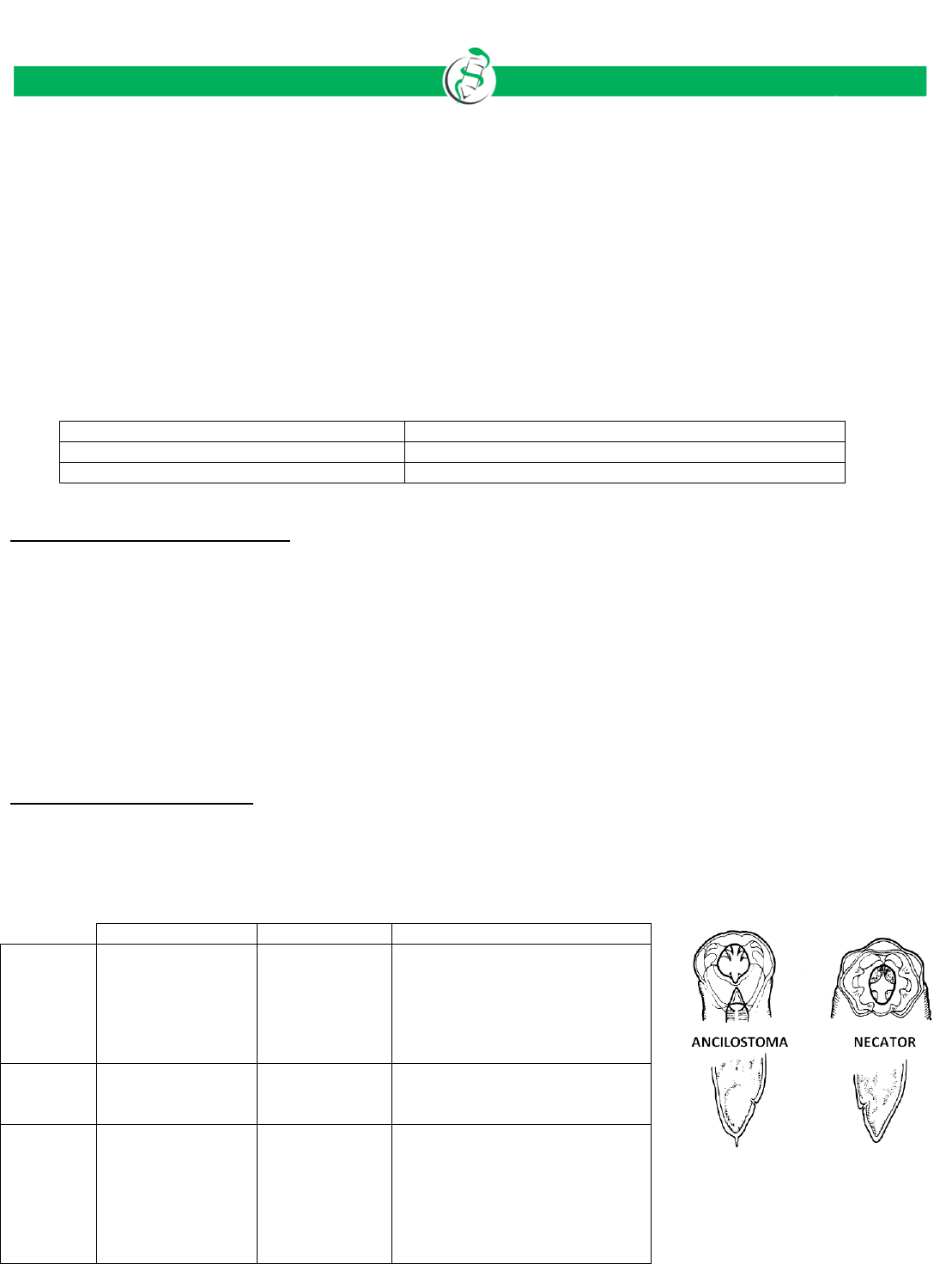 Arlindo Ugulino Netto ● MEDRESUMOS 2016 ● MAD I 94 www.medresumos.com.br PARASITOLOGIA: ANCILOSTOMOSE A ancilostomose, também conhecida por amarelão (devido aos quadros de anemia apresentados pelo paciente), é uma doença causada por vermes nematódeos (espécie: Necator americanus e Ancylostoma duodenale). As formas adultas desses parasitas se instalam no aparelho digestivo dos seres humanos, onde ficam fixadas na porção que compreende o intestino delgado, nutrindo-se de sangue do hospedeiro e causando anemia. Ancylostomidae é uma das mais importantes famílias de Nematoda cujos estágios parasitários ocorrem em mamíferos, inclusive em humanos, causando ancilostomose. Dentre mais de 100 espécies de Ancylostomidae descritas, apenas três são agentes etiológicos das ancilosmoses humanas: Ancylostoma duodenale (Dubini, 1843), Necator americanus (Stiles, 1902) e Ancylostoma ceylanicum (Loss, 1911). As duas primeiras espécies são os principais ancilostomatídeos de humanos, e só completam seus ciclos de vida neste hospedeiro. OBS 1 : Outras espécies de ancilostomídeos também muito conhecidas são aquelas denominadas como “larva migrans cutânea”: A. caninum e A. braziliense (este, conhecido como “bicho geográfico”), porém estes são espécies parasitárias de cães e gatos. Ancilostomíase (amarelão) Larva Migrans Cutânea A. doudenale (2 pares de dentes) A. caninum (3 pares de dentes) N. americanus A. braziliense ou bicho geográfico (1 par de dentes) CLASSIFICAÇÃO Filo: Aschelminthes Classe: Nematoda Família: Ancylostomidae. Gênero: Ancilostoma (apresentam dentes) e Necator (apresentam lâminas) Espécies: Ancylostoma duodenale Ancylostoma ceylanicum Ancylostoma braziliense (larva migrans cutânea) Ancylostoma caninum (larva migrans cutânea) Necator americanus MORFOLOGIA VERME ADULTO Os vermes adultos se diferenciam com relação a quantidade de dentes que apresentam: o A. caninum apresenta três pares de dentes, o A. duodenale apresenta dois pares de dentes e o A. braziliense, um par de dentes. Já o Necator americanus, ao invés de dentes, apresenta estruturas semelhantes a lâminas. Eis algumas das principais diferencias entre os vermes adultos do gênero ancilostoma e necator: Ancilostoma Necator Características Cápsula Bucal Presença de dentes Presença de Lâminas Estrutura localizada na região anterior do verme responsável por fixá-lo nos vasos sanguíneos para a realização de sua nutrição (sugando sangue). Fêmea Presença de processo espiniforme Ausência do processo espiniforme Macho - Apresentam bolsa copuladora mais larga - Gubernáculo Presente - Apresentam bolsa mais longa - Gubernáculo ausente. A bolsa copuladora é uma expansão localizada na porção posterior do verme. O gubernáculo é uma estrutura espinhosa (dotada de espículos) que auxilia o processo de copulação. Arlindo Ugulino Netto ● MEDRESUMOS 2016 ● MAD I 95 www.medresumos.com.br A. duodenale: Adultos machos e fêmeas cilindriformes, com a extremidade anterior curvada dorsalmente; cápsula bucal profunda, com dois pares de dentes ventrais na margem interna da boca, e um par de lancetas ou dentes triangulares subventrais no fundo da cápsula bucal. Em ambos os sexos, a cor é róseo-avermelhada, quando a fresco, e esbranquiçada, após mortos por soluções fixadoras. Machos medindo 8 a 11mm de comprimento por 400μm de largura; extremidade posterior com bolsa copuladora bem desenvolvida, gubernáculo bem evidente. Fêmeas com 10 a 18mm de comprimento por 600μm de largura; abertura genital (vulva) no terço posterior do corpo; extremidade posterior afilada, com um pequeno processo espiniforme terminal; ânus antes do final da cauda. N. americanus: Adultos de forma cilíndrica, com a extremidade cefálica bem recurvada dorsalmente; cápsula bucal profunda, com duas lâminas cortantes, semilunares, na margem interna da boca, de situação subventral, e duas outras lâminas cortantes na margem interna, subdorsal; fundo da cápsula bucal com um dente longo, ou cone dorsal, sustentando por uma placa subdorsal e duas lancetas (dentículos), triangulares, subventrais. Espécimes de coloração róseo-avermelhada (a fresco) e esbranquiçados (após fixação). Macho menor do que a fêmea, medindo 5 a 9mm de comprimento por 300pm de largura; bolsa copuladora bem desenvolvida, com lobo dorsal simétrico aos dois laterais; gubernáculo ausente. Fêmeas medem 9 a 11mm de comprimento por 3 5 0 μm de largura, com abertura genital próxima ao terço anterior do corpo; extremidade posterior afilada, sem processo espiniforme terminal; ânus antes do final da cauda. OVOS Os ovos da família Ancylostomidae apresentam uma membrana delgada envolvendo o seu conteúdo. No seu interior, encontramos células em divisão denominadas de blastômeros. Mesmo com a presença dessa fina membrana, os ovos não se rompem no hospedeiro. Os ovos de todas as espécies da família de ancilostomídeos são morfologicamente iguais (tanto dos parasitas humanos quanto dos parasitas animais), sem ser possível determinar, por meio de um exame laboratorial com amostras de ovos, o gênero do parasita que acometeu o paciente. No resultado do exame parasitológico, deve estar explícito: “ovos de Ancylostomidae”. LARVAS As larvas rabditoides (L1 e L2) apresentam um vestíbulo bucal longo, apresenta esôfago rudimentar (com corpo, istmo e bulbo posterior), o que determina ser um esôfago rabditoide. Já as larvas filarioides (L3), caracterizadas por serem as larvas infectantes e apresentarem uma bainha de revestimento, apresentam um vestíbulo bucal longo mas com um esôfago mais desenvolvido (sem bulbo), o que o denomina como filarioide. Essas larvas são de vida livre, apresentando uma preferência especial pelo microambiente do solo: dependem diretamente da sua temperatura, umidade e reserva de nutrientes. Podem se locomover, movimentando-se no solo rapidamente quando em temperaturas de 35 a 40 o