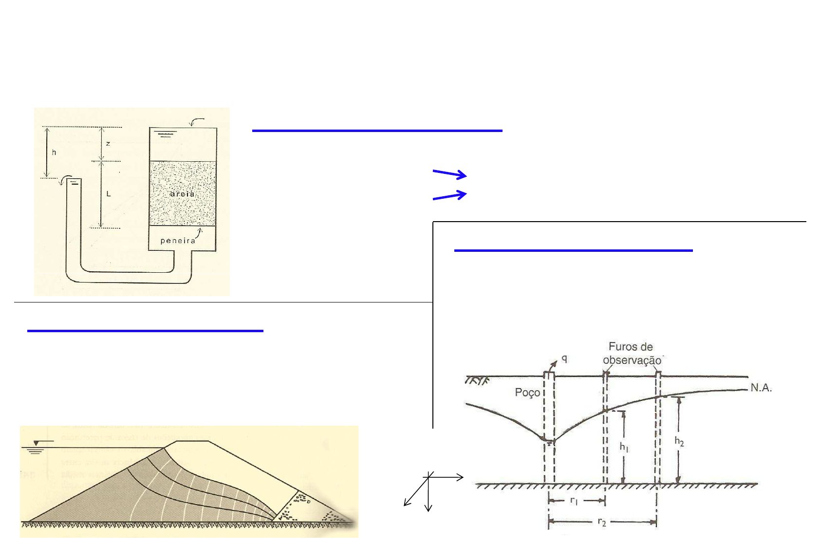 6 � Fluxo Bidimensional 6.1- Fluxos uni, bi e tridimensionais ▪ Fluxo unidimensional → o fluxo ocorre sempre em uma única direção. - direção de fluxo - gradiente são os mesmos em qualquer ponto da massa de solo ▪ Fluxo tridimensional → as partículas de água seguem caminhos ▪ Fluxo bidimensional → as partículas de água seguem caminhos curvos, mas em planos paralelos transversais ao eixo longitudinal da obra – consideração mais frequente. barragem de terra partículas de água seguem caminhos curvos, tendo componentes de deslocamento nas três direções ortogonais. bombeamento em poçosx z y 6.2- Redes de fluxo 6.2.1 - Rede de fluxo unidimensional 8 Rede de fluxo: representação gráfica dos caminhos percorridos pela água e da dissipação da carga hidráulica total ao longo deste caminho. medidas em cm 1 solo 6.2- Redes de fluxo 6.2.1 - Rede de fluxo unidimensional 8 medidas em cm Htotal,A = 0 + 20cm = 20cm Htotal,B = 12 + 2cm = 14cm h = H - H = 6cm (dissipada ao longo de 12cm) Rede de fluxo: representação gráfica dos caminhos percorridos pela água e da dissipação da carga hidráulica total ao longo deste caminho. solo h = Htotal, A - Htotal,B = 6cm (dissipada ao longo de 12cm) i = 6/12 = 0,5 Q = k x i x A = 0,05 x 0,5 x 8 x 1 Q = 0,2 cm3/s A B � � k = 5 x 10-2 cm/s p.r. 6.2- Redes de fluxo 6.2.1 - Rede de fluxo unidimensional 8 medidas em cm Htotal,A = 0 + 20cm = 20cm Htotal,B = 12 + 2cm = 14cm h = H - H = 6cm (dissipada ao longo de 12cm) Rede de fluxo: representação gráfica dos caminhos percorridos pela água e da dissipação da carga hidráulica total ao longo deste caminho. h = Htotal, A - Htotal,B = 6cm (dissipada ao longo de 12cm) i = 6/12 = 0,5 Q = k x i x A = 0,05 x 0,5 x 8 x 1 Q = 0,2 cm3/s A B � caminho percorrido pela água → a gota que penetra na face inferior se dirige à face superior segundo uma linha reta → LINHA DE FLUXO LINHAS DE FLUXO → determinam canais de fluxo de mesmo q. No caso 1D, canais com a mesma largura.k = 5 x 10-2 cm/s Q / 4 Q / 4 Q / 4 Q / 4 � � p.r. � dissipação da carga ao longo do caminho da água H=a+L+b ∆H ao longo da areia: Lembrando... H=a+L+b+h ∆H ao longo da areia: ∆H = (a+L+b+h)-(a+L+b) ∆H = h ⇒ fluxo ∆H ≠ 0 8 medidas em cm � dissipação da carga ao longo do caminho da água - qualquer ponto da face inferior tem a mesma HTA : LINHA EQUIPOTENCIAL - qualquer ponto da face superior tem a mesma HTB : LINHA EQUIPOTENCIAL - A dissipação de h = 6cm ocorre linearmente ao longo da linha de fluxo entre A e B. Ex: ao longo de uma linha horizontal a 2cm da face 2 h = 6cm A B 2 2 2 2 2 k = 5 x 10-2 cm/s Ex: ao longo de uma linha horizontal a 2cm da face inferior ocorreu uma perda de carga de (6/12 = perda de carga de 0,5cm por cada cm de percolação): ⇒ em 2cm de percolação: perda de carga de (6/12)x2 = 1cm No caso de fluxo unidimensional vertical ⇒ qualquer linha horizontal é uma LINHA EQUIPOTENCIAL 2cm � � 8 medidas em cm � dissipação da carga ao longo do caminho da água - qualquer ponto da face inferior tem a mesma HTA : LINHA EQUIPOTENCIAL - qualquer ponto da face superior tem a mesma HTB : LINHA EQUIPOTENCIAL - A dissipação de h = 6cm ocorre linearmente ao longo da linha de fluxo entre A e B. Ex: ao longo de uma linha horizontal a 2cm da face 4 h = 6cm A B 2 2 2 2 2 k = 5 x 10-2 cm/s Ex: ao longo de uma linha horizontal a 2cm da face inferior ocorreu uma perda de carga de (6/12 = perda de carga de 0,5cm por cada cm de percolação): ⇒ em 2cm de percolação: perda de carga de (6/12)x2 = 1cm � � No caso de fluxo unidimensional vertical ⇒ qualquer linha horizontal é uma LINHA EQUIPOTENCIAL 2cm 8 medidas em cm � LINHAS DE FLUXO: determinam canais de fluxo com o mesmo q ⇒ linhas igualmente espaçadas no caso 1D REDE DE FLUXO � LINHAS EQUIPOTENCIAIS: apresentam a mesma HT; determinam faixas de perda de carga (∆h) de igual valor⇒ linhas igualmente espaçadas no caso 1D rede formada por retângulos Por conveniência matemática, procura-se construir uma rede formada por quadrados: a distância entre LEs é a mesma que entre LFs. LF LE l b k = 5 x 10-2 cm/s b=l 8 medidas em cm REDE DE FLUXO � LINHAS DE FLUXO: determinam canais de fluxo com o mesmo q ⇒ linhas igualmente espaçadas no caso 1D � LINHAS EQUIPOTENCIAIS: apresentam a mesma HT; determinam faixas de perda de carga (∆h) de igual valor⇒ linhas igualmente espaçadas no caso 1D rede formada por quadrados (b=l) LF LE - número de canais de fluxo: NF - número de faixas de perda de carga: ND - dimensões do quadrado: b = largura do canal de fluxo l = dist. entre equipotenciais l b k = 5 x 10-2 cm/s No ex.: NF=4 ;ND = 6; b=l=2cm medidas em cm Informações obtidas a partir do traçado de uma rede de fluxo: � Perda de carga entre equipotenciais: DN hh =∆ � Gradiente hidráulico: lN h l hi D ⋅ = ∆ = Por cada canal de fluxo: � Vazão: b lN hkAikq D ⋅ ⋅ == hkq =⇒ No exemplo: i = 6cm/(6X2cm) = 0,5 k = 5 x 10-2 cm/s LF LE DN hkq =⇒ Como todos os canais tem a mesma vazão: D F F N NhkQNqQ =⇒⋅= No exemplo: Q= 0,05x6x(4/6) = 0,2cm3/sl b � Poropressão: u =hP .γw hP = H – z ; H = Hi - ∆h.n No exemplo, em C: Hc=20-1x3=17cm⇒ uc= (0,17-0,06)xγw =1,1kPa � C vazão total: p.r. 6.2.2 - Rede de fluxo bidimensional Mesmo princípio da rede unidimensional linhas de fluxo determinam canais de igual vazão linhas equipotenciais determinam faixas de iguais perdas de carga Linhas - arco AC : i = 6/12 = 0,5 - arco BD : i = 6/24 = 0,25 - outras linhas: arcos concêntricos com diferentes i h medidas em cm Linhas de fluxo com diferentes i → para cada linha de fluxo o h é o mesmo ao longo do percurso da água, mas o comprimento do percurso (L) é diferente ⇒ diferentes i k = cte e sabe-se que v=ki Cada linha de fluxo tem uma velocidade diferente; qto menor o caminho de percolação (L), maior o i ⇒ maior a v. q q q q q linhas de fluxo determinam canais de fluxo com igual