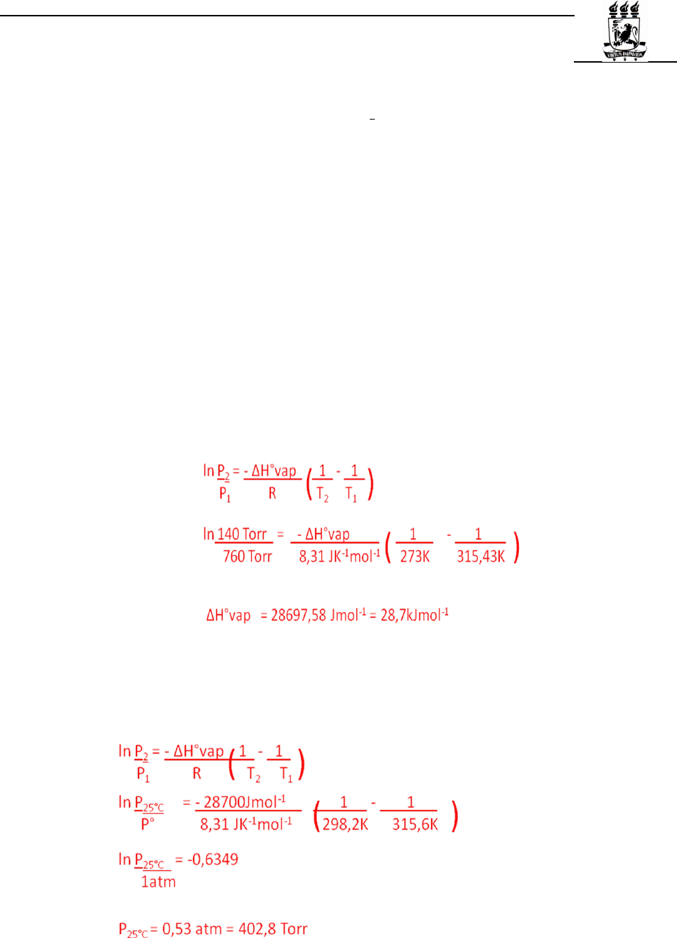 Departamento de Química Fundamental Universidade Federal de Pernambuco Química Geral 1 – 2009/I – 2a Prova– 07/05/2009 GABARITO 1. O ponto de ebulição normal do iodo-metano (CH3I) é 42,43°C e sua pressão de vapor a 0°C é 140 Torr. Calcule (a) a entalpia padrão de vaporização do iodo-metano e (b) a sua pressão de vapor a 25°C. R. Sabendo que no ponto normal de ebulição a pressão de vapor do líquido é 1 atm (Pvap = 1 atm= 1,01 bar) podemos encontrar o valor de ∆H°vap pois conhecemos 2 valores para Pvap e T: P1 = 140Torr e T1= 273K P2= 760Torr (1 atm) e T2 = (273 + 42,43) = 315,43K (b) 2. Calcule a energia livre da reação I2(g)→2I(g) a 1200K, sabendo que K=6,8. Se em um determinado momento, as pressões parciais de I2 e I são 0,13bar e 0,98bar, respectivamente, a reação ocorre em qual direção? (Justifique sua resposta). 17,124.19 120011314,8 86ln lnK logo e 0 equilíbrio no ln − −= °∆ −− °∆ −= °∆ −===∆+°∆=∆ molJrG KxKJmol rG),( RT rGKQrGQRTrGrG Para saber a direção da reação podemos: ( ) 4,7 )13,0( 298,0 2 2 == ° ° = P IP P IP Q Como Q > K devemos esperar que o equilíbrio seja descolado no sentido de regenerar os reagentes (formar I2) OU - Analisar o ∆Gr 17,843 )4,7ln()120011314,8(17,124.19 ln −+=∆ ×−−+−−=∆ +°∆=∆ JmolrG KKJmolJmolrG QRTrGrG Como ∆Gr >0 a reação não é espontânea. Ou seja, a direção espontânea do sistema é reação inversa (regeneração dos reagentes). 3. Uma mistura de 1,1 mmol de SO2 e 2,2mmol de O2 foi colocada em um reator de 250mL e aquecida até 500K. Após algum tempo a mistura atingiu o equilíbrio. Considerando a reação 2SO2(g) + O2(g) 2SO3(g), preveja se ocorrerá a formação de mais SO3 quando o sistema for resfriado até 298K. (a 500K, K=2,5 x 1010 e a 298 K, K= 4,0 x 1024) R. Para saber se haverá a formação de mais SO3 basta analisar os valores das constantes. Como K é maior a temperatura mais baixa, a esta T a formação de produtos é favorecida. Ou seja, reduzir a T de 500K para 298K leva a formação de mais SO3. 4. Uma solução aquosa de C6H5NH3Cl foi preparada dissolvendo-se 7,8g do sal para 350mL de solução. Determine a porcentagem de desprotonação do cátion. Antes de descobrir o pH, precisamos saber a concentração do sal [ ] M L gmol g V nClNHHC gmolClNHHCMM 172,0 35,0 15,129 8,7 356 15,129)356( = − == − = Em solução, o sal se dissociará conforme: C6H5NH3Cl (aq) + H2O(l) C6H5NH3+(aq) + Cl–(aq) C6H5NH3+ é um ácido conjugado relativamente forte (originado pela protonação de base fraca), por isso reagirá com H2O conforme: C6H5NH3+(aq) + H2O(l) C6H5NH2 (aq) + H3O+(aq) Utilizando uma tabela de equilíbrio, temos: C6H5NH3+(aq) + H2O(l) C6H5NH2 (aq) H3O+(aq) Início 0,172 0 0 variação – x + x + x equilíbrio 0,172 – x x x Para esta reação [ ] [ ] [ ] )172,0(103,2 1 11 5 356 2563 x xx M NHHC M NHHC M OH Ka − =×= × = − + + Como a Ka é pequeno, aproximamos : [C6H5NH3+]equilíbrio =[C6H5NH3+]inicial = 0,172M Como % desprotonação é menor que 5%, a aproximação : [C6H5NH3+]equilíbrio = [C6H5NH3+]inicial = 0,172 – x = 0,172M é válida. [ ] %16,1%100 172,0 31099,1%100 356 3 % 31099,12563 31099,1172,05103,25103,2 )172,0( =× −× =× + + = −×== + −×=⇒×−×=⇒−×= M M inicial NHHC OH çãodesprotona MNHHCOH xxxx 5. A fluoretação da água potável de uma cidade produz uma concentração de íons fluoreto (F-) próxima a 5 x 10-5 molL-1. Se a água da cidade for dura (rica em íons Ca+2), pode ocorrer a precipitação de CaF2. Qual a concentração máxima de íons Ca+2 que a água pode ter para que não ocorra a precipitação de CaF2. R. Para saber a concentração máxima de Ca+2 que não causa precipitação do CaF2, devemos analisar o equilíbrio (formação ↔ dissolução): CaF2(s) + H2O(l) Ca+2(aq) + 2F-(aq) ( ) ( ) ( ) [ ] [ ] [ ] [ ] [ ] ( ) [ ] 122 25 112 11 22 22 106,1 100,5 100,4 1 100,4 11 1 e 1 puro) solido ( 1 a 22 2 2 −−+ − −+ − −+ −+ ×= × × = ⇒×= × = = == × = −+ −+ LmolCa M Ca M F M CaK M Fa M Caaa a aa K PS FCaCaF CaF FCa PS Dados: Massa Molar (gmol-1): C=12, O=16, H=1, N=14, Cl=35,5, I= 126,9, S= 32 1 L.atm = 101,325 J R = 8,314 J.K-1.mol-1 = 0,082 L.atm.K-1.mol-1 1 atm = 1,01 bar= 760Torr Ka (C6H5NH3+) = 2,3 x 10-5; Kb(C6H5NH2) = 4,3 x10-10, Kps(CaF2) = 4,0 x 10-11 ∆ = ∆ +0 l nr rG G R T Q ; + - 14 3H O OH 1,0 10 ( 298 )wK a K − = = × ; 2 1 1 2 1 1l n K H K R T T ∆ ° = − l o gpX X= − ; ; 0 l nrG R T K∆ = − ; a b wK K K= , ( ) n cK RT K ∆ = 0 1P bar=
