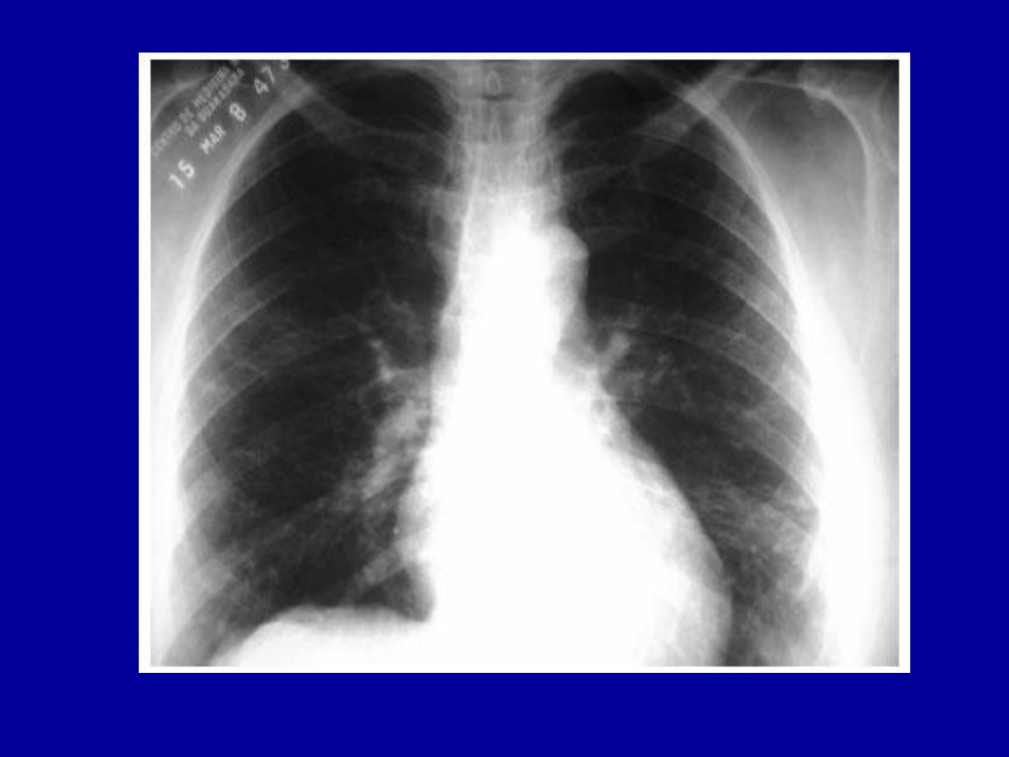 * Radiologia do Tórax * RADIOGRAFIAS DO TÓRAX INCIDÊNCIAS: FRONTAL (PA) PERFIL * TÓRAX * RADIOGRAFIAS AS RADIOGRAFIAS APRESENTAM “4” DENSIDADES BÁSICAS: AR: traquéia, pulmões, estômago, cólon GORDURA: planos adiposos ÁGUA: coração, aorta, músculos, fígado, baço OSSO: córtex óssea OUTROS MÉTODOS (TC, RM, US) >>> MAIOR AMPLITUDE DE DIFERENCIAÇÃO DE ESTRUTURAS US >>> LIMITAÇÕES >>> AR e OSSO * DIAFRAGMA SEPARAÇÃO ENTRE TÓRAX E ABDÔMEN DUAS HEMI-CÚPULAS DIAFRAGMA DIREITO MAIS ALTO * PULMÃO DIR. PULMÃO ESQ. MEDIASTINO CORAÇÃO FÍGADO ESTÔMAGO * DIAFRAGMA DIREITO ESQUERDO * CORAÇÃO DIAFRAGMA * PLEURAS E ESPAÇOS PLEURAIS NORMALMENTE, É POSSÍVEL VER OS ESPAÇOS PLEURAIS NAS RADIOGRAFIAS DO TÓRAX? RESPOSTA: NÃO * LEMBRAR: ESPAÇOS PLEURAIS TÊM TRÊS DIMENSÕES ENVOLVEM OS PULMÕES E SE ESTENDEM PELAS FISSURAS * Que ocorre nas lesões pleurais? Acúmulo de AR >>> pneumotórax Acúmulo de líquido >>> transudato e exsudato Proliferação celular >>> neoplasias, processo inflamatórios e infecciosos * LESÕES PLEURAIS: IMAGEM RX, US, TC, RM >>> MOSTRAM LESÕES PLEURAIS COMO SE APRESENTAM AS LESÕES PLEURAIS? PNEUMOTÓRAX >>> ACÚMULO DE AR DERRAMES E PROLIFERAÇÕES CELULARES >>> DENSIDADE DE PARTES MOLES (ÁGUA) * PNEUMOTÓRAX PULMÃO P AR * AR PULMÃO PARCIALMENTE COLABADO * DERRAME PLEURAL * OPACIDADE NA BASE HEMITÓRAX * LESÃO PLEURAL NÃO TEM PADRÃO DE LÍQUIDO LIVRE ALTERAÇÕES ENVOLVENDO OS PULMÕES O QUE FAZER? IMAGEM: TC OUTROS EXAMES: US, RM * HEMITÓRAX ESQUERDO NORMAL PULMÃO AERADO PLEURA E ESPAÇO PLEURAL NÃO-VISÍVEIS TC MOSTRA DENSIDADES QUE RX NÃO MOSTRA TECIDOS E ÓRGÃOS NORMAIS (VER CORAÇÃO E MÚSCULOS) HEMITÓRAX DIREITO ANORMAL DERRAME PLEURAL NÓDULOS PLEURAIS = INFILTRAÇÃO POR NEOPLASIA ATELECTASIA POR COMPRESSÃO DO LOBO INFERIOR DIREITO M M CORAÇÃO * DERRAME PLEURAL BILATERAL US MOSTRA: DERRAME À DIREITA ACUMULA-SE NAS PORÇÕES LATERAIS DO HEMITÓRAX CONCLUSÃO: DERRAME PLEURAL SEPTADO SEPTOS LOJAS COM ECOS HETEROGÊNEOS * IMAGEM DO PULMÃO DAS ESTRUTURAS PULMONARES, QUAIS PODEM SER VISTAS NOS EXAMES DE TÓRAX (RADIOGRAFIAS E TOMOGRAFIAS)? ARTÉRIAS E VEIAS PULMONARES BRÔNQUIOS DE MAIOR CALIBRE ALGUNS SEPTOS INTERLOBULARES (TC) DEMAIS ESTRUTURAS ESTÃO ABAIXO DA RESOLUÇÃO DOS EXAMES DE IMAGEM * OPACIDADES LINEARES = VASOS ESTRUTURAS DO MEDIASTINO E DA PAREDE TORÁCICA SE SOBREPÕEM AOS PULMÕES X X X X * HILOS PULMONARES QUAIS ESTRUTURAS COMPÕEM OS HILOS PULMONARES? VASOS PULMONARES BRÔNQUIOS LINFONODOS E VASOS LINFÁTICOS * APD APE * HILOS PULMONARES: ESQUERDO MAIS ALTO QUE DIREITO * DOENÇAS PULMONARES INFECÇÕES NEOPLASIAS DOENÇA PULMONAR OBSTRUTIVA CRÔNICA LESÕES DIFUSAS PULMONARES LESÕES DE GRANDES E PEQUENAS VIAS AÉREAS LESÕES VASCULARES DOENÇAS CONGÊNICAS ANOMALIAS DO DESENVOLVIMENTO * ??????? DOENÇAS X PADRÕES DE IMAGEM (RX – TC) * PADRÃO ALVEOLAR O QUE OCORRE? AR DOS ALVÉOLOS SUBSTITUÍDO POR OUTRO MATERIAL (LÍQUIDO, PROCESSO INFLAMATÓRIO / INFECCIOSO, NEOPLASIA) DENSIDADE DE AR >>> DENSIDADE DE ÁGUA IMAGEM: DESAPARECEM: VASOS E CONTORNOS DO DIAFRAGMA E MEDIASTINO APARECE: BRONCOGRAMAS AÉREOS (AR NO INTERIOR DOS BRÔNQUIOS) * PADRÃO ALVEOLAR A B A B PULMÃO NORMAL PADRÃO ALVEOLAR * SINAL DA SILHUETA PULMÃO PULMÃO MEDIASTINO * Broncogramas aéreos Margens Consolidações Sinal da silhueta * BRONCOGRAMAS AÉREOS OPACIDADE BASE PULMONAR DIREITA SINAL DA SILHUETA? POR QUÊ O CONTORNO DIREITO DO CORAÇÃO É VISÍVEL? DIAFRAGMA DIREITO INDEFINIDO RESPOSTA: DENSIDADE DE AR DO PULMÃO ADJACENTE AO CORAÇÃO * INCIDÊNCIA PA E PERFIL RADIOGRAFIAS TÊM APENAS 2 DIMENSÕES INCIDÊNCIAS ORTOGONAIS PERMITEM LOCALIZAR MAIS FACILMENTE AS LESÕES LOBO INFERIOR DIREITO * ATELECTASIA DEFINIÇÃO: PERDA DE VOLUME DE SEGMENTO, LOBO OU DE TODO UM PULMÃO CAUSAS: OBSTRUÇÃO BRÔNQUICA, COMPRESSÃO, PASSIVA (PNEUMOTÓRAX), RESTRITIVA (FIBROSE), POR ALTERAÇÃO DE SURFACTANTE * ATELECTASIA PULMÃO PULMÃO MEDIASTINO VASOS BRONCOGRAMAS AÉREOS ATELECTASIA SEM BRONCOGRAMA AÉREO = OBSTRUÇÃO BRÔNQUICA? * BRONCOBRAMAS AÉREOS PULMÃO DIREITO < ESQUERDO OPACIDADE DE PULMÃO DIREITO (LOBO SUPERIOR) DESVIO CISSURAL * NÓDULOS PULMONARES PULMÃO PULMÃO MEDIASTINO Até 3cm = NÓDULO >3cm = MASSA RX: NÓDULO PULMONAR SOLITÁRIO: INDICADA “TC” PARA SUA AVALIAÇÃO * MASSA PULMONAR MASSA? LEMBRAR DE NEOPLASIA QUAL MÉTODO DE IMAGEM FAZER A SEGUIR? TOMOGRAFIA COMPUTADORIZADA NEOPLASIAS RX = DIAGNÓSTICO TC = ESTADIAMENTO * NÓDULOS PULMONARES PULMÃO PULMÃO MEDIASTINO MÚLTIPLOS NÓDULOS: -NEOPLASIA METASTÁTICA -PROCESSOS INFECCIOSOS (GRANULOMAS, EMBOLIA SÉPTICA) RADIOGRAFIAS SIMPLES TOMOGRAFIA COMPUTADORIZADA: -ESTADIAMENTO DE NEOPLASIAS * MÚLTIPLOS NÓDULOS METÁSTASES DE SARCOMA * DOENÇAS DIFUSAS PULMONARES RADIOGRAFIAS: TEM LIMITAÇÕES PARA A CARACTERIZAÇÃO DESTAS LESÕES TC DE ALTA RESOLUÇÃO: DIAGNÓSTICO DIFERENCIAL CONTROLE EVOLUTIVO DEFINIR LOCAIS PARA BIÓPSIA * RADIOGRAFIA: INFILTRADO RETICULAR NA BASE E PERIFERIA PULMONAR * PADRÃO RETICULAR PADRÃO NODULAR * LESÕES HIPERTRANSPARENTES RADIOGRAFIAS: AVALIAÇÃO LIMITADA TCAR: TIPO DE LESÃO: ENFISEMA, DOENÇA DE PEQUENAS VIAS AÉREAS, ETC. EXTENSÃO DAS LESÕES * AUMENTO DE VOLUME DOS PULMÕES RETIFICAÇÃO DO DIAFRAGMA TRANSPARÊNCIA DO PARÊNQUIMA HILOS PULMONARES VASOS PULMONARES ENFISEMA PULMONAR RX: SINAIS INDIRETOS * BOLHA ENFISEMA PARA-SEPTAL ENFISEMA CENTROLOBULAR * BRONQUIECTASIAS DEFINIÇÃO: DILATAÇÃO BRÔNQUICA IRREVERSÍVEL RX: INESPECÍFICO TCAR: DIAGNÓSTICO EXTENSÃO * * * RADIOGRAFIAS CONTRASTE ENTRE PULMÃO E MEDIASTINO CONTORNOS MEDIASTINAIS DENSIDADES: ÁGUA, AR, GORDURA * LESÕES MEDIASTINAIS LESÕES CONGÊNITAS PROCESSOS INFLAMATÓRIOS E INFECCIOSOS LESÕES DEGENERATIVAS NEOPLASIAS PRIMÁRIAS E METASTÁTICAS LESÕES VASCULARES * RADIOGRAFIAS QUAIS ALTERAÇÕES PODEM SER VISTAS NAS RADIOGRAFIAS DE TÓRAX NAS LESÕES MEDIASTINAIS? ALTERAÇÕES DOS CONTORNOS DO MEDIASTINO DESVIO DA TRAQUEIA E BRÔNQUIOS DENSIDADES AN