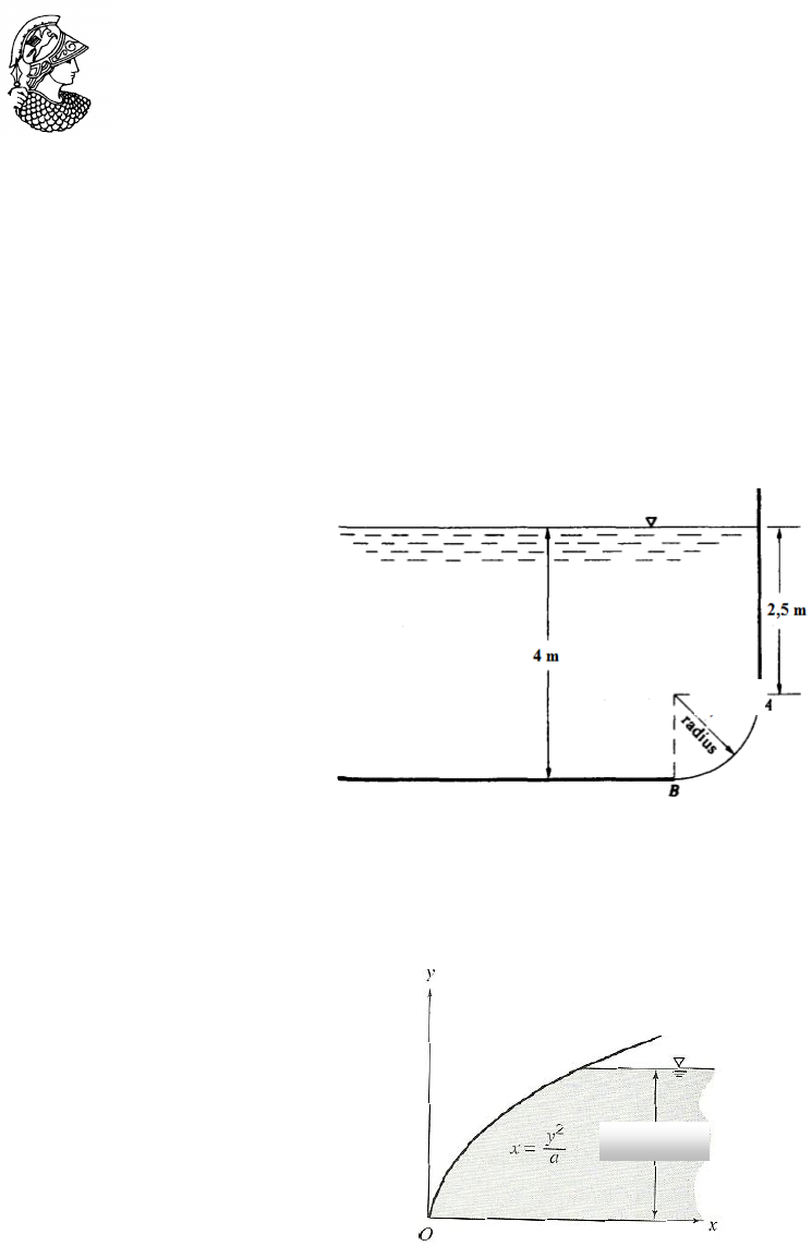 Universidade Federal do Rio de Janeiro Escola de Engenharia Departamento de Recursos Hídricos e Meio Ambiente Disciplina: MECÂNICA DOS FLUIDOS Turma: EC2 Professores: Susana Vinzon e Alessandra Monteiro Lista de Exercícios nº 3 A superfície curva, submersa, AB mostrada na figura abaixo é um quarto de um círculo de raio de 1,5 m. O comprimento do tanque (a distância perpendicular ao plano da figura) é de 2 m. Ache as componentes horizontal e vertical da força resultante agindo na superfície curva e suas localizações. (Resposta: FH=95,5 kN; FV=107,9 kN; x’ = 0,0883 m; y’=3,31 m) Considere a comporta mostrada na figura abaixo com largura w=4m, constante. A equação da superfície é x=y²/a, onde a=6m. A profundidade da água à direita da comporta é D=10m. Determine as componentes vertical e horizontal da força resultante devida a água e a linha de ação de cada uma. (Resposta: FH=1962 kN; FV=2180 kN; y’=3,33m; x’=5m) A comporta parabólica mostrada na figura tem 2 metros de largura e é articulada em O; c=0,25 m-1, D = 2m e H=3 m. Determine: O modulo e a linha de ação da força vertical sobre a comporta causada pela água; (R: FV=73,9kN; x’=1,06m) A força horizontal aplicada em A requerida para manter a comporta em equilíbrio; (R: FHA=34,8kN) A força vertical aplicada em A requerida para manter a comporta em equilíbrio. (R: FVA=30,2 kN) Uma barragem cilíndrica com diâmetro de 3m e comprimento de 6m. Determine o módulo e o sentido da força resultante da água agindo sobre a barragem. (Resposta:FR=370 kN; (= 57,6°) O perfil da seção reta de uma canoa é modelado pela curva y=ax², onde a = 3,89 m-1 e as coordenadas são medidas em metros. Suponha que a largura da canoa tenha valor w=0,6 m em todo o seu comprimento L=5,25 m. Estabeleça uma expressão algébrica geral, relacionando a massa total da canoa e seu conteúdo com a distância d entre a superfície da água e a borda da canoa. Calcule a massa total máxima para que a canoa não afunde. (Resposta: M=(4/3)*((L)*(H-d)3/2/(a1/2). Se d=0, M=734 kg, o que não garante que a canoa não afunde. Se d=0,05m, M=583 kg perceba que o risco é menor. Portanto, a resposta depende claramente do risco permitido de afundar). 1,5m D = 10 m
