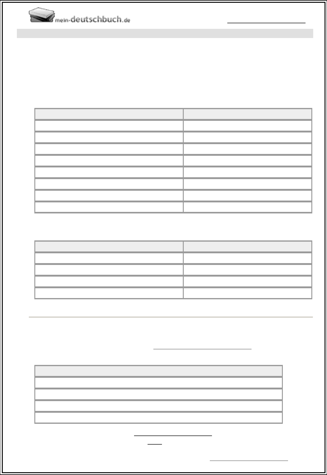 ONLINE - GRAMMATIK http://www.mein-deutschbuch.de Dieses Arbeitsblatt ist urheberrechtlich geschützt Quelle: http://www.mein-deutschbuch.de Temporalsätze mit „bis“ 1) Was man über Temporalsätze mit „bis“ wissen sollte. Temporalsätze mit "bis" drücken eine Gleichzeitigkeit zweier Handlungen aus. Der Hauptsatz gibt eine laufende Handlung an. Der Nebensatz gibt ein zweites Geschehen an und definiert zeitgleich einen Endpunkt beider Handlungen. Das Fragewort lautet "Bis wann?". Hauptsatz + Nebensatz Hauptsatz Nebensatz Bis wann haben seine Eltern ihn finanziell unterstützt? Seine Eltern haben ihn finanziell unterstützt, bis er seine Doktorarbeit geschrieben hat. Bis wann hast du in Münster gewohnt? Ich habe in Münster gewohnt, bis ich geheiratet habe. Bis wann sollen Kinder bei ihren Eltern wohnen? Kinder sollen bei ihren Eltern wohnen, bis sie finanziell unabhängig sind. Bis wann hat das Freibad geöffnet? Das Freibad hat geöffnet, bis die Badesaison zu Ende geht. Nebensatz + Hauptsatz Nebensatz Hauptsatz Bis Hans seine Doktorarbeit geschrieben hat, haben ihn seine Eltern finanziell unterstützt. Bis ich geheiratet habe, habe ich in Münster gewohnt. Bis die Kinder finanziell unabhängig sind, sollen sie bei ihren Eltern wohnen. Bis die Badesaison zu Ende geht, hat das Freibad geöffnet. 2) Nominalisierung Eine temporale Angabe kann auch mit einer Präposition-Nomen-Konstruktionen formuliert werden. Die passende Präposition lautetet: "bis zu": Hauptsatz mit einer Präposition-Nomen-Konstruktion als temporale Angabe Die Eltern von Hans haben ihn bis zu seiner Doktorarbeit finanziell unterstützt. Bis zu meiner Hochzeit habe ich in Münster gewohnt. Bis zur finanziellen Unabhängigkeit sollen die Kinder bei ihren Eltern wohnen. Bis zum Ende der Badesaison hat das Freibad bis 20:00 Uhr geöffnet. • Nominale Angaben können auf Position 1 oder im Mittelfeld stehen. 1 • Die Präposition "bis (zu)" verlangt den Dativ. ONLINE - GRAMMATIK http://www.mein-deutschbuch.de Dieses Arbeitsblatt ist urheberrechtlich geschützt Quelle: http://www.mein-deutschbuch.de 3) Temporale Adverbien Im Kapitel "Satzverbindende Adverbien" haben wir gelernt, dass auch Adverbien Sätze verknüpfen können. Satzverbindende Adverbien verbinden einen Hauptsatz mit einem Hauptsatz: • Verbalstil = Hauptsatz + Nebensatz oder Nebensatz + Hauptsatz • Nominalstil = Hauptsatz. • Satzverbindendes Adverb = Hauptsatz + Hauptsatz. Eine temporale Aussage kann mit dem temporalen Adverb "bis dahin" wiedergegeben werden. Es wird auf Position 1 oder 3 gestellt. Das Adverb verlangt eine inverse Satzstruktur. Hauptsatz 2 Hauptsatz 1 Position 1 Verb Mittelfeld Verb 2 Hans hat seine Doktorarbeit geschrieben. Bis dahin haben ihn seine Eltern finanziell unterstützt. Im September 2003 habe ich geheiratet. Ich habe bis dahin in Münster gewohnt. Die Kinder werden bald finanziell unabhängig. Bis dahin sollen sie bei den Eltern wohnen bleiben. Im September geht die Badesaison zu Ende. Bis dahin bleibt das Freibad bis 20:00 Uhr geöffnet. verbal / nominal NS / HS Bis die Badesaison zu Ende geht, bleibt das Freibad geöffnet. HS / NS Das Freibad bleibt geöffnet, bis die Badesaison zu Ende geht. HS Bis zum Ende der Badesaison bleibt das Freibad geöffnet. 4) Übersicht verbal nominal Konjunktionen Adverbien / invers Präpositionen bis (HS + NS / NS + HS) bis dahin (HS + HS) Position 1 oder 3 bis zu (+ Dativ) 2 1\) Was man über Temporalsätze mit „bis� Hauptsatz + Nebensatz Nebensatz + Hauptsatz 2) Nominalisierung 3) Temporale Adverbien 4\) Übersicht