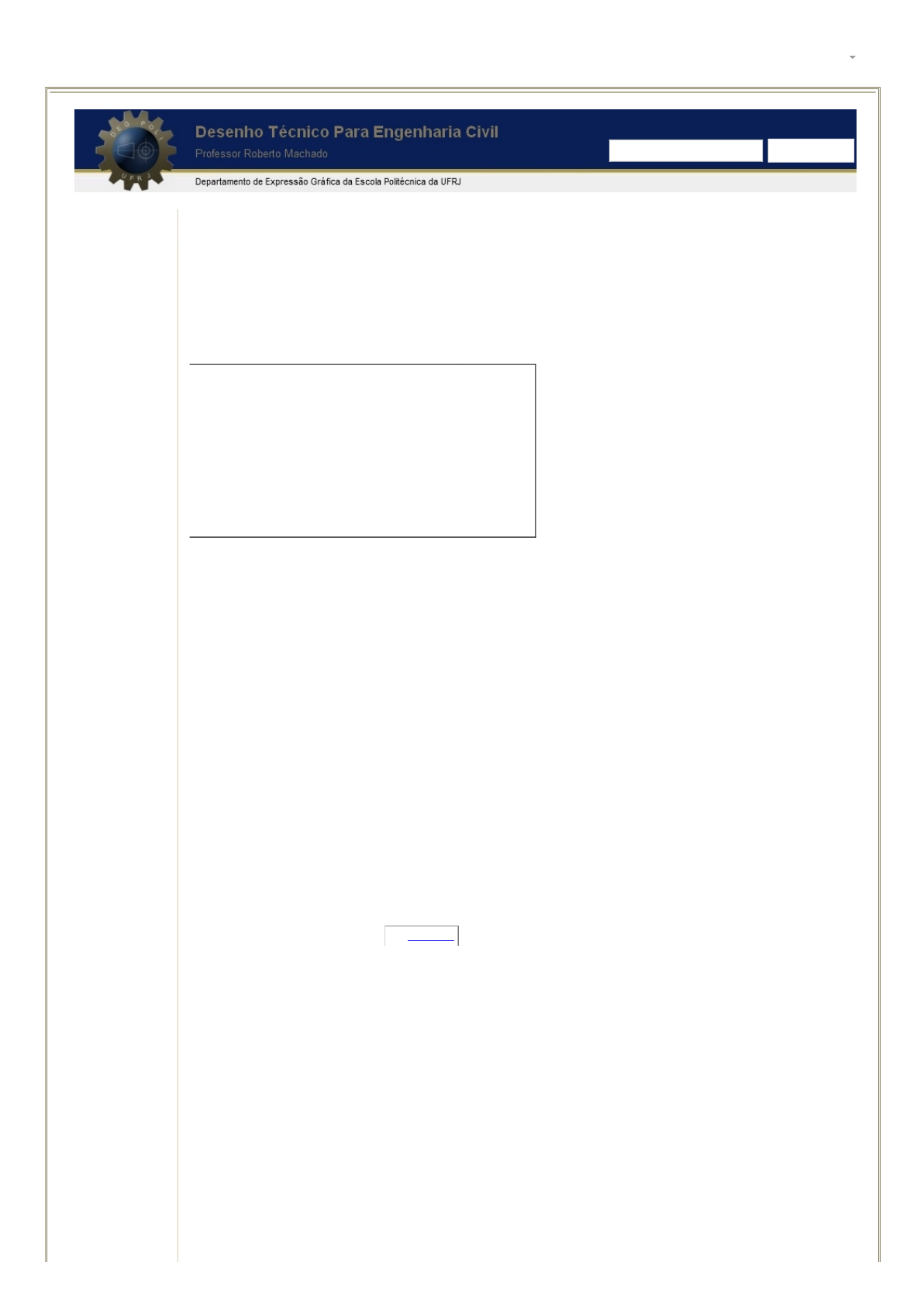03/03/2015 Critérios de Avaliação Desenho Técnico Engenharia Civil https://sites.google.com/a/poli.ufrj.br/desenhotecnicoparaengenhariacivil/criteriodeavaliacao 1/2 Navegação Página inicial Informações Programa de Aulas Material Didático Referências Bibliográficas Horário de Monitoria Quadro de Avisos Critérios de Avaliação Notas e Médias dos Alunos Código Disciplinar da UFRJ Contatos Sitemap Critérios de Avaliação 1. Avaliação 1.1. O aluno deverá fazer 10 trabalhos. As notas dos trabalhos são números inteiros e varia de zero a dez. 1.2. Cada trabalho tem o mesmo peso na média semestral. Portanto, a média semestral é a soma das notas dos 10 trabalhos dividida por 10. 1.3. Os trabalhos e suas respectivas aulas de entrega são: Trabalhos T1 – Superfícies Topográficas, Corte e Aterro T2 – Perspectiva Cônica T3 – Desenho de Arquitetura T4 – Desenho de Estrutura de Concreto Armado T5 – Desenho de Fundações e Locação T6 – Desenho de Estrutura de Madeira T7 – Desenho de Estrutura Metálica T8 – Desenho de Instalações Hidráulicas água T9 – Desenho de Instalações Hidráulicas esgoto T10 – Desenho de Instalações Elétricas entrega aula 3 aula 4 aula 6 aula 8 aula 9 aula 10 aula 11 aula 12 aula 13 aula 14 1.4. Os trabalhos do aluno são corrigidos pelo professor e a avaliação é feita pela Banca da disciplina para garantir isonomia entre todas as turmas. 2. Entrega dos trabalhos 2.1. A entrega dos trabalhos deverá ser feita até 15 minutos depois do início previsto da aula. 2.2. Os trabalhos só podem ser entregues até um dia útil antes da prova final, no horário de expediente, para que sejam considerados no cálculo da média semestral, assim sendo: 2.2.1. os trabalhos entregues com mais de 15 minutos de atraso no dia, serão descontados de 1 ponto na nota do mesmo. 2.2.2. os trabalhos entregues com 1 dia útil de atraso serão descontados de 2 pontos da nota do mesmo. 2.2.3. os trabalhos entregues com 2 dias úteis de atraso serão descontados de 3 pontos da nota do mesmo. 2.2.4. os trabalhos entregues com 3 dias úteis de atraso serão descontados de 4 pontos da nota do mesmo. 2.2.5. os trabalhos entregues com 4 dias úteis de atraso serão descontados de 5 pontos da nota do mesmo. 2.2.6. os trabalhos entregues com 5 dias úteis de atraso serão descontados de 6 pontos da nota do mesmo. 2.2.7. os trabalhos entregues com 6 dias úteis de atraso serão descontados de 7 pontos da nota do mesmo. 2.2.8. os trabalhos entregues com 7 dias úteis de atraso serão descontados de 8 pontos da nota do mesmo. 2.2.9. os trabalhos entregues com 8 dias úteis de atraso serão descontados de 9 pontos da nota do mesmo. 2.2.10. os trabalhos entregues com 9 ou mais dias úteis de atraso serão descontados de 10 pontos da nota do mesmo. 3. Qualidade observada na apresentação dos trabalhos 3.1. Trabalhos com papel fora do padrão serão descontados de 1 ponto na nota do mesmo; 3.2. Trabalhos com erros de dobragem de papel serão descontados de 1 ponto na nota do mesmo; 3.3. Trabalhos com erros de margem de papel serão descontados de 1 ponto na nota do mesmo; 3.4. Trabalhos com erros de impressão serão descontados de 1 ponto na nota do mesmo; 3.5. Trabalhos com desenhos mal distribuídos no papel serão descontados de 1 ponto na nota do mesmo. 4. Qualidade observada nos desenhos 4.1 São considerados os seguintes aspectos na avaliação dos desenhos: espessuras de linha; tamanhos de fontes; cotas; outras representações estabelecidas nas normas técnicas da ABNT; organização e clareza para leitura e interpretação. 4.2 São descontados pontos por erros ou conjunto de pequenos erros. 4.3 A rigidez na avaliação dos desenhos é menor para alunos que fazem trabalhos individualmente, devido ao dobro de volume de trabalho. 5. Freqüencia 5.1. Cada aula possui três presenças, uma para cada tempo de aula. 5.2. Atraso de 15 minutos no primeiro tempo de aula implica em uma falta. 5.3. Atraso de 15 minutos no segundo tempo de aula implica em duas faltas. Pesquisar o site pcs@poli.ufrj.br Translate 03/03/2015 Critérios de Avaliação Desenho Técnico Engenharia Civil https://sites.google.com/a/poli.ufrj.br/desenhotecnicoparaengenhariacivil/criteriodeavaliacao 2/2 5.4. Atraso de 15 minutos no segundo tempo de aula implica em três faltas. 5.5. Deixar de freqüentar um tempo de aula implica em uma falta. Isso é válido para o aluno que sair mais cedo da aula sem justificar. 6. Aprovação Direta 6.1. O aluno será aprovado direto se média semestral for maior ou igual a 7,0 e ele tiver mais de 75% de presença em aulas. 6.2. Alunos que possuírem mais de 90% de presença em aulas e ficarem com média 6,8 ou 6,9 podem ser aprovados diretos, respectivamente, com essa média. 6.3. Alunos que tiverem ou refizerem os trabalhos T3, T4 e T5 com 90% de acerto e ficarem com média 6,8 ou 6,9 podem ser aprovados diretos, respectivamente, com essa média. 6.4. Na aprovação direta, a média final é igual a média semestral. 7. Reprovação Direta por Nota 7.1. Alunos que tiverem média semestral menor que 3,0 serão reprovados diretamente. 7.2. Na reprovação direta, a média final é igual a média semestral. 8. Reprovação por Falta Alunos que tiverem menos de 75% de presença em aula serão reprovados por falta. 9. Prova Final 9.1 Só poderão fazer prova final os alunos que tiverem mais de 75% de presença em aulas e média semestral maior ou igual a 3,0. 9.2. A prova final do aluno é corrigida e avaliada pela Banca da disciplina, com todos os professores presentes, para garantir isonomia entre todas as turmas. 9.3 Para os alunos que fizerem prova final, a média final será a soma da média semestral com a prova final, dividido por dois. 10. Aprovação com Prova Final 10.1 O aluno será aprovado com prova final se média final for maior ou igual a 5,0 e ele tiver mais de 75% de presença em aulas. 10.2 Alunos que possuírem mais de 90% de presenç