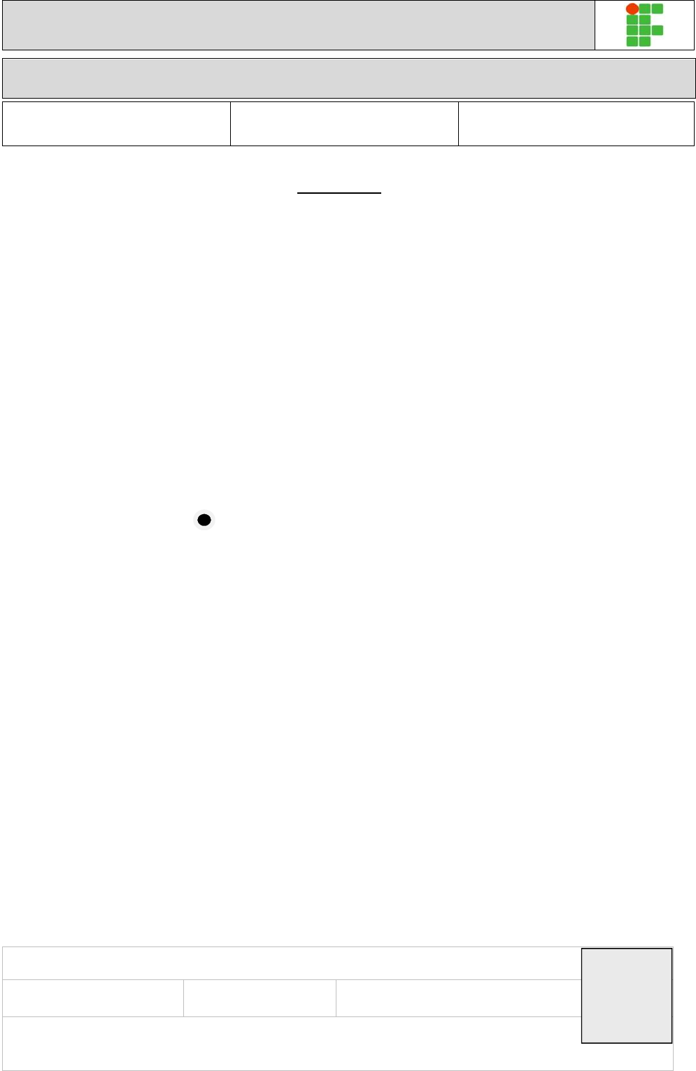 Instituto Federal de Educação, Ciência e Tecnologia de Pernambuco – IFPE EXAME DE SELEÇÃO / VESTIBULAR IFPE 2016 CURSOS SUPERIORES Redação Língua Portuguesa ....... de 01 a 10 Língua Estangeira ........ de 11 a 15 Matemática ....... de 16 a 25 Física ................ de 26 a 30 Química ............ de 31 a 35 Biologia........ de 36 a 40 História ....... de 41 a 45 Geografia.......de 46 a 50 DATA – 29/11/2015 (DOMINGO) ATENÇÃO 1. Leia todas as instruções antes de iniciar a prova. 2. Preencha seus dados pessoais. 3. Autorizado o início da prova, verifique se este caderno contém 2 (duas) propostas para a Redação, a folha de rascunho da Redação e 50 (cinquenta) questões conforme discriminação acima. Se não estiver completo, solicite imediatamente do fiscal da sala outro exemplar. Responda apenas às questões da Língua Estrangeira que você optou no ato da inscrição. 4. No texto da prova de Redação deverá ser observado os seguintes critérios: · Adequação ao tema proposto; · Adequação às normas gramaticais; · Coerência, coesão e clareza na exposição das ideias; · Atendimento ao número de linhas, mínimo de 20 e máximo de 25. 5. Será atribuída nota 0 (zero) na prova de Redação, se: · A folha de resposta da Redação estiver identificada por assinatura, rubrica ou qualquer outro identificador, bem como se for entregue em branco; · Houver fuga total a um dos temas propostos; · O candidato destacar o canhoto da parte superior da folha de Redação. 6. Ao receber a folha de respostas objetiva e a da Redação, confira o seu nome e o número de inscrição. Qualquer irregularidade, comunique imediatamente ao fiscal. 7. Para marcar a folha de respostas, utilize caneta esferográfica com tinta na cor preta ou azul e faça as marcas de acordo com o modelo: preencher assim 8. Marque apenas uma resposta para cada questão, pois só há uma única resposta correta. A questão que for marcada com mais de uma resposta, ou rasurada, será anulada. 9. Se a Comissão Organizadora do Exame de Seleção/Vestibular IFPE 2016 verificar que a resposta de uma questão é dúbia ou inexistente, a questão será posteriormente anulada e os pontos, a ela correspondentes, distribuídos entre as demais. 10. Não risque, não amasse, não dobre e não suje a folha de respostas. 11. Os fiscais não estão autorizados a emitir opinião nem prestar esclarecimentos sobre o conteúdo das provas. 12. O caderno de provas e a folha de respostas deverão ser devolvidos ao fiscal da sala. 13. A prova terá início às 9h00min e deverá ser concluída até as 13h00 min. Por razões de segurança do concurso, o candidato só poderá deixar o local de realização da aplicação das provas 1 (uma) hora após o seu início. 14. Os fiscais não estão autorizados a fazer retificações de qualquer natureza nas instruções ou enunciados de questões das provas. Apenas, e exclusivamente, o CHEFE DE PRÉDIO, pessoalmente, é que poderá comunicar alguma retificação. 15. O IFPE não se responsabilizará por objetos ou valores portados, esquecidos, danificados ou extraviados nas dependências dos locais de aplicação das provas. 16. Todos os materiais impressos, entregues aos candidatos no dia da prova, deverão ser devolvidos na íntegra, pois pertencem ao IFPE. 17. O gabarito oficial preliminar será divulgado 2 (duas) horas depois do encerramento das provas, no endereço eletrônico cvest.ifpe.edu.br. 18. Será facultado ao candidato apresentar recurso, devidamente fundamentado, relativo ao gabarito e/ou ao conteúdo das questões. O recurso deverá ser interposto no dia 30/11/2015 das 8h às 17h, dirigido à Comissão do Exame de Seleção/Vestibular IFPE 2016, e entregue no Campus do IFPE em que o candidato concorre à vaga, nos endereços constantes do item 7.3 do Manual do Candidato. Não será aceito recurso via postal, via fax ou correio eletrônico ou interposto por procurador. 19. A divulgação dos aprovados estará disponível a partir de 18/12/2015, no endereço eletrônico cvest.ifpe.edu.br. 20. Fique atento ao cronograma de matrícula. Impressão Digital NOME DO CANDIDATO: ______________________________________________________________ R.G. nº ________________ ÓRGÃO: ___________ INSCRIÇÃO nº __________________ ASSINATURA: __________________________________________________________________ PROPOSTAS PARA A REDAÇÃO Leia os textos que seguem e escolha uma das propostas para redigir um texto dissertativo-argumentativo em prosa. Defina seu ponto de vista e procure fundamentá-lo através de argumentos claros e consistentes. Crie um título e revise sua produção textual. Lembre-se de que os textos apresentados têm por finalidade fornecer subsídios para sua reflexão; não devem, portanto, ser copiados. A redação será avaliada pelos seguintes critérios: - adequação ao tema e ao gênero proposto; - organização, clareza e encadeamento das ideias; - coerência, nível de informatividade e de argumentação; - adequação à norma padrão da língua escrita; - obediência ao limite do número de linhas (mínimo de 20 e máximo de 25); - presença de título. PROPOSTA 01 - Redução da maioridade penal: solução para a diminuição da violência no Brasil? TEXTO 01 Disponível em: <http://www.crianca.mppr.mp.br/modules/conteudo/conteudo.php?conteudo=380>. Acesso em: 22 set. 2015. TEXTO 02 FÁBIO JOSÉ BUENO Promotor de Justiça do Departamento da Infância e Juventude de São Paulo "Eu sou favorável à redução da maioridade penal em relação a todos os crimes. Em 1940, o Brasil estipulou a maioridade em 18 anos. Antes disso, já foi 9 anos, já foi 14. Naquela época, os menores eram adolescentes abandonados que praticavam pequenos delitos. Não convinha punir esses menores como um adulto. Passaram-se 70 anos e hoje os menores não são mais os abandonados. O menor infrator, na sua maioria, é o adolescente que vem de família pobre, porém, não mise