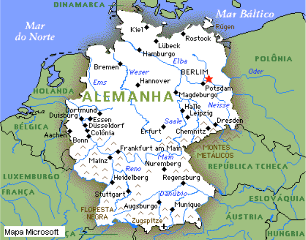 Alemanha, república federal localizada na Europa Central. Limita-se ao norte com o mar do Norte, a Dinamarca e o mar Báltico; ao leste com a Polônia e a República Tcheca; ao sul com a Áustria e a Suíça, e ao oeste com a França, Luxemburgo, Bélgica e os Países Baixos. É conhecida oficialmente como República Federal Alemã (RFA). Berlim é a capital e a cidade mais importante. Território e recursos Possui três grandes regiões fisiográficas: as terras baixas que conformam a planície do norte, com numerosos vales fluviais; a região das mesetas centrais que abrange um território de suaves montanhas, vales fluviais, rios e vales bem definidos; e as cadeias montanhosas que incluem as cordilheiras Eifel e Hunsrück, Taunus, Spessart e Fichtelgebirge. Os contrafortes do Jura e um grande bosque, a Selva Negra, estão no sudoeste. No extremo sul estão os Alpes bávaros. A maioria dos grandes rios alemães estão na região ocidental. O mais importante é o Reno e seus afluentes, Neckar e Ruhr. Outros rios importantes são Elba, Danúbio, Oder e Neisse. Dos poucos grandes lagos destaca-se o Constança. Possui um clima temperado, com uma temperatura média anual de 9 °C. As terras baixas do norte têm um clima um pouco mais quente que as regiões centrais e do sul. A precipitação é maior no sul, onde alcança cerca de 1.980 mm ao ano, a maioria em forma de neve. Aproximadamente 30% do território é formado por bosques compostos de pinheiros e outras coníferas e espécies de folhas caducas. População e governo A população possui dois grupos de raça caucásica: o alpino e o teutônico. Possui (1993) cerca de 80.767.591 habitantes, com uma densidade de 226 hab/km2. A capital da Alemanha, Berlim, possui uma população (1992) de 3.454.200 habitantes. Outras cidades importantes (segundo estimativas de 1990) são: Bonn (289.500 habitantes), Hamburgo (1.640.100 habitantes), Munique (1.219.600 habitantes), Colônia, Frankfurt am Main e Essen. O alemão é o idioma oficial e existem vários dialetos regionais. Cerca de 45% dos alemães são protestantes, em sua maioria luteranos. Quarenta por cento são católicos e 2% muçulmanos. Aproximadamente 30.000 judeus vivem hoje na Alemanha. O governo é baseado em uma Lei Fundamental promulgada em 1949 para a antiga RFA (Alemanha Ocidental), emendada em várias ocasiões. É um Estado federal democrático. De 1968 a 1989, a Alemanha Oriental se definia em sua constituição como um Estado socialista soberano. O poder residia no Partido da Unidade Socialista da Alemanha (SED). Com a unificação em 1990, a Lei Fundamental da RFA se ampliou ao novo Estado. Economia Apesar da grande destruição sofrida durante a II Guerra Mundial, a Alemanha ressurgiu na década de 1960. A reunificação foi um golpe muito duro; a Alemanha Ocidental tem suportado as custas das melhorias na infra-estrutura, no meio ambiente e na indústria da parte oriental, embora muitas empresas do Este tenham quebrado, a Alemanha continua sendo uma potência na economia mundial devido à forte competência da Alemanha Ocidental. A agricultura representa um papel pouco importante. Quase um terço dos alimentos consumidos são importados. As melhores terras para o cultivo se localizam no extremo sul das planícies setentrionais. Os principais cultivos são açúcar de beterraba, batatas e cereais. A Alemanha possui importantes indústrias relacionadas como a silvicultura e a pesca. Os bosques de coníferas tem sofrido os efeitos da chuva ácida. A Alemanha é o principal produtor de linhito do mundo e vários minerais são produzidos em quantidades importantes. O setor industrial domina a economia e produz uma grande variedade de artigos como: alimentos processados, maquinaria, produtos químicos, aparatos eletrônicos e equipamentos de transporte. A unidade monetária é o marco alemão. Em 1990 as moedas das duas Alemanhas se uniram. História Este artigo desenvolve a história da Alemanha antes de 1949 e depois de 1990. Para maiores detalhes sobre sua história entre 1949 e 1990, ver República Democrática Alemã e República Federal Alemã. Durante a idade da pedra, os bosques alemães estavam povoados por grupos de caçadores e coletores. Constituíam as formas primitivas do Homo sapiens, (Homem de Heidelberg que viveu há 400.000 anos). Aproximadamente em 2300 a.C. chegaram novas hordas de povos indo-europeus, antepassados dos germanos, que se instalaram no norte e no centro da Alemanha, os povos bálticos e os eslavos no leste e os celtas no sul e no oeste. De 1800 a 400 a.C., os povos celtas do sul da Alemanha e da Áustria desenvolveram progressos no trabalho com o metal, configurando várias culturas — campos de urnas, Hallstatt e La Tène — que se difundiram pela Europa. Entre os séculos II a.C. e V d.C. as tribos germânicas e celtas estiveram em contato com os romanos que controlavam o sul e o oeste da Europa e tentaram sem êxito estender seu domínio até o rio Elba. A fronteira se manteve nos rios Rin e Danúbio, onde erigiram os limes (linha de fortificações). Nos séculos IV e V os hunos assolaram o território a partir da Ásia e os ostrogodos, visigodos, vândalos, francos, lombardos e outras tribos germânicas invadiram o Império romano. No final do século V, o chefe dos francos, Clodoveu I, derrotou aos romanos e estabeleceu um reino que englobava a maior parte da Galia e o sudeste da Alemanha. Seu trabalho continuou no século VIII por Carlos Magno, que anexou o sul da Alemanha e submeteu os saxões. O Império carolíngio não sobreviveu e depois da morte de Carlos Magno foi dividido entre seus três netos (ver Tratado de Verdun de 843). Depois da morte do último monarca carolíngio, Oto I o Grande foi o primeiro rei saxão fortemente decidido a criar uma monarquia centralizada. Outorgou privilégios territoriais à Igreja, defendeu seu reino dos ataques exteriores e invadiu a Itália duas vezes. Durante 100 anos (1024-1125) os reis da