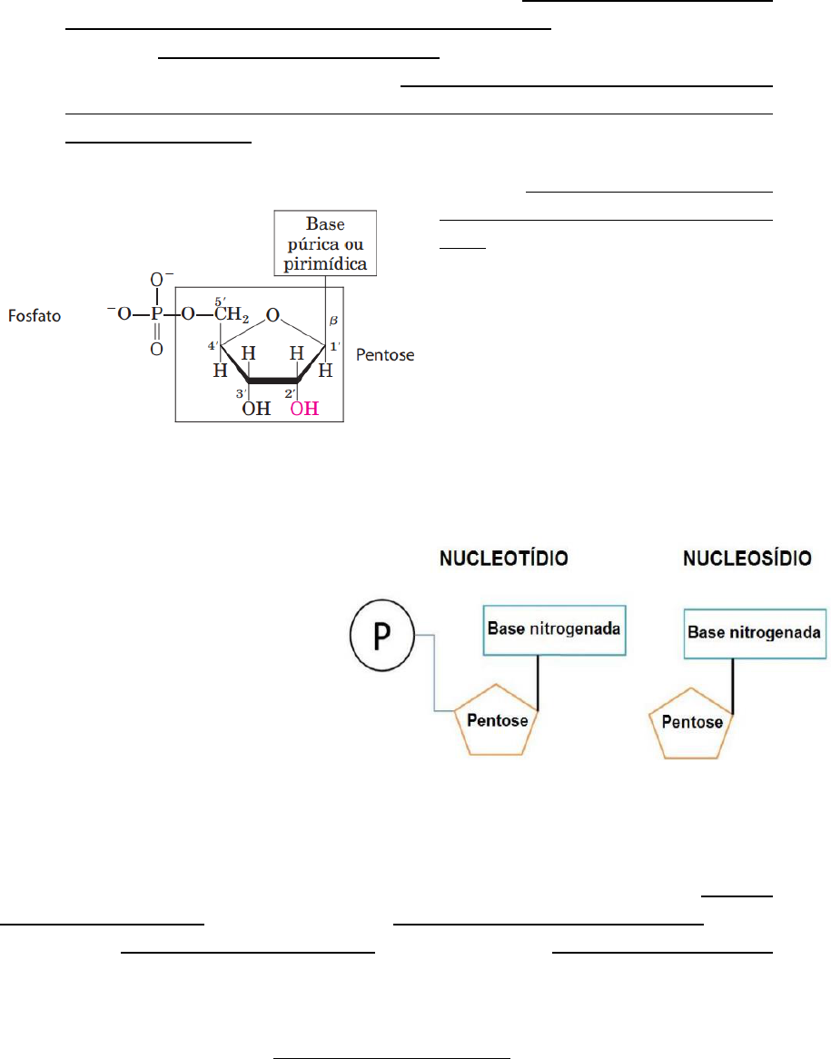 Aula 01 – Ácidos nucleicos, genes e genomas O que são ácidos nucleicos? São polinucleotídeos de ocorrência biológica onde as unidades (nucleotídeos) estão ligadas a uma sequência específica por ligações fosfodiéster (Lehninger). São longos polímeros que levam informações sob uma forma que pode ser transmitida de uma geração para a seguinte. São macromoléculas constituídas de um grande número de nucleotídeos ligados, cada um composto de uma pentose, um fosfato e uma base nitrogenada (nucleobase) (Stryer). Os nucleotídeos apresentam três componentes característicos: (1) uma base nitrogenada, (2) uma pentose e (3) um ou mais fosfatos (PO4). As bases nitrogenadas são derivadas de dois compostos relacionados, a pirimidina e a purina. O nucleotídeo é a unidade dos ácidos nucleicos. O composto formado apenas pelo açúcar e a base nitrogenada é denominado nucleosídio, e a presença do fosfato no DNA e RNA é importante para a formação do laço diéster. A base de um nucleotídeo é ligada covalentemente (no N-1 das pirimidinas e no N-9 das purinas) por uma ligação N-beta-glicosídica ao carbono 1’ da pentose, e o fosfato é esterificado no carbono 5’. Extremidade 5’ – PO4; Extremidade 3’ – OH. Tanto o DNA quanto o RNA contêm duas bases púricas principais, adenina (A) e guanina (G), e duas pirimídias. No DNA e no RNA, uma das pirimidinas é a citosina (C), mas a segunda pirimidina não é a mesma nos dois: é a timina (T) no DNA e a uracila (U) no RNA. O DNA organiza-se em uma fita dupla, enquanto o RNA é fita simples, podendo assim ser mais comprido e mais estável, e por isso ocorreu a mudança (na vida) de RNA para DNA. O DNA permitiu uma maior complexidade dos seres, possibilitando uma biblioteca genômica maior (mais condições de estocar genes que são mais complexos). Há mais guanina-citosina no DNA porque, uma vez que possuem mais ligações de hidrogênio, são mais estáveis. Os ácidos nucleicos têm dois tipos de pentoses. As recorrentes unidades desoxirribonucleotídicas do DNA e as unidades ribonucleotídicas do RNA, onde a mudança é a presença de um átomo de oxigênio a menos no DNA. É a pentose que define a identidade do ácido nucleico. Embora os nucleotídeos que contêm as principais purinas e pirimidinas sejam os mais comuns, o DNA e o RNA também contêm algumas bases secundárias. No DNA, as mais comuns delas são as formas metiladas das bases principais. Essas bases alteradas muitas vezes apresentam funções na regulação ou na proteção da informação genética. É por essas alterações que a quantidade de pares de base não bate 100%, podendo ter alguns porcentos a mais de citosina do que de guanina, por exemplo. Às vezes, a modificação é tanta que ocorre uma ligação anômala (por exemplo, uma nucleobase vinda da timina ligando-se com uma guanina). Os nucleotídeos consecutivos de ambos DNA e RNA são ligados covalentemente por “pontes” de grupo fosfato, nas quais o grupo 5’-fosfato de uma unidade nucleotídica é ligado ao grupo 3’-hidroxila do próximo nucleotídeo, criando uma ligação fosfodiéster. Estrutura dos ácidos nucleicos O DNA foi inicialmente isolado e caracterizado por Friedrich Miescher em 1868. Ele chamou a substância contentando fósforo de “nucleína”. Até os anos de 1940, com o trabalho de Avery, MacLeod e McCarty, não existia uma evidência convincente de que o DNA fosse o material genético. Avery e seus colegas descobriram que o DNA extraído de uma linhagem virulenta da bactéria Streptococcus pneumoniae e injetado em uma linhagem não virulenta da mesma bactéria transformava a linhagem não virulenta em virulenta. Eles concluíram que o DNA da linhagem virulenta carregava a informação genética para virulência. Então, em 1952, experimentos de Alfred D. Hershey e Martha Chase, que estudaram a infecção de células bacterianas por um bacteriófago, com DNA ou proteína marcados radioativamente, acabaram com qualquer dúvida remanescente de que o DNA, e não a proteína, portava a informação genética. 1. A composição de bases do DNA, em geral, varia de uma espécie para a outra; 2. Amostras de DNA isoladas de diferentes tecidos da mesma espécie têm a mesma composição de bases; 3. A composição de bases de DNA em uma dada espécie não muda com a idade do organismo, seu estado nutricional ou a mudança de ambiente; 4. Em todos os DNAs celulares, independentemente da espécie, o número de resíduos da adenosina é igual ao número de resíduos da timina, e o número de resíduos da guanosina é igual ao número de resíduos de citosina. Dessas correlações, conclui-se que a soma dos resíduos de pirimidina é igual ao à soma de resíduos de purina. Essas relações quantitativas, algumas vezes denominadas “regras de Chargaff”, foram confirmadas por muitos outros pesquisadores. James Watson e Francis Crick contaram com essas informações sobre o DNA para deduzir sua estrutura. O modelo consiste em duas cadeias de DNA helicoidais enroladas em torno do mesmo eixo para formar uma dupla- hélice de orientação à direita. Podem ser formadas três ligações de hidrogênio entre G e C, mas apenas duas entre A e T. O pareamento perfeito das duas fitas cria um sulco maior e um sulco menor na superfície do duplex. Quando Watson e Crick construíram seu modelo, eles tiveram que decidir inicialmente se as fitas de DNA seriam paralelas ou antiparalelas – se suas ligações fosfodiéster 3’-5’ iriam seguir o mesmo sentido ou em sentidos opostos. Uma orientação antiparalela produziu o modelo mais convincente. As duas cadeias polinucleotídicas antiparalelas da dupla-hélice de DNA não são idênticas nem na sua sequência de bases e nem na sua composição. Elas são complementares entre si, ou seja, a base nucleotídica encontrada em uma fita tem seu complementar na outra fita. Estrutura do DNA Em células eucarióticas que não estejam se 