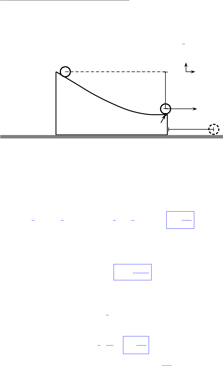 Parte 2 - PF de Física I - 2016-2 Nota Q1 NOME: DRE Teste 1 Assinatura: Questão discursiva [4,0 pontos] Uma esfera homogênea de massa M e raio R parte do repouso e rola sem deslizar sobre uma rampa que se encontra presa no solo. Essa rampa não é plana, como indica a figura, onde também está indicado que a esfera deixa a rampa no ponto B, após seu centro de massa descer uma altura desconhecida. Observa-se que o centro de massa da esfera deixa a rampa com uma velocidade horizontal de módulo V0 e que ela atinge o solo a uma distância d da base da rampa. Desconsidere o efeito da resistência do ar com a esfera e use que o momento de inércia da esfera em relação a um eixo que passa pelo CM é I = 2 5 MR2. Considere que a esfera não perde contato com a rampa até atingir o ponto B. d B V⃗0 ıˆ ȷˆ a) [1,0 ponto] Qual é a diferença de altura do centro de massa da esfera entre o instante em que ela foi abandonada e aquele em que ela perde contato com a rampa, no ponto B? Atuam sobre a esfera entre os instantes em que é abandonada e aquele em que perde contato com a rampa o peso, a normal e a força de atrito. Uma vez que o movimento é de rolamento sem deslizamento, o ponto de contato não se movimenta em relação à rampa e, desse forma, nem a normal nem a força de atrito realizam trabalho. Uma vez que o peso é uma força conservativa a energia da esfera se conserva: Ei = Ef ⇒ ∆K = −∆U ⇒ Kf −Ki = −∆U Utilizando que a energia potencial é descrita pela posição do centro de massa da esfera: 1 2 MV 2CM + 1 2 ICMω 2 = MgH ⇒ 1 2 V 20 + 1 5 V 20 = gH ⇒ H = 7V 20 10g Onde utilizou-se a condição de rolamento sem deslizamento (VCM = ωR) e que a esfera parte do repouso (Ki = 0). b) [0,7 ponto] Qual é o trabalho realizado por cada uma das forças que atuam sobre a esfera no deslocamento do item (a)? Conforme dito no item anterior, os trabalhos realizados pela força de atrito e normal são nulos por atuarem no ponto de contato, que está em repouso. O trabalho realizado pela força peso será WP = MgH ⇒ WP = 7MV 20 10 c) [1,0 ponto] Qual é a altura do ponto B em relação ao solo? Após perder contato com a rampa, a esfera descreve o movimento de um projétil de velocidade inicial horizontal de módulo V0. Escolhendo como origem do eixo de coordenadas a base da rampa podemos escrever: y(t) = h− 1 2 gt2; x(t) = V0.t Sabe-se que x(tq) = d, onde tq é o tempo que a esfera demora para atingir o solo. Portanto: 0 = h− 1 2 g. d2 V 2 0 ⇒ h = gd2 2V 2 0 onde consideramos a altura da base da esfera. Se for a posição do centro de massa h = gd2 2V 2 0 +R d) [0,8 ponto] Usando os vetores unitários definidos na figura, determine o vetor velocidade do centro de massa da esfera no instante 7 imediatamente anterior a atingir o solo. Por se comportar como um projétil VxCM (t) = V0;VyCM (t) = −gt No instante em que vai atingir o solo d = V0tq ⇒ tq = d V0 ⇒ V⃗ = V0 ıˆ− gd V0 ȷˆ e) [0,5] Qual é a velocidade angular da esfera no instante do item (d)? Até perder contato com a rampa a esfera obedece a condição de rolamento sem deslizamento (VCM = ωR). Após virar um projétil, não há mais torque sobre ela e, portanto, a velocidade angular se mantém constante até o impacto ωf = V0 R ESPAÇO PARA RESPOSTA COM DESENVOLVIMENTO 8 Instituto de Física Prova Final Física I - 12/12/2016 Nas questões em que for necessário, consi- dere que: todos os fios e molas são ideais; os fios permanecem esticados durante todo o tempo; a resistência do ar é desprezível; a aceleração da gravidade tem módulo g conhecido. Momentos de Inércia de corpos rígidos uni- formes: → Disco em relação a um eixo perpendicular a ele que passa pelo CM: I = 1 2 MR2 → Barra em relação a um eixo perpendicular a ela que passa pelo CM: I = ML 2 12 → Barra em relação a um eixo perpendicular a ela que passa pela extremidade: I = ML 2 3 → Esfera sólida em relação a um eixo que passa pelo CM: I = 2 5 MR2 Múltipla escolha - 0,6 ponto cada 1. Um caixote é transportado numa plataforma horizon- tal apoiada sobre cilindros de raio R. A plataforma se move para a direita com velocidade v⃗ sem deslizar sobre os cilindros que rolam sem deslizar sobre a su- perfície horizontal. O módulo da velocidade angular de cada cilindro em relação ao seu centro de massa é v⃗ plataforma superfı´cie (a) v 2R (b) v 4R (c) v R (d) 2v R (e) 4v R 2. Um elevador de carga está se movendo verticalmente. Sobre seu piso horizontal encontram-se um caixote muito pesado e um operário, ambos em repouso em relação ao elevador, como mostra a figura. Em um dado instante, o operário empurra o caixote e percebe que a intensidade da força horizontal que ele precisou exercer para fazer o caixote começar a deslizar sobre o piso é menor do que a intensidade da força horizontal que ele precisaria exercer para fazê-lo começar a deslizar quando o elevador estava em repouso. Qual das seguintes afirmativas é correta? (a) Nesse instante, a aceleração vertical do elevador tem sentido para baixo mas não é possível saber se o elevador está subindo ou descendo (b) Nesse instante, a aceleração vertical do elevador tem sentido para cima mas não é possível saber se o elevador está subindo ou descendo (c) Nesse instante, a aceleração é nula e o elevador está descendo (d) Nesse instante, a aceleração é nula e o elevador está subindo (e) Nesse instante, o elevador está descendo e sua aceleração tem sentido contrário ao da veloci- dade 3. A figura mostra o perfil de um trilho JKLM contido no plano vertical, sendo o trecho KLM circular, de centro C e de raio R. Uma esfera de pequenas dimensões é abandonada a uma altura h0 = R acima do plano horizontal que contém o centro C, passando a deslizar sobre o trilho com atrito desprezível. O módulo da força que o trilho exerce sobre a esfera no instante em que ele passa pelo ponto L é (a) 2mg (b) mg √ 2 (c) mg (d) mg √ 2/
