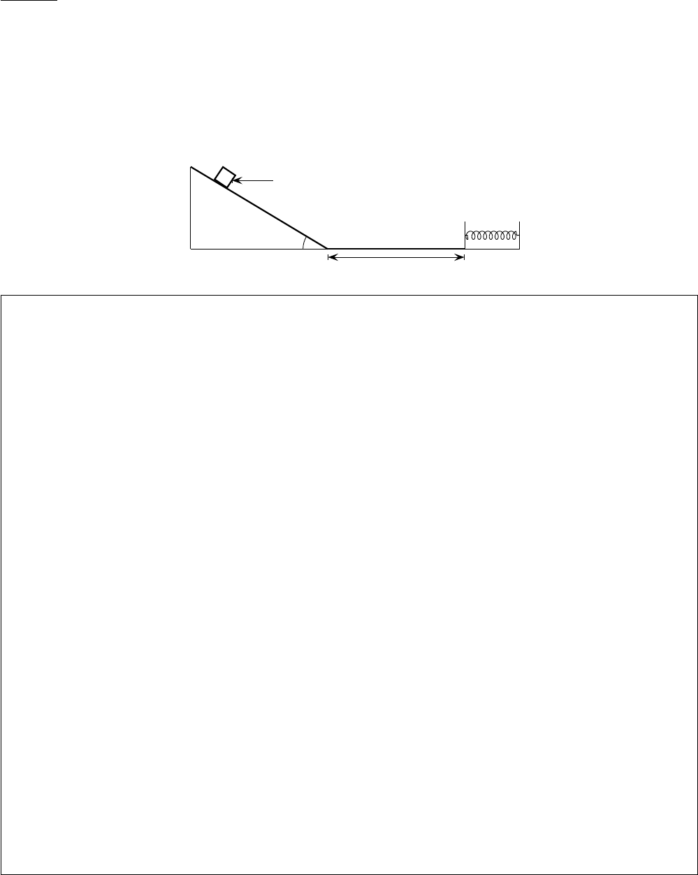 Questa˜o 1 [valor 2,3] Um bloco de massa m desce acelerado ao longo de uma rampa inclinada de um aˆngulo ✓ em relac¸a˜o a` horizontal. Um dispositivo exerce sobre o bloco uma forc¸a ~F constante horizontal, como indicado na figura. O coeficiente de atrito cine´tico entre a superfı´cie do plano inclinado e o bloco vale µ. Ao atingir a base do plano inclinado, o bloco tem uma velocidade v0 e o dispositivo que exerce a forc¸a ~F e´ desligado. O bloco percorrera´ uma distaˆncia d sobre uma superfı´cie horizontal, com o mesmo coeficiente de atrito µ ate´ encontrar a extremidade de uma mola de constante ela´stica k, fixa na outra extremidade. Considere desprezı´vel o atrito na regia˜o A-B. (Todas as respostas devem ser dadas em termos dem, ✓, F , µ, g, k, v0 e d) (a) represente e identifique todas as forc¸as que agem sobre o bloco enquanto ele esta´ sobre o plano inclinado; (b) determine o mo´dulo da acelerac¸a˜o com que o bloco desce o plano; (c) calcule a compressa˜o ma´xima da mola. d k �F m � A B ESPAC¸O PARA RESPOSTA 5 Questa˜o 2 [valor 2,3] Uma pedra de massa m e amarrada a um barbante de comprimento r e´ posta para girar em um plano perpen- dicular ao solo. Em um dado instante ela e´ solta de forma que, apo´s passar por uma altura ma´xima, ela vem a atingir uma parede que se encontra a uma distaˆncia d do ponto de lanc¸amento. A velocidade da pedra no momento do lanc¸amento tem mo´dulo vo e faz um aˆngulo ✓o com a horizontal. Nestas condic¸o˜es, determine (Todas as respostas devem ser dadas em termos dem, ✓o, r, g, d e vo): (a) a altura h do ponto de impacto da pedra na parede em relac¸a˜o ao ponto de lanc¸amento; (b) a expressa˜o para o vetor velocidade ~vf da pedra no momento imediatamente antes dela atingir a parede, em termos dos vetores unita´rios ıˆ e |ˆ indicados na figura. (c) a energia cine´ticaK da pedra no instante em que ela passa pelo ponto mais alto de sua trajeto´ria; (d) o mo´dulo T da tensa˜o no barbante no momento imediatamente anterior ao lanc¸amento. ESPAC¸O PARA RESPOSTA 7 7 Gabarito Questa˜o 1 (a)[0,3] P F N f T Y X (b)[1,0] Pela segunda lei de Newton teremos que m~a = ~FR = ~F + ~P + ~f + ~N. Sendo assim, ao considerarmos um sistema de eixos ortogonais XOY em que o eixo OY seja ortogonal a` superfı´cie da rampa, podemos obter a seguinte relac¸a˜o vetorial ma iˆ = �F (cos ✓ iˆ+ sin ✓ jˆ) +mg(sin ✓ iˆ� cos ✓ jˆ)� f iˆ+N jˆ a qual pode ser separada nas relac¸o˜es escalares ma = �F cos ✓ +mg sin ✓ � f N = mg cos ✓ + F sin ✓ Contudo, devemos lembrar que o mo´dulo da forc¸a de atrito cine´tico e´ dado por f = µN o que nos reporta a` relac¸a˜o f = µ(mg cos ✓ + F sin ✓). Portanto, ao usarmos esta relac¸a˜o na primeira equac¸a˜o obtida pela segunda lei de Newton, encontraremos ma = �F cos ✓ +mg sin ✓ � µ(mg cos ✓ + F sin ✓) ou seja, a = ✓ g � µF m ◆ sin ✓ � ✓ µg + F m ◆ cos ✓. (c)[1,0] Tendo em vista a presenc¸a da forc¸a na˜o conservativa de atrito ~f , podemos usar o teorema trabalho-energia cine´tica, que formalmente e´ dado pela relac¸a˜o �Kif ⌘ Kf �Ki = Wf , ao caso do problema para, com isso, concluirmos que 1 2 mv2A � 1 2 mv20 = �f iˆ.d iˆ = �fd. Contudo, devemos observar que, neste caso, teremos f = µN = µmg e, nestas condic¸o˜es, encontraremos 1 2 mv2A � 1 2 mv20 = �µmgd =) vA = q v20 � 2µgd. Como ao longo da regia˜o AB na˜o existem forc¸as que realizam trabalho e o movimento acontece ao longo de um mesmo nı´vel horizontal a energia potencial gravitacional na˜o varia e, com isso, a conservac¸a˜o da energia mecaˆnica implica em ter Ei = Ef =) 1 2 mv2A = 1 2 kx2 =) x = r m k vA =) x = r m k (v20 � 2µgd). 9 Questa˜o 2 (a)[0,7] A partir do ponto de lanc¸amento, o afastamento lateral da pedra sera´ dado por x(t) = vot cos ✓o. Com isso, se a parede se encontra a uma distaˆncia d, teremos que d = vo�t cos ✓o =) �t = d vo cos ✓o . Sabemos tambe´m que a posic¸a˜o vertical da pedra apo´s ser lanc¸ada e´ dada por y(t) = vot sin ✓o � 12gt2, portanto tomando o instante�t obtido anteriormente encontraremos que h = vo sin ✓o ✓ d vo cos ✓o ◆ � g 2 ✓ d vo cos ✓o ◆2 =) h = (tan ✓o) d� ✓ g 2v2o cos 2 ✓o ◆ d2. (b)[0,6] Temos que ~vf = vx(�t) iˆ+ vy(�t) jˆ onde vx(�t) = vo cos ✓o e vy(�t) = vo sin ✓o � g�t = vo sin ✓o � gd vo cos ✓o e, dessa forma, podemos concluir que ~vf = vo cos ✓oiˆ+ ✓ vo sin ✓o � gd vo cos ✓o ◆ jˆ. (c)[0,2] A energia cine´tica da pedra e´ dada por K = 12m(v 2 x+ v 2 y). Contudo, no ponto mais alto da trajeto´ria vy = 0 e sabemos que a componente vx da velocidade tem um valor constante dado por vx = vo cos ✓o. Portanto podemos concluir que, neste caso, teremos K = 1 2 mv2o cos 2 ✓o. (d)[0,8] Considerando as forc¸as que atuam sobre a pedra na posic¸a˜o imediatamente anterior ao seu lanc¸amento teremos que m~a = ~FR = ~T + ~P =) m(a��ˆ� ar rˆ) = �T rˆ �mg(cos ✓orˆ � sin ✓o�ˆ). Sendo assim, ao lembrarmos que ar = v2o/r, podemos concluir que mv2o/r = T +mg cos ✓o =) T = m(v2o/r � g cos ✓o). 10 UFRJ - Instituto de Física Física I - Primeira Prova - 23/05/2016 Parte 1 - Múltipla Escolha - 0,6 cada 1. O gráfico abaixo apresenta a evolução temporal da posição x(t) de um objeto em movimento unidimensi- onal. Considerando as informações fornecidas através deste gráfico, assinale dentre as afirmações apresen- tadas abaixo aquelas que são INCORRETAS. (I) No ponto A temos v = 0. (II) Entre os pontos B e C, representado no gráfico por uma reta, o movimento do objeto é uniforme. (III) No ponto D o objeto está parado e em equilíbrio. (IV) Entre os pontos A e B o produto escalar da ve- locidade e a aceleração satisfaz à condição ~v.~a � 0. (V) A partir do ponto E e até o ponto F o objeto é freado. t x A B C D E 0 F (a) apenas a (