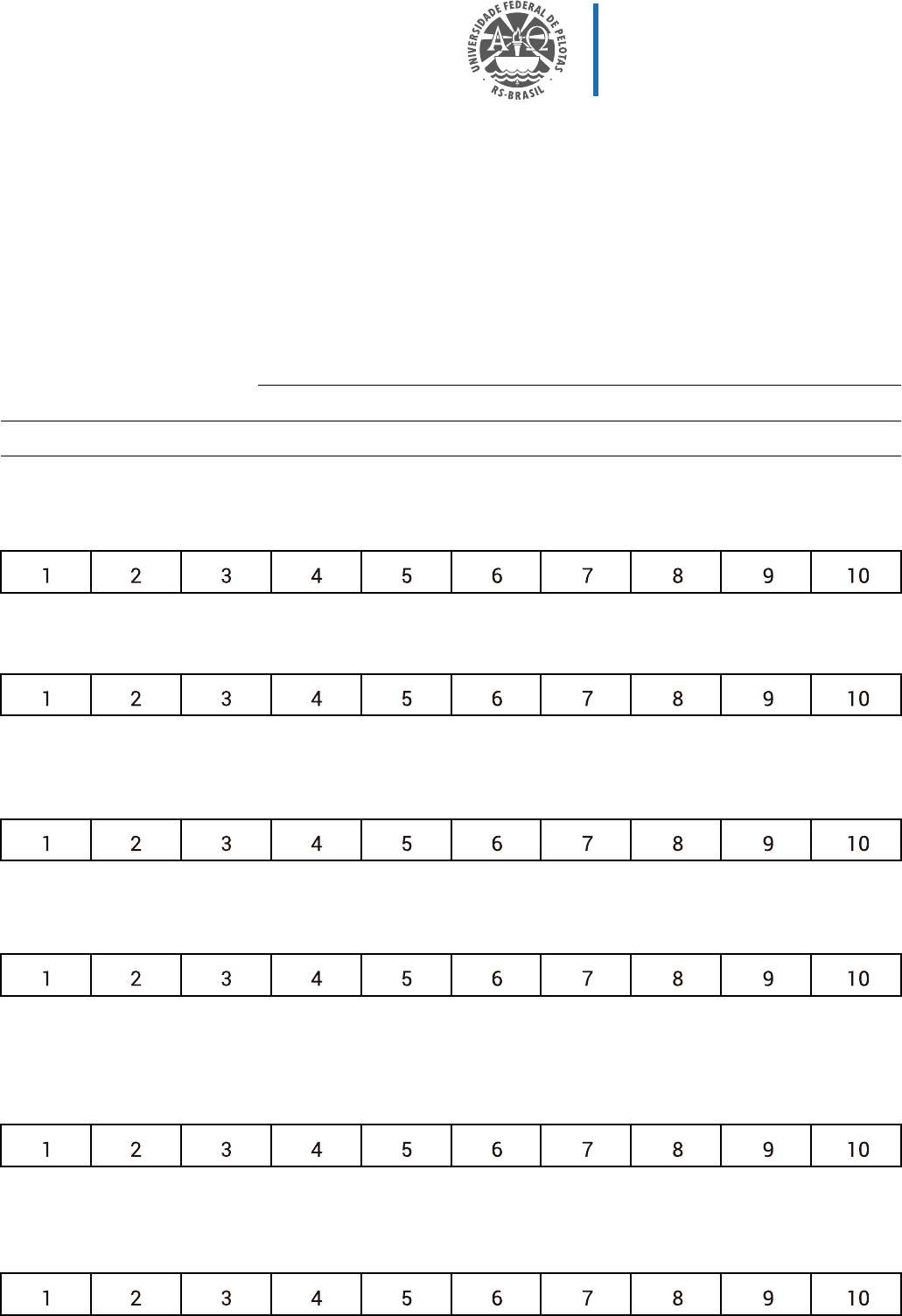 ESCALA DE FADIGA DE PIPER - REVISADA Instruções: Para cada questão a seguir, circule o número que melhor descreve a fadiga que você está sentindo AGORA. Por favor, esforce-se para responder cada questão da melhor maneira possível. 1.Há quanto tempo você está sentindo fadiga? (assinale somente UMA resposta) ( ) Dias ( ) Semanas ( ) Meses ( ) Horas ( ) Minutos ( ) Outro - por favor descreva: 2.Quanto estresse a fadiga que você sente agora causa? 3.Quanto a fadiga interfere na sua capacidade de completar suas atividades de trabalho ou escolares? 4. Quanto a fadiga interfere na sua habilidade de visitar ou estar junto com seus amigos? 5. Quanto a fadiga interfere na sua habilidade de ter atividade sexual? 6. De modo geral, quanto a fadiga interfere na capacidade de realizar qualquer tipo de atividade que você gosta? 7. Como você descreveria a intensidade ou a magnitude da fadiga que você está sentindo agora? Departamento de Medicina Social MÓDULO DE AUTOAPRENDIZAGEM ATENÇÃO DOMICILIAR: CUIDADOS PALIATIVOS Nenhum estresse Muito estresse Nada Muito Nada Muito Nada Muito Nada Muito Leve Intensa 8. Como você descreveria a fadiga que você está sentindo agora? Agradável Desagradável Aceitável Inaceitável Protetora Destruidora Positiva Negativa Normal Anormal Nenhum Estresse Muito Estresse 9. Quanto você está se sentindo... Fraco Forte Acordado Sonolento Com vida Apático Com vigor Cansado Com energia Sem energia Paciente Impaciente Relaxado Tenso 10. De modo geral, o que você acha que contribui ou causa a sua fadiga? 11. De modo geral, o que mais alivia a sua fadiga é: 12. Existe mais alguma coisa que você gostaria de dizer para descrever melhor sua fadiga ? 13. Você está sentindo qualquer outro sintoma agora? ( ) Não ( ) Sim. Por favor descreva: Extremamente feliz Deprimido Capaz de se concentrar Incapaz de se concentrar Capaz de se lembrar Incapaz de se lembrar Capaz de pensar com clareza Incapaz de pensar com clareza Fonte: ABCP. Associação Brasileira de Cuidados Paliativos. Consenso Brasileiro de Fadiga. Revista Brasileira de Cuidados Paliativos, vol. 3, n.2, Suplemento 1, 2010. http://www.cuidadospaliativos.com.br/img/din/file/consenso_fadiga.pdf