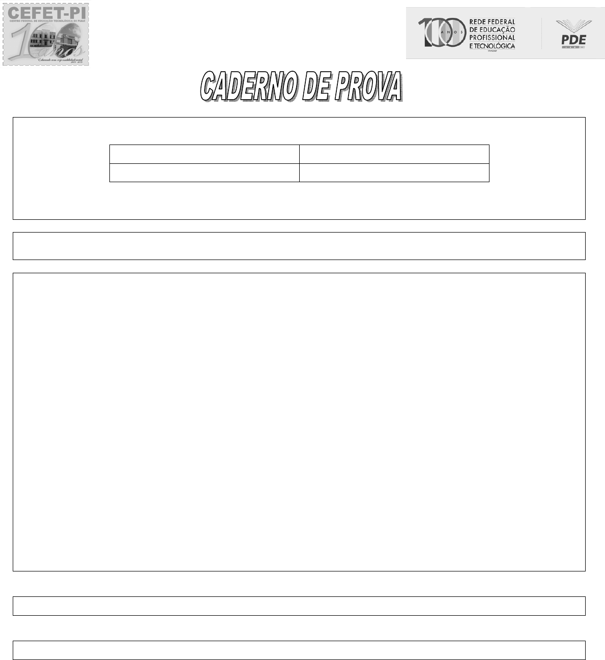 CURSOS SUPERIORES DE TECNOLOGIAS Gestão de Recursos Humanos, Secretariado. MATEMÁTICA 30 QUESTÕES HISTÓRIA 30 QUESTÕES DATA: 07/12/2008 (Domingo /manhã) TEMPO: 4 horas. LLEEIIAA AATTEENNTTAAMMEENNTTEE AASS IINNSSTTRRUUÇÇÕÕEESS 11.. Este caderno é constituído de prova objetiva de MATEMÁTICA e HISTÓRIA. 22.. Cada uma das questões da prova, apresenta um enunciado seguido de 5 (cinco) alternativas, designadas pelas letras A, B, C, D e E, das quais somente uma é correta. 33.. Caso o caderno esteja incompleto ou tenha qualquer defeito, solicite ao fiscal da sala que tome as providencias cabíveis. 44.. Decorrido o tempo determinado pela Comissão Encarregada Para Realização do Concurso Vestibular, será distribuído o CARTÃO RESPOSTA, o qual será o único documento válido para a correção da prova. 55.. Ao receber o CARTÃO RESPOSTA, verifique se seu nome e número de inscrição estão corretos. Reclame imediatamente se houver discordância. 66.. Para cada uma das questões, você deve marcar UMA e somente UMA das alternativas. 77.. Assine o CARTÃO RESPOSTA no espaço reservado no cabeçalho. Não haverá substituição do CARTÃO RESPOSTA. 88.. Não amasse nem dobre o CARTÃO RESPOSTA, para que não seja rejeitado pelo computador no momento da leitura. 99.. Será anulada a resposta que contiver emenda, rasura ou que apresentar mais de uma alternativa assinalada. 1100.. É vedado o uso de qualquer material, além de caneta para marcação das respostas; qualquer forma de comunicação entre os candidatos também implicará sua eliminação. 1111.. O candidato ao sair da sala, deverá entregar, definitivamente, seu CARTÃO RESPOSTA, e este CADERNO DE PROVA, devendo ainda assinar a folha de presença. NOME COMPLETO (legível ou em letra de forma) ASSINATURA CCEENNTTRROO FFEEDDEERRAALL DDEE EEDDUUCCAAÇÇÃÃOO TTEECCNNOOLLÓÓGGIICCAA DDOO PPIIAAUUÍÍ CCOONNCCUURRSSOO VVEESSTTIIBBUULLAARR 22000099 MMAATTEEMMÁÁTTIICCAA 0011.. Uma casa que custa R$ 20.000,00 foi vendida por Marcos a Pedro com um prejuízo de 10%. Depois de algum tempo Pedro resolve vender a mesma casa para Marcos, com um lucro de 10 %. Com relação aos resultados dessas operações é correto afirmar que, no final: aa)) Marcos nem ganhou nem perdeu. bb)) Pedro nem ganhou nem perdeu. cc)) Marcos teve um prejuízo de R$ 1900,00. dd)) Pedro teve um lucro de R$ 1800,00. ee)) Pedro teve um prejuízo de R$ 200,00. 0022.. Na instalação do assentamento de um grupo de escoteiros, foi determinado que um acampamento de meninos devesse ser instalado a uma distância de 80m de uma estrada reta, na qual seria instalado um acampamento de meninas localizado a uma distância de 100m do acampamento dos meninos. Deseja-se também construir na estrada, um ponto de observação eqüidistante aos dois acampamentos. A soma das distâncias desse posto de observação aos dois acampamentos é em metros aproximadamente igual à : aa)) 23,3 bb)) 80,6 cc)) 97,4 dd)) 50 ee)) 166,7 0033.. Considere duas cordas perpendiculares de um circulo λ que se interceptam em um ponto P do circulo. Se o ponto P divide a menor das cordas em dois segmentos de medida 6 e 4 e a medida da maior corda é 14 então a área do circulo é igual a: aa)) 50π bb)) 60π cc)) 26π dd)) 38π ee)) 28π 0044.. Em uma sala de aula existem 10 meninas e 10 meninos e quando “toca” o sinal de intervalo, por questões de organização, eles devem sair da sala em fila indiana. O número de filas distintas que se pode formar de modo que nunca fiquem dois homens juntos ou duas mulheres juntas é : aa)) 100 ! bb)) 200 ! cc)) 2.(10!)2 dd)) 2(1002)! ee)) (100!)2 0055.. Um dos estudos mais controversos da atualidade se reporta às pesquisa de células primárias que podem se diferenciar em qualquer tipo de células do corpo. São as famosas células troncas embrionárias. Tirando as dificuldades relacionadas com a bioética, um outro “gargalo” que afeta o estudo é justamente a obtenção de um número muito grande de células diferenciadas viáveis necessárias para uma utilização prática. Considere que o numero total N de células (dado em milhão) que se obtém a partir do cultivo de uma amostra inicial N0 de células (dado em milhão) em função do tempo t, dado em horas, seja determinado por tNN α)2.(0= onde α é um parâmetro relacionado com características intrínsecas do cultivo das células. Sabendo que partindo de uma amostra N0=0,16 milhões de células para que sejam obtidos 128 milhões de células é necessário um tempo, dado em horas, aproximadamente igual a: (Dado log2 = 0,3). aa)) α10 29 bb)) 29α cc)) 2α dd)) α2 3 ee)) α2 19 0066.. Considere duas velas de mesma altura feitas com materiais diferentes, de forma que a primeira queima totalmente em 4 horas e a segunda em 6 horas, ambas com um processo de combustão constante. Se a segunda vela for acesa 1 hora antes, o tempo necessário para que a primeira, depois de acesa, fique com o mesmo tamanho da segunda é, em horas , igual a: aa)) 3 bb)) 2 cc)) 1,5 dd)) 3,2 ee)) 2,5 0077.. Não é incomum encontramos na natureza fenômenos cujo comportamento pode ser descrito por funções matemáticas. Dentre estes fenômenos, os que têm características cíclicas ou de repetição continuada podem ser expressas em função do tempo por funções trigonométricas periódicas. Considere que o volume de ar, em litros, que tem no pulmão durante a respiração do ‘porquinho da índia’ (Cavia aparea) muito usada como cobaia de laboratório, pode ser, aproximadamente descrito pela expressão )(28)( tsentv π+= onde t é o tempo dado em minutos. Quando t=0, o animal se encontra em repouso sem inspirar nem expirar. Considerando estas informações, pode-se afirmar que, aproximadamente, o volume máximo de ar que cabe no pulmão deste animal é, em litros: aa)) 14 bb)) 8 cc)) 6 dd)) 10 ee)) 12 0088.. Em um campeonato de lançamento de dados com duas pessoas tem o seguinte regulamento: Se o jogador 