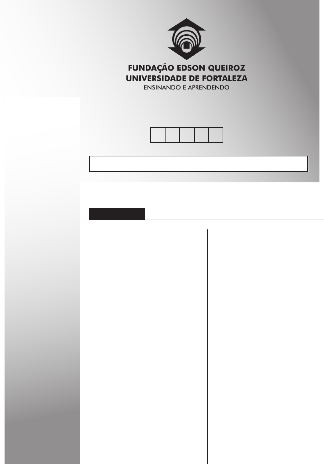 UNIFOR 1. Verifi que se este caderno de prova contém um total de 60 questões e duas propostas de Redação. Caso contrário, solicite ao fi scal de sala um outro caderno completo. Não serão aceitas reclamações posteriores. 2. Você dispõe de quatro horas e trinta minutos para responder a todas as questões, preencher a folha de respostas e desenvolver a Redação, transcrevendo-a para a folha de redação. Controle o seu tempo. 3. Leia cada questão da prova e marque, inicialmente, a alternativa correta no próprio caderno-questionário. Para cada questão, existe apenas uma resposta certa. 4. Antes de transcrever suas alternativas para a folha de respostas ou preencher a folha de redação, confi ra se o nome e o número impressos na parte superior delas coincidem com seu nome e o seu número de inscrição e assine- as conforme a sua carteira de identidade. 5. Caso o nome e o número impressos na folha de respostas ou na folha de redação que lhe foram entregues não estejam corretos, informe, imediatamente, ao fi scal. A utilização de uma folha de respostas ou de uma folha de redação cujo nome e número não coincidam com os de sua inscrição invalidará a sua prova, à qual será atribuída nota zero. 6. Para marcar a sua alternativa na folha de respostas, utilize caneta esferográfi ca preta, de acordo com a orientação a seguir: a) preencha completamente a bolha correspondente à sua opção e assinale somente uma alternativa para cada questão; b) nenhuma resposta poderá ser feita nem alterada depois de re- colhida pelo fi scal; c) não dobre, não amasse, nem faça qualquer marca na folha de respostas. 7. Ao terminar, entregue este caderno, a folha de redação e a folha de respostas, devidamente assinadas, ao fi scal da sala. 8. Atenção: após o encerramento da prova, este caderno será destruído por trituramento, e não será considerada qualquer resposta feita nele quando não transcrita para a folha de respostas. INSTRUÇÕES PR OC ES SO SE LE TIV O 20 16 .1 P ri m ei ra F as e NÚMERO DE INSCRIÇÃO NOME: 2 UNIFOR – Processo Seletivo 2016.1 – 1ª Fase UNIFOR 3 UNIFOR – Processo Seletivo 2016.1 – 1ª Fase UNIFOR MATEMÁTICA E SUAS TECNOLOGIAS Questão 1 A professora de matemática de um colégio de Fortaleza, ao arguir um dos seus alunos em uma prova oral, pediu que o mesmo representasse na forma do Diagrama de Venn a sentença (A ∩ BC), onde A e B são dois conjuntos arbitrários. Qual dos diagramas abaixo o aluno deve representar para responder a pergunta da professora? (A) (B) (C) (D) (E) 4 UNIFOR – Processo Seletivo 2016.1 – 1ª Fase UNIFOR Questão 2 Questão 3 Com o início da temporada de turismo na cidade de Fortaleza, observa-se uma alta de preços em vários produtos. Veja na Tabela abaixo as diferenças de preços de alguns produtos observados no dia 30 de dezembro de 2014, em comparação com o de meses anteriores. Produtos Meses anteriores Dezembro de 2014 Cerveja R$ 3,00 R$ 7,00 Água de coco R$ 3,00 R$ 3,00 Coquetel de frutas R$ 10,00 R$ 20,00 Carangueijo R$ 6,00 R$ 8,00 Sorvete (uma bola) R$ 4,50 R$ 5,00 Filé de peixe (kg) R$ 30,00 R$ 45,00 Gasolina (litro) R$ 2,49 R$ 2,60 Álcool (litro) R$ 1,65 R$ 1,79 ADAPTADO Segundo a Tabela acima , o conjunto de produtos que tiveram aumento entre 10% e 110% é compreendido por: (A) cerveja, coquetel de frutas, carangueijo e filé de peixe. (B) álcool, carangueijo, filé de peixe e sorvete. (C) filé de peixe, sorvete , coquetel de frutas e álcool. (D) sorvete, coquetel de frutas, carangueijo e filé de peixe. (E) filé de peixe, sorvete , coquetel de frutas e água de coco. O resultado de uma pesquisa realizada por um orgão do governo do estado do Ceará sobre o perfil dos fumantes e publicado pela imprensa cearense mostrou que, num grupo de 1000 pessoas, 17% fumam e, dentre os fumantes, 44% são mulheres. Se, nesse grupo de 1000 pessoas, uma é escolhida ao acaso, então a probabilidade de ela ser fumante e mulher é, aproximadamente, (A) 0,044 (B) 0,054 (C) 0,075 (D) 0,085 (E) 0,095 5 UNIFOR – Processo Seletivo 2016.1 – 1ª Fase UNIFOR Questão 4 Questão 5 Questão 6 A concentração do álcool na gasolina brasileira, segundo o Conselho Nacional de Petróleo - CNP é de 25%. Certo posto de gasolina de Fortaleza foi interditado após a fiscalização determinar que a gasolina possuia concentração de 30% de álcool. Havia nesse posto um estoque de 80.000 litros dessa gasolina adulterada. Sendo assim, o número de litros de gasolina pura que deve ser adicionado a esse estoque de modo a se obter uma mistura com 25% de álcool é: (A) 16.000. (B) 20.000. (C) 24.000. (D) 26.000. (E) 30.000. Em uma fazenda no município de Jaguaribe destinada à produção de leite, o custo mensal com a mão de obra é R$ 360,00 fixos, mais 10% do total, T, arrecadado com a venda do leite. Os demais custos de produção representam juntos 45% de T. Se o litro do leite é vendido por R$ 0,50, qual a quantidade mínima de leite que deve ser produzida ao mês para que o produtor não tenha prejuízo? (A) 800 litros. (B) 1000 litros. (C) 1200 litros. (D) 1400 litros. (E) 1600 litros. Três engenheiros associaram-se para a construção de um prédio de apartamentos, onde o primeiro emprega R$ 130.000,00 durante oito meses, o segundo, R$ 100.000,00 durante um ano e o terceiro R$ 80.000,00 durante seis meses. Na venda dos apartamentos, eles tiveram um lucro líquido de R$ 136.000,00. O lucro do segundo engenheiro é. (A) R$ 24.000,00. (B) R$ 26.000,00. (C) R$ 52.000,00. (D) R$ 55.000,00. (E) R$ 60.000,00. 6 UNIFOR – Processo Seletivo 2016.1 – 1ª Fase UNIFOR Questão 7 Questão 8 O quadro de funcionário de uma empresa em Fortaleza é composto por 4 categorias salariais. O aumento percentual no salário de um funcionário, promovido à categoria imediatamente superior, é sempre constante. Sabendo que os salários variam de R$ 864,00 a R$ 2.048,00, o valor do salário de um funcionário que pertence a 3