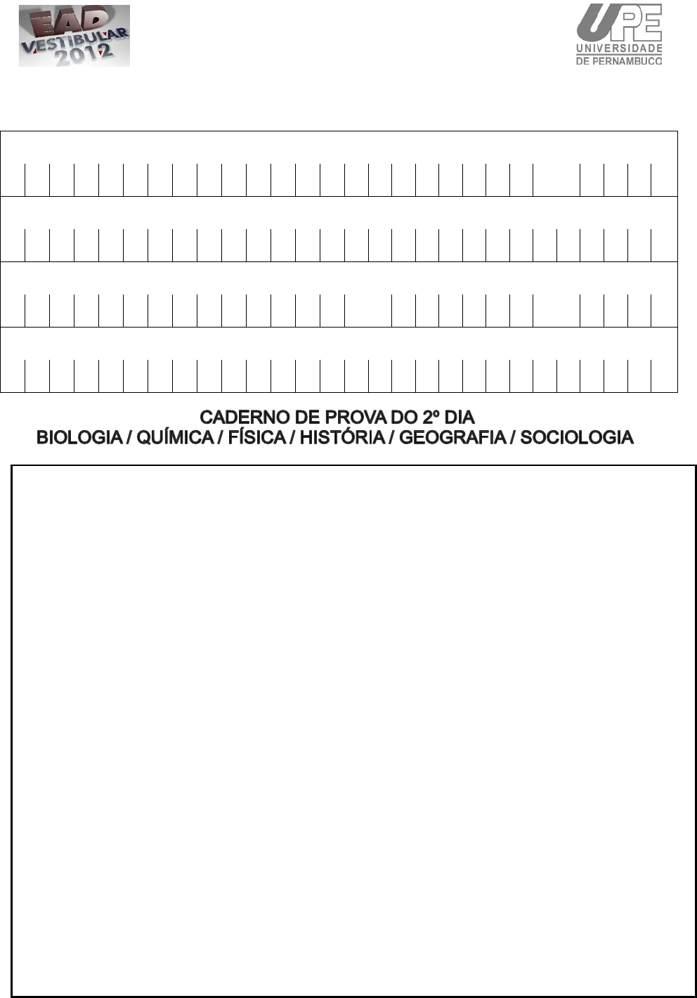 DADOS DE IDENTIFICAÇÃO DO CANDIDATO Não deixe de preencher as informações a seguir: Prédio Sala Nome Nº de Identidade Órgão Expedidor UF Nº de Inscrição AATTEENNÇÇÃÃOO!! AAbbrraa eessttee CCaaddeerrnnoo qquuaannddoo oo AApplliiccaaddoorr ddee PPrroovvaass aauuttoorriizzaarr oo iinníícciioo ddaa PPrroovvaa.. OObbsseerrvvee ssee oo CCaaddeerrnnoo eessttáá ccoommpplleettoo,, ccoonntteennddoo 5566 ((cciinnqquueennttaa ee sseeiiss)) qquueessttõõeess ddee mmúúllttiippllaa eessccoollhhaa ddaass sseegguuiinntteess ddiisscciipplliinnaass:: BBiioollooggiiaa ((1100 qquueessttõõeess)),, QQuuíímmiiccaa ((1100 qquueessttõõeess)),, FFííssiiccaa ((1100 qquueessttõõeess)),, HHiissttóórriiaa ((1100 qquueessttõõeess)),, GGeeooggrraaffiiaa ((1100 qquueessttõõeess)) ee SSoocciioollooggiiaa ((0066 qquueessttõõeess)).. SSee oo CCaaddeerrnnoo eessttiivveerr iinnccoommpplleettoo oouu ccoomm aallgguumm ddeeffeeiittoo ggrrááffiiccoo qquuee llhhee ccaauussee ddúúvviiddaass,, iinnffoorrmmee,, iimmeeddiiaattaammeennttee,, aaoo AApplliiccaaddoorr ddee PPrroovvaass.. UUmmaa vveezz ddaaddaa aa oorrddeemm ddee iinníícciioo ddaa PPrroovvaa,, pprreeeenncchhaa,, nnooss eessppaaççooss aapprroopprriiaaddooss,, oo NNoommee ddoo sseeuu pprrééddiioo ee oo NNúúmmeerroo ddaa ssuuaa ssaallaa,, oo sseeuu NNoommee ccoommpplleettoo,, oo NNúúmmeerroo ddoo sseeuu DDooccuummeennttoo ddee IIddeennttiiddaaddee,, oo ÓÓrrggããoo EExxppeeddiiddoorr,, aa UUnniiddaaddee ddaa FFeeddeerraaççããoo ee oo NNúúmmeerroo ddee IInnssccrriiççããoo.. PPaarraa rreeggiissttrraarr aass aalltteerrnnaattiivvaass eessccoollhhiiddaass nnaass qquueessttõõeess ddaa pprroovvaa,, vvooccêê rreecceebbeerráá uumm CCaarrttããoo--RReessppoossttaa ddee LLeeiittuurraa ÓÓttiiccaa.. VVeerriiffiiqquuee ssee oo NNúúmmeerroo ddee IInnssccrriiççããoo iimmpprreessssoo nnoo CCaarrttããoo ccooiinncciiddee ccoomm oo sseeuu NNúúmmeerroo ddee IInnssccrriiççããoo.. AAss bboollhhaass ccoonnssttaanntteess ddoo CCaarrttããoo--RReessppoossttaa ddeevveemm sseerr pprreeeenncchhiiddaass ttoottaallmmeennttee,, ccoomm ccaanneettaa eessffeerrooggrrááffiiccaa aazzuull oouu pprreettaa.. VVooccêê ddiissppõõee ddee 44 hhoorraass ppaarraa rreessppoonnddeerr àà pprroovvaa,, jjáá iinncclluussoo oo tteemmppoo ddeessttiinnaaddoo aaoo pprreeeenncchhiimmeennttoo ddoo CCaarrttããoo--RReessppoossttaa.. OO tteemmppoo ddee PPrroovvaa eessttáá ddoossaaddoo ddee mmooddoo qquuee ppeerrmmiittaa ffaazzêê--llaa ccoomm ttrraannqquuiilliiddaaddee.. ÉÉ ppeerrmmiittiiddoo,, aappóóss 33 hhoorraass ddoo iinníícciioo ddaa pprroovvaa,, rreettiirraarr--ssee ddoo pprrééddiioo ccoonndduuzziinnddoo oo sseeuu CCaaddeerrnnoo ddee PPrroovvaa,, ddeevveennddoo,, nnoo eennttaannttoo,, eennttrreeggaarr aaoo AApplliiccaaddoorr ddee PPrroovvaass oo CCaarrttããoo--RReessppoossttaa pprreeeenncchhiiddoo.. CCaassoo vvooccêê nnããoo ooppttee ppoorr lleevvaarr oo CCaaddeerrnnoo ddee PPrroovvaa,, eennttrreegguuee--oo aaoo AApplliiccaaddoorr ddee PPrroovvaass,, nnããoo ppooddeennddoo,, ssoobb nneennhhuummaa aalleeggaaççããoo,, ddeeiixxaarr oo CCaaddeerrnnoo eemm oouuttrroo lluuggaarr ddeennttrroo ddoo rreecciinnttoo oonnddee ssããoo aapplliiccaaddaass aass pprroovvaass.. BBOOAA PPRROOVVAA!! EEDDUUCCAAÇÇÃÃOO AA DDIISSTTÂÂNNCCIIAA // 22ºº DDIIAA 2 BBIIOOLLOOGGIIAA 01. Você foi convidado(a), como monitor(a) em uma aula de Ciências, para opinar sobre a relação entre algumas figuras de experimentos acerca da origem da vida na Terra e as afirmativas relacionadas a estas. Observe as figuras a seguir: Experimento 1 Experimento 2 Experimento 3 Fontes: figuras respectivamente adaptadas de http://www.google.com.br/imgres?imgurl=http://trabalhobiologia.hd1.com.br/imagens/; http://www.biologando.com.br/fatima/?p=54; http://www.agracadaquimica.com.br/index.php?acao=quimica/ms2&i=19&id=511 Analise as seguintes afirmativas: I. No experimento 1, Pasteur usou recipientes com animais mortos. Manteve alguns fechados com gaze e outros abertos e demonstrou que as larvas nasciam dos ovos depositados por moscas, comprovando a abiogênese. II. No experimento 2, Spallanzani realizou experimentos com um caldo aquecido colocado em frascos pescoço de cisne, provando que os vermes só surgiam após a quebra do gargalo e quando o caldo ficasse em contato com o ar. III. No experimento 3, Miller e Urey simularam a atmosfera primitiva e obtiveram aminoácidos e algumas moléculas orgânicas simples com base em compostos inorgânicos. IV. Os experimentos 1 e 2 se referem à teoria da biogênese, enquanto o experimento 3 se relaciona com a da evolução molecular. Estão CORRETAS A) I e II. B) I, II e III. C) I, II e IV. D) II e III. E) III e IV. 02. De acordo com as informações encontradas na imagem, assinale a alternativa CORRETA. Fonte: http://www.sobiologia.com.br/conteudos/quimica_vida/quimica9.php EEDDUUCCAAÇÇÃÃOO AA DDIISSTTÂÂNNCCIIAA // 22ºº DDIIAA 3 A) A figura representa uma proteína terciária que possui várias funções no organismo, dentre elas, a de participar da composição de enzimas. B) Os aminoácidos unidos por pontes de hidrogênio formam uma proteína terciária de grande valor estrutural. C) Por meio de ligações peptídicas, os aminoácidos da figura unem-se, formando uma molécula proteica com estrutura primária. D) A proteína da figura representa uma proteína conjugada de estrutura primária. E) Os 39 aminoácidos da figura estão unidos por meio de 40 ligações peptídicas, representadas na sua estrutura secundária. 03. Observe a tirinha a seguir: Fonte: http://depositodocalvin.blogspot.com/search/label/Criaturas - Tirinha 162 Nela Calvin faz alusão a uma ameba. Observe as afirmativas, a seguir, relacionadas a esse organismo e sua forma de alimentação ou locomoção por meio de pseudópodes e assinale a afirmativa CORRETA. A) A difusão facilitada ocorre a favor do gradiente de concentração, mas depe