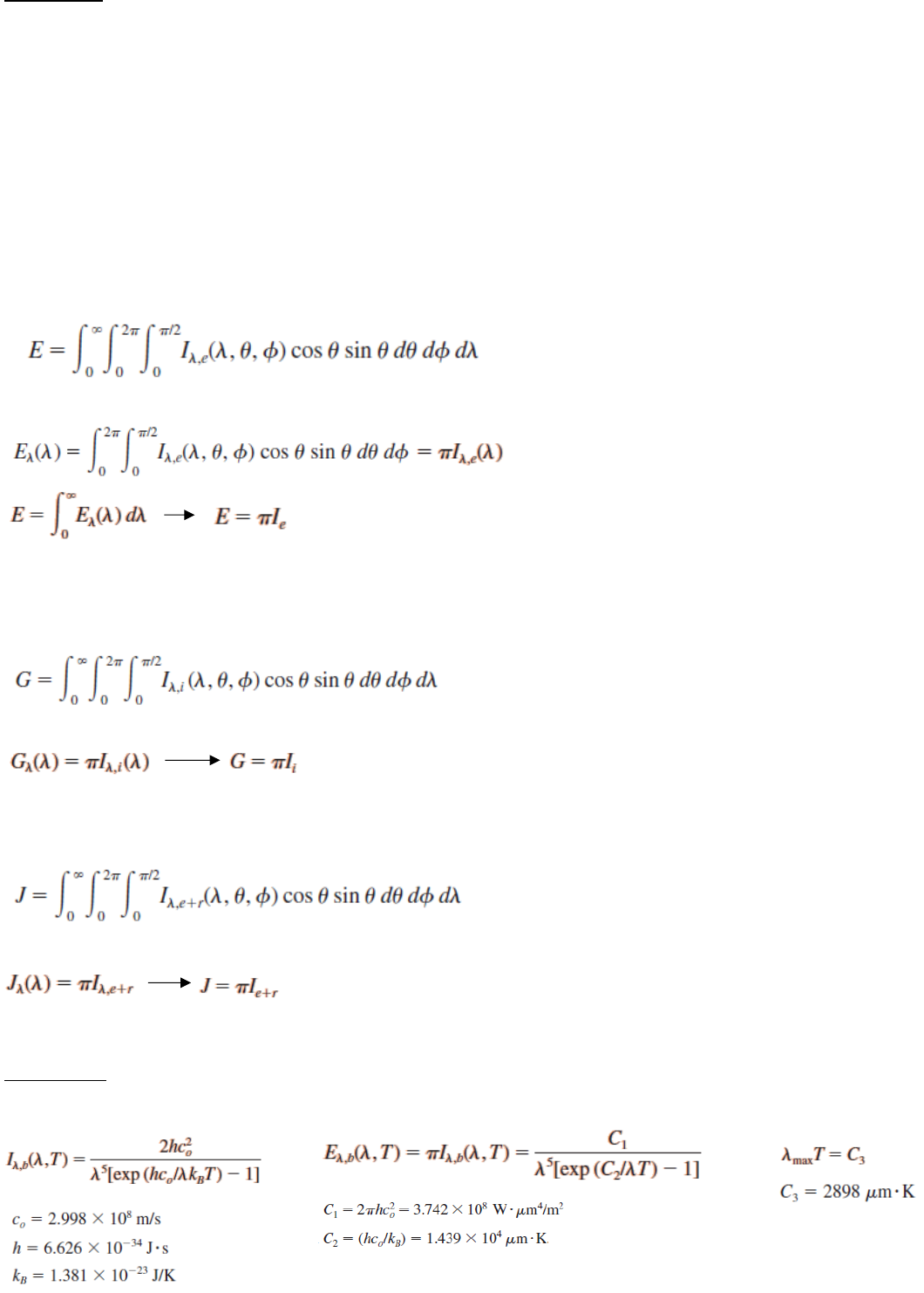 Formulário sobre Radiação Capítulo 12 Conservação da energia irradiada: ρ+α+τ=1 Radiosidade: 𝐽 = 𝐸 + 𝜌𝐺 Taxa líquida de transferência de calor por radiação, por unidade de área, a partir de uma superfície: 𝑞𝑟𝑎𝑑 " = 𝐽 − 𝐺 O poder emissivo (hemisférico) total E é então a taxa na qual a radiação é emitida por unidade de área em todos os possíveis comprimentos de onda e em todas as direções possíveis: Emissor difusivo: uma superfície cuja intensidade da radiação emitida independe da direção A irradiação total G é a taxa na qual a radiação é incidente por unidade de área a partir de todas as direções e todos os comprimentos de onda: Se a irradiação for difusa: A radiosidade total J é a taxa na qual a radiação é deixa uma superfície, por unidade de área, a partir de todas as direções e todos os comprimentos de onda: Se a radiosidade for difusa: Corpo negro: Ie intensidade total da radiação emitida Ii intensidade total da radiação incidente Ie+r intensidade total da radiação emitida e refletida Distribuição espectral da emissão de um corpo negro: Poder emissivo espectral de um corpo negro: Superfície real Lei de Kirchoff Superfície cinza (cinzenta): Capítulo 13 O fator de forma Fij é a fração da Radiação que deixa a superfície i e que é interceptada pela superfície j: Relação de Reciprocidade: Regra do somatório: Radiação entre 2 corpos negros: Taxa líquida de radiação a partir da superfície i, devida à troca com N superfícies que atuam como corpos negros: Taxa líquida de radiação a partir da superfície i, devida à troca com N superfícies Opacas, Cinzentas e Difusas num Invólucro: Resistência superficial é: 𝑅𝑠𝑢𝑝 = 1−𝜀𝑖 𝜀𝑖𝐴𝑖 Resistência espacial entre as superfícies i e j: 𝑅𝑒𝑠𝑝 = 1 𝐴𝑖𝐹𝑖𝑗 Quando temos apenas duas superfícies: Blindagem de radiação: Superfície Reirradiante: Transferência de Calor Combinada: 𝑞𝑖,𝑅 = 𝐴𝑖,𝑅( 𝐽𝑖,𝑅 − 𝐺𝑖,𝑅) = 𝐸𝑏𝑖,𝑅 − 𝐽𝑖,𝑅 (1 − 𝜀𝑖,𝑅)/𝜀𝑖,𝑅𝐴𝑖,𝑅 = 0 ⇒ 𝐽𝑖,𝑅 = 𝐺𝑖,𝑅 = 𝐸𝑏𝑖,𝑅