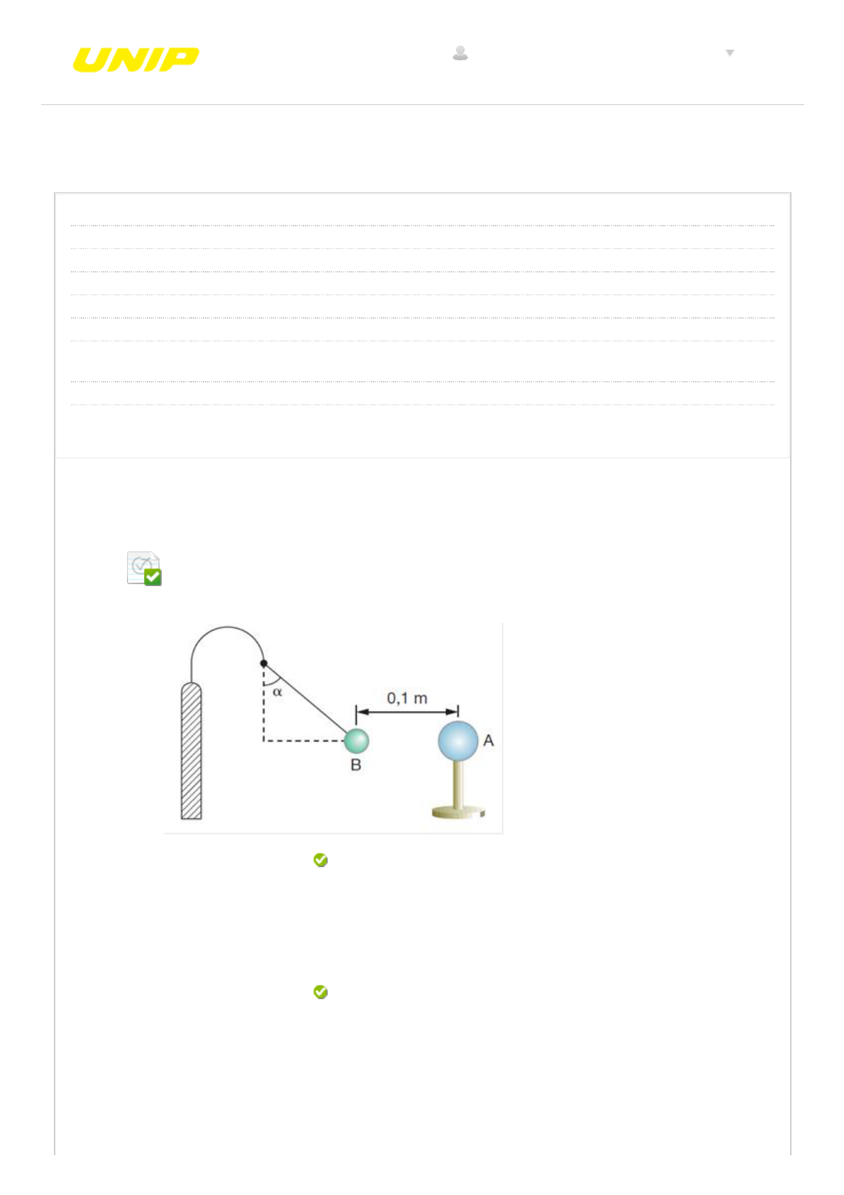 15/10/2018 Revisar envio do teste: QUESTIONÁRIO UNIDADE III – 5512-... https://ava.ead.unip.br/webapps/assessment/review/review.jsp?attempt_id=_9657599_1&course_id=_28199_1&content_id=_433466_1&return_… 1/10 Revisar envio do teste: QUESTIONÁRIO UNIDADE III COMPLEMENTOS DE FÍSICA 5512-80_15402_R_20182 CONTEÚDO Usuário deivid.barcellos @unipinterativa.edu.br Curso COMPLEMENTOS DE FÍSICA Teste QUESTIONÁRIO UNIDADE III Iniciado 15/10/18 22:54 Enviado 15/10/18 22:57 Status Completada Resultado da tentativa 2,5 em 2,5 pontos Tempo decorrido 2 minutos Resultados exibidos Todas as respostas, Respostas enviadas, Respostas corretas, Comentários, Perguntas respondidas incorretamente Pergunta 1 Resposta Selecionada: d. Respostas: a. b. c. d. e. Feedback da resposta: A �gura mostra a con�guração de equilíbrio de uma pequena esfera A e um pêndulo B que possuem cargas de mesmo módulo. Se tg(α) = 4/3 e a massa de B é 0,1 kg, determine os módulos aproximados das cargas de A e B. 1,22 x 10-6 C. 1,1 x 10-5 C. 1,22 x 10-5 C. 1,1 x 10-6 C. 1,22 x 10-6 C. 10-6 C. . CONTEÚDOS ACADÊMICOS BIBLIOTECAS MURAL DO ALUNO TUTORIAISUNIP EAD 0,25 em 0,25 pontos deivid.barcellos @unipinterativa.edu.br 5 15/10/2018 Revisar envio do teste: QUESTIONÁRIO UNIDADE III – 5512-... https://ava.ead.unip.br/webapps/assessment/review/review.jsp?attempt_id=_9657599_1&course_id=_28199_1&content_id=_433466_1&return_… 2/10 Pergunta 2 Resposta Selecionada: e. Respostas: a. b. c. d. e. Feedback da resposta: Considere um retângulo de lados 3,0 cm e 4,0 cm. Uma carga elétrica q colocada num dos vértices do retângulo gera no vértice mais distante um campo elétrico de módulo E. Nos outros dois vértices, o módulo do campo elétrico é: 25E/9 e 25E/16. E/9 e E/16. 4E/25 e 3E/16. 4E/3 e 5E/3. 5E/4 e 5E/3. 25E/9 e 25E/16. . 0,25 em 0,25 pontos 15/10/2018 Revisar envio do teste: QUESTIONÁRIO UNIDADE III – 5512-... https://ava.ead.unip.br/webapps/assessment/review/review.jsp?attempt_id=_9657599_1&course_id=_28199_1&content_id=_433466_1&return_… 3/10 Pergunta 3 Resposta Selecionada: e. Respostas: a. b. c. d. e. Feedback da resposta: Duas cargas puntiformes encontram-se �xas nas posições indicadas na �gura. Sabendo que q1 = 1,0x10-6 C, q2 = 2,0x10-6 C, o campo elétrico em P1 é de: . 0,25 em 0,25 pontos 15/10/2018 Revisar envio do teste: QUESTIONÁRIO UNIDADE III – 5512-... https://ava.ead.unip.br/webapps/assessment/review/review.jsp?attempt_id=_9657599_1&course_id=_28199_1&content_id=_433466_1&return_… 4/10 Pergunta 4 Resposta Selecionada: a. Respostas: a. b. c. d. e. Feedback da resposta: O diagrama mostra uma transformação adiabática. Sabendo que TA = 300 K, TB = 400 K, p1 = 2 atm, p2 = 6 atm, V1 = 1 l e V2 = 6 l, o trabalho W, o calor Q e a variação da energia interna ΔU valem, respectivamente: -51 atm.l, 0 atm.l e 51 atm.l. -51 atm.l, 0 atm.l e 51 atm.l. -9 atm.l, 9 atm.l e 18 atm.l. 18 atm.l, 18 atm.l e 0 atm.l. 30 atm.l, 0 atm.l e 30 atm.l. 0 atm.l, 23 atm.l e 23 atm.l. . 0,25 em 0,25 pontos 15/10/2018 Revisar envio do teste: QUESTIONÁRIO UNIDADE III – 5512-... https://ava.ead.unip.br/webapps/assessment/review/review.jsp?attempt_id=_9657599_1&course_id=_28199_1&content_id=_433466_1&return_… 5/10 Pergunta 5 Resposta Selecionada: b. Respostas: a. b. c. d. e. Feedback da resposta: O diagrama mostra uma transformação isobárica. Sabendo que TA = 200 K, p1 = 12 atm, V1 = 2 l e V2 = 10 l, o trabalho W, o calor Q e a variação da energia interna ΔU valem, respectivamente: 96 atm.l, 240 atm.l e 144 atm.l. 212 atm.l, 330 atm.l e -18 atm.l. 96 atm.l, 240 atm.l e 144 atm.l. 218 atm.l, 18 atm.l e 0 atm.l. 100 atm.l, 0 atm.l e 300 atm.l. 0 atm.l, 230 atm.l e 230 atm.l. . 0,25 em 0,25 pontos 15/10/2018 Revisar envio do teste: QUESTIONÁRIO UNIDADE III – 5512-... https://ava.ead.unip.br/webapps/assessment/review/review.jsp?attempt_id=_9657599_1&course_id=_28199_1&content_id=_433466_1&return_… 6/10 Pergunta 6 Resposta Selecionada: d. Respostas: a. b. c. d. e. Feedback da resposta: O diagrama mostra uma transformação isotérmica. Sabendo que T = 300 K, p2 = 3 atm, V1 = 3 l e V2 = 10 l, o trabalho W, o calor Q e a variação da energia interna ΔU valem, respectivamente: 36,1 atm.l, 36,1 atm.l e 0 atm.l. 12 atm.l, 33 atm.l e -18 atm.l. -6 atm.l, 24 atm.l e 36 atm.l. 21,8 atm.l, 18 atm.l e 0 atm.l. 36,1 atm.l, 36,1 atm.l e 0 atm.l. 0 atm.l, 23 atm.l e 23 atm.l. . 0,25 em 0,25 pontos 15/10/2018 Revisar envio do teste: QUESTIONÁRIO UNIDADE III – 5512-... https://ava.ead.unip.br/webapps/assessment/review/review.jsp?attempt_id=_9657599_1&course_id=_28199_1&content_id=_433466_1&return_… 7/10 Pergunta 7 Resposta Selecionada: a. Respostas: a. b. c. d. e. Feedback da resposta: O potencial de um campo eletrostático, em função da posição, é descrito pela equação abaixo, com unidades em volts. O campo elétrico na posição (1,0,-1) vale: . 0,25 em 0,25 pontos 15/10/2018 Revisar envio do teste: QUESTIONÁRIO UNIDADE III – 5512-... https://ava.ead.unip.br/webapps/assessment/review/review.jsp?attempt_id=_9657599_1&course_id=_28199_1&content_id=_433466_1&return_… 8/10 Pergunta 8 Resposta Selecionada: c. Respostas: a. b. c. d. e. Feedback da resposta: Três cargas puntiformes encontram-se �xas nas posições indicadas na �gura. Sabendo que q1 = 2,0x10-9 C, q2 = 1,0x10-9 C e q3 = -10,0x10-12 C, a força resultante em q1 vale: . . . . . . . 0,25 em 0,25 pontos 15/10/2018 Revisar envio do teste: QUESTIONÁRIO UNIDADE III – 5512-... https://ava.ead.unip.br/webapps/assessment/review/review.jsp?attempt_id=_9657599_1&course_id=_28199_1&content_id=_433466_1&return_… 9/10 Pergunta 9 Resposta Selecionada: b. Respostas: a. b. c. d. e. Feedback da resposta: Um cilindro contendo 50 litros de oxigênio é aquecido. O oxigênio é comprimido, �cando com volume �nal de 90 litros. A temperatura �nal, sabendo que a pressão variou de 2 atm para 25 atm e que a temperatura inicial é de 20 