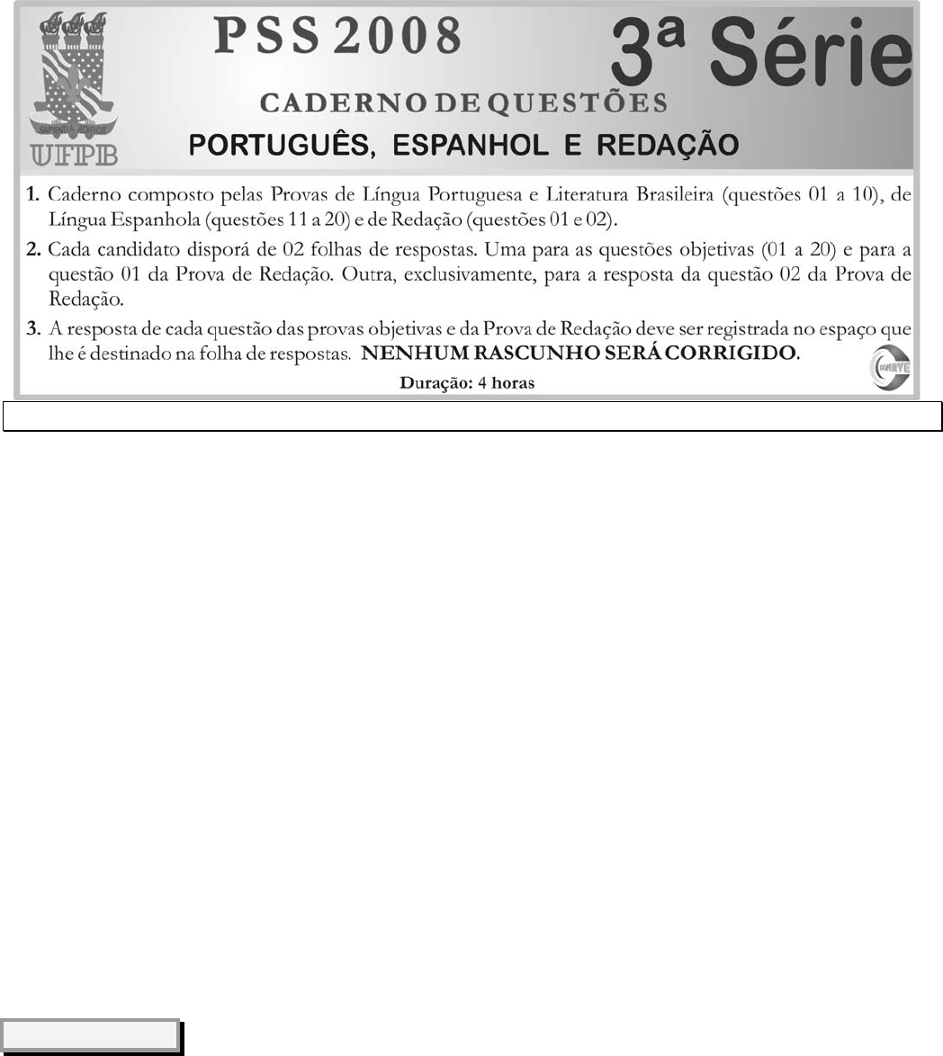 1 II –– LLÍÍNNGGUUAA PPOORRTTUUGGUUEESSAA EE LLIITTEERRAATTUURRAA BBRRAASSIILLEEIIRRAA Relacionamentos pessoais: vivências e surpresas Para responder às questões de 1 a 4, leia o TEXTO I a seguir: TRÊS IDADES 1 6 11 16 A vez primeira que te vi, Era eu menino e tu menina. Sorrias tanto... Havia em ti Graça de instinto, airosa e fina. Eras pequena, eras franzina... Ao ver-te, a rir numa gaivota, Meu coração entristeceu. Por quê? Relembro, nota a nota, Essa ária como enterneceu O meu olhar cheio do teu. Quando te vi segunda vez, Já eras moça, e com que encanto A adolescência em ti se fez! Flor em botão... Sorrias tanto... E o teu sorriso foi meu pranto... Já eras moça... Eu, um menino... Como contar-te o que passei? Seguiste alegre o teu destino... Em pobres versos te chorei. Teu caro nome abençoei. 21 26 31 Vejo-te agora. Oito anos faz, Oito anos faz que não te via... Quanta mudança o tempo traz Em tua atroz monotonia! Que é do teu riso de alegria? Foi bem cruel o teu desgosto. Essa tristeza é que mo diz... Ele marcou sobre o teu rosto A imperecível cicatriz: És triste até quando sorris... Porém teu vulto conservou A mesma graça ingênua e fina... A desventura te afeiçoou À tua imagem de menina. E estás delgada, estás franzina... (BANDEIRA, Manuel. Os melhores poemas. Seleção de Francisco de Assis Barbosa . 12 ed. São Paulo: Global, 1998, p.36-37). Questão 01 Considerando a visão que o eu lírico, em três momentos distintos, tivera da sua amada, identifique com V a(s) afirmativa(s) verdadeira(s) e com F, a(s) falsa(s): ( ) Na infância, o eu lírico deslumbra-se com a figura da amada, ressaltando, entre outros atributos, a alegria do seu sorriso, que, no entanto, o deixara tão triste. ( ) Na adolescência, o eu lírico encanta-se com o desabrochar da amada, vista por ele como “flor em botão”. ( ) Na fase adulta, o deslumbramento do eu lírico transforma-se em surpresa ao observar, na amada, apenas as suas mudanças físicas. ( ) Na fase adulta, o eu lírico observa que a amada resgata aquela mesma alegria da infância. A seqüência correta é: a) V V F F b) V F V F c) V F F V d) F V V F e) V F V V UFPB/PRG/COPERVE PSS-2008 2 Questão 02 De acordo com a 4ª estrofe, pode-se afirmar: I. A amada não correspondia ao amor do eu lírico, seguindo, com satisfação, um outro caminho. II. O obstáculo para a correspondência amorosa entre a amada e o eu lírico era apenas a diferença de idade entre eles. III. O eu lírico reconhecia-se um poeta menor, motivo pelo qual a amada o abandonara, seguindo seu destino. Está(ão) correta(s) apenas: a) II b) I c) III d) I e II e) II e III Questão 03 Leia o fragmento poético: “Flor em botão... Sorrias tanto ... E o teu sorriso foi meu pranto...” (versos 14 – 15) Nesses versos, o eu lírico a) confessa seu envolvimento com a adolescente, ainda que ela se mostrasse indiferente. b) revela que se apaixonou pela adolescente apenas por ela ser tão jovem. c) registra a oposição entre o seu estado de espírito e o da amada. d) lamenta não ter desfrutado o amor da amada por ela ser ainda uma adolescente. e) ressente-se do sorriso da amada, que desdenhava do seu sentimento. Questão 04 Nos versos a seguir, verifica-se o uso de figuras de linguagem cuja classificação está INCORRETA em: a) “O meu olhar cheio do teu.” ( 2ª estrofe) — Hipérbole b) “Flor em botão.... Sorrias tanto....” ( 3ª estrofe) — Metáfora c) “Ao ver-te, a rir numa gaivota,/ Meu coração entristeceu.”(2ª estrofe) — Antítese d) “E o teu sorriso foi meu pranto.” ( 3ª estrofe) — Ironia e) “Teu caro nome abençoei.” ( 4ª estrofe) — Hipérbato Para responder às questões de 5 a 10, leia o TEXTO II a seguir: A TERCEIRA MARGEM DO RIO 1 5 10 15 20 25 Nosso pai era homem cumpridor, ordeiro, positivo; e sido assim desde mocinho e menino, pelo que testemunharam as diversas sensatas pessoas, quando indaguei a informação. Do que eu mesmo me alembro, ele não figurava mais estúrdio nem mais triste do que os outros, conhecidos nossos. Só quieto. Nossa mãe era quem regia, e que ralhava no diário com a gente - minha irmã, meu irmão e eu. Mas se deu que, certo dia, nosso pai mandou fazer para si uma canoa. Era a sério. Encomendou a canoa especial, de pau de vinhático, pequena, mal com a tabuinha da popa, como para caber justo o remador. Mas teve de ser toda fabricada, escolhida forte e arqueada em rijo, própria para dever durar na água por uns 20 ou 30 anos. Nossa mãe jurou muito contra a idéia. Seria que, ele, que nessas artes não vadiava, se ia propor agora para pescarias e caçadas? Nosso pai nada não dizia. Nossa casa, no tempo, ainda era mais próxima do rio, obra de nem quarto de légua: o rio por aí se estendendo grande, fundo, calado que sempre. Largo, de não se poder ver a forma da outra beira. E esquecer não posso, do dia em que a canoa ficou pronta. Sem alegria nem cuidado, nosso pai encalcou o chapéu e decidiu um adeus para a gente. Nem falou outras palavras, não pegou matula e trouxa, não fez a alguma recomendação. Nossa mãe, a gente achou que ela ia esbravejar, mas persistiu somente alva de pálida, mascou o beiço e bramou: – “Cê vai, ocê fique, você nunca volte!” Nosso pai suspendeu a resposta. Espiou manso para mim, me acenando de vir também, por uns passos. Temi a ira de nossa mãe, mas obedeci, de vez de jeito. O rumo daquilo me animava, chega que um propósito perguntei: – “Pai, o senhor me leva junto, nessa sua canoa?” Ele só retornou a olhar em mim e me botou a bênção, com gesto me mandando para trás. Fiz que vim, mas ainda virei, na grota do mato, para saber. Nosso pai entrou na canoa e desamarrou, pelo remar. E a canoa saiu se indo – a sombra dela por igual, feito um jacaré, comprida longa. Nosso pai não voltou. Ele não tinha ido a nenhuma parte. Só executava a invenção de se permanecer naqueles espaços do rio, de meio a meio, sempre de