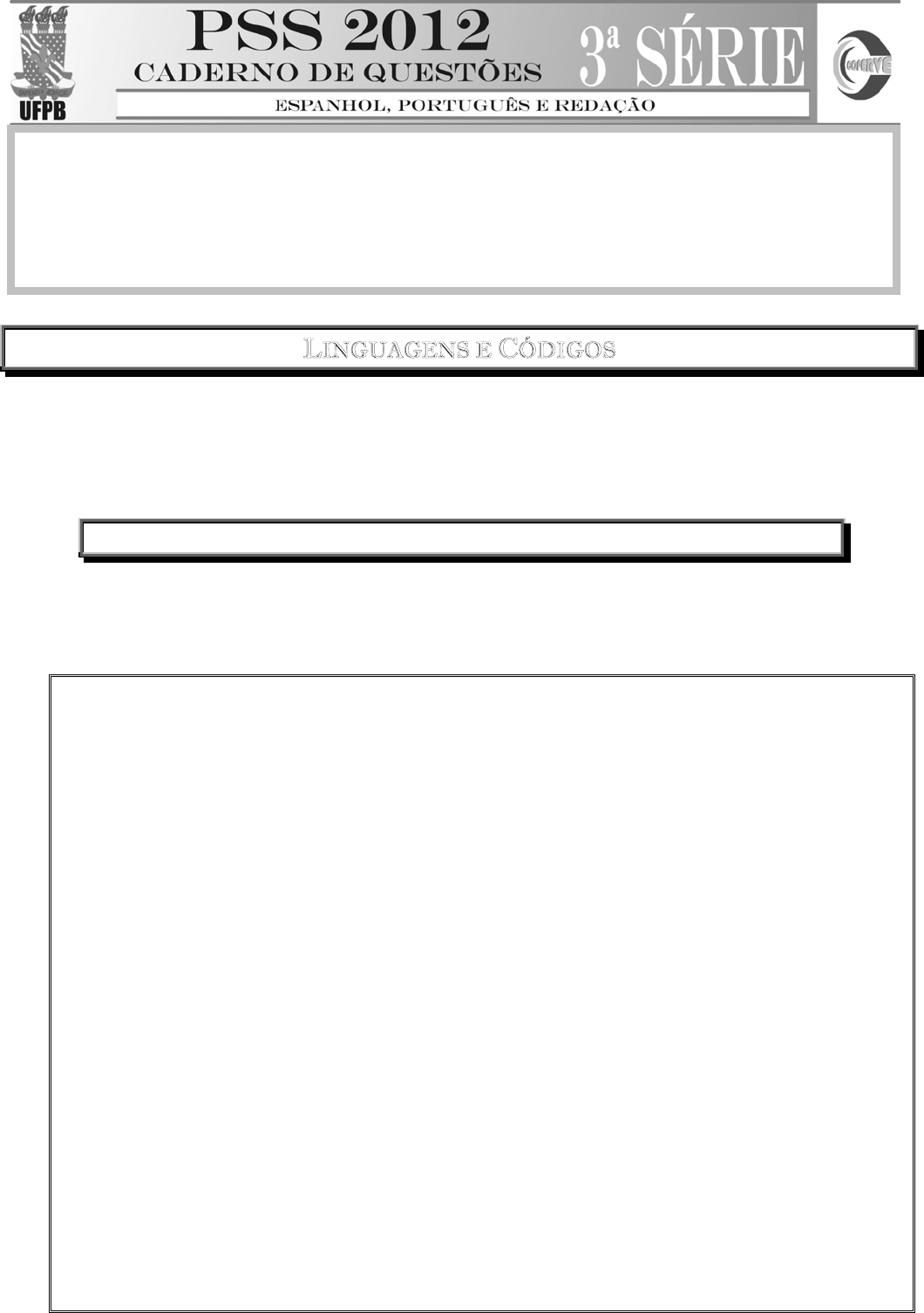 1. Caderno de questões com provas de Língua Espanhola (questões 01 a 08), de Língua Portuguesa e Literatura Brasileira (questões 09 a 16) e de Redação (questões 01 e 02). 2. Cada candidato receberá 02 Folhas de Resposta: uma para as questões objetivas (01 a 16); outra, exclusivamente, para as respostas às questões 01 e 02 da Prova de Redação. 3. A resposta de cada questão das provas objetivas e da Prova de Redação deve ser registrada no espaço que lhe é destinado na respectiva Folha de Resposta. NENHUM RASCUNHO SERÁ CORRIGIDO. Duração: 4 horas. 1 LINGUAGENS E CÓDIGOS Tema Vivências e valores II –– LLÍÍNNGGUUAA EESSPPAANNHHOOLLAA Lea el siguiente texto y responda a las cuestiones de 01 a 08. TEXTO I 1 5 10 15 20 La palabra, un valor para recuperar En medio de la cultura de “el papel es lo que vale”, la palabra empeñada tiene cada vez menos valor. Las personas criadas en el campo son fervientes defensores de este valor y son capaces de asegurar la venta de un terreno tan sólo con la palabra dada. En la agitada vida citadina, confiar en la palabra se ha convertido en sinónimo de ingenuidad. Pero aún más, en la familia empeñar la palabra y no cumplirla puede decantar más que en una desilusión, en una falta de confianza entre sus integrantes que terminará por alejarlos. Cuando se le promete a un niño: “si te vas a dormir ya, jugamos mañana”, ya estamos empeñando la palabra y si al día siguiente el padre se olvida de cumplir lo que dijo, el niño empezará a desconfiar de su sinceridad. Y si este fenómeno se repite en otras situaciones, con el paso del tiempo el adolescente no sólo no creerá en las promesas de su familia, también interiorizará que mantener la palabra no vale la pena. Pero, ¿qué significa mantener la palabra empeñada? “Significa que la palabra empeñada pasa a ser ley, por lo tanto, al hacernos cargo de las cosas señaladas debemos responder a la expectativa creada, y luego de ello mantener un protocolo de conducta que nos permite ser considerados personas creíbles”, comenta el psicólogo Carlos L. Rojas. El experto señala que así como enseñamos a nuestros hijos a ser honestos, a no mentir y ser respetuosos, también debemos enseñarles el valor de la palabra como una forma de cumplir con las promesas hechas y ser honorable. “En otras sociedades como la japonesa, el valor de la palabra y el honor que se desprende de cumplir las promesas es muy importante”, comenta Diego Castillo, sociólogo de la Universidad Nacional. Los valores son los cimientos de la vida personal, pero ante todo, de la calidad de la vida familiar que, a la larga, es una réplica de las relaciones con los demás. UFPB/PRG/COPERVE PSS-2012 2 25 30 María Cristina García, docente de ética de un prestigioso colegio de la ciudad, señala que constantemente se encuentra con que la palabra en los adolescentes es un valor cada vez más olvidado. “En varias ocasiones me he topado con chicos a quienes no les importa nada. Su actitud de desgana es tal, que parece que sus intereses no se inclinan a ninguna parte. Hablando con ellos, he podido darme cuenta que valores como mantener la palabra y la confianza están totalmente ausentes de su dinámica familiar”. La educadora señala que estos jóvenes no se comprometen con nada y que cuando lo hacen, no lo cumplen. “Tampoco confían en lo que se les dice, y en general son personas que se sienten abandonadas y desprotegidas”, señala María Cristina García. El psicólogo Carlos L. Rojas señala que no sólo los niños deben aprender, también los padres deben comprender que fomentar ellos mismos los valores es la mejor manera de transmitirlos a los hijos.[...] Disponível em: <http://camova.lacoctelera.net/post/2010/02/02/el-valor-la-palabra-dada>. Acesso em: 02 set. 2011. (Texto adaptado) 01. Tras leer el texto, es correcto afirmar que a) establecer diferencias entre campesinos y citadinos es productivo. b) fomentar discusiones sobre la honestidad es arriesgado. c) oponerse a lo que dicen los expertos en psicología es válido. d) discutir los valores enseñados en la familia es vano. e) tener una enseñanza basada en valores es importante. 02. Según el texto, una promesa hecha a un niño debe ser cumplida a) pues así se le inculca la noción de confianza y honestidad. b) para obstaculizar las relaciones entre la gente. c) para que las parejas tengan una relación duradera. d) una vez que la palabra no cumplida frustra a los padres. e) para evitar que los niños sean defensores del valor de la palabra. 03. En el fragmento “Los valores son los cimientos de la vida personal, pero ante todo, de la calidad de la vida familiar que, a la larga, es una réplica de las relaciones con los demás.” (líneas 20-21), la expresión en destaque señala a) la brevedad de la vida. d) la simulación de los hechos. b) el avance del tiempo. e) el adelanto de los acontecimientos. c) el retraso de los años. 04. De acuerdo con lo que opina Carlos L. Rojas, a) los japoneses son ejemplo de una sociedad honorable. b) el sentimiento de abandono se aleja con promesas hechas. c) los hijos reflejan lo que les enseñan sus padres. d) la palabra cumplida crea expectativas. e) las personas del campo son más ingenuas. 05. En el fragmento “En varias ocasiones me he topado con chicos a quienes no les importa nada[...]” (línea 24), la forma verbal destacada a) narra hábitos y costumbres pasados. b) describe acciones que ocurrieron en un pasado lejano. c) se refiere a dos acciones paralelas. d) evoca el pasado marcado por períodos concretos. e) indica una acción pasada pero sin precisar el momento. UFPB/PRG/COPERVE PSS-2012 3 ATENÇÃO: As questões de 06 a 08 apresentam mais de uma afirmativa correta. Preencha, na FOLHA DE RESPOSTA, apenas os espaços (bolhas) correspondentes às afirmativas corretas. 06. Basándose en lo que se dice en el texto acerca de la palabra empeñada, identifique las sentencias correct