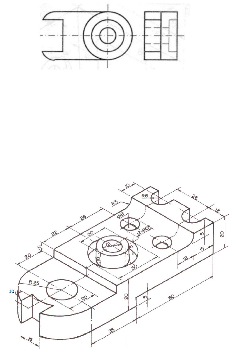 AD2 - Desenho - Engenharia de Produção - 2017-1 1) Para as vista abaixo, no primeiro diedro, completar a vista faltante (vista superior) e fazer um esboço da perspectiva da peça (2,0). 2) Desenhe com instrumento e no terceiro diedro as vistas ortográficas correspondentes à peça apresentada em perspectiva na figura abaixo. Escolha as vistas e a escala adequadas à centralização dos desenhos na folha de desenho, legendada e margeada no padrão Cefet/RJ, e à distribuição das cotas. As unidade indicadas estão em mm. Todos os furos são passantes. Utilize corte se for necessário (4,0). 3) Para a peça apresentada abaixo em perspectiva, representá-la em tantas vistas quanto julgar necessário (inclusive a de corte) no primeiro diedro, mostrando a montagem desta peça em uma chapa de 15 mm de espessura, 140 mm de comprimento e 140 mm de largura. A fixação deve ser feita através de 02 (dois) parafusos Allen (usar os furos de ∅13mm). Representar o parafuso separadamente com suas dimensões principais. Todos os furos são passantes. Usar a folha de desenho, legendada e margeada no padrão Cefet/RJ. As unidades indicadas estão em mm. Em esboço e cotado.(4,0 pontos).