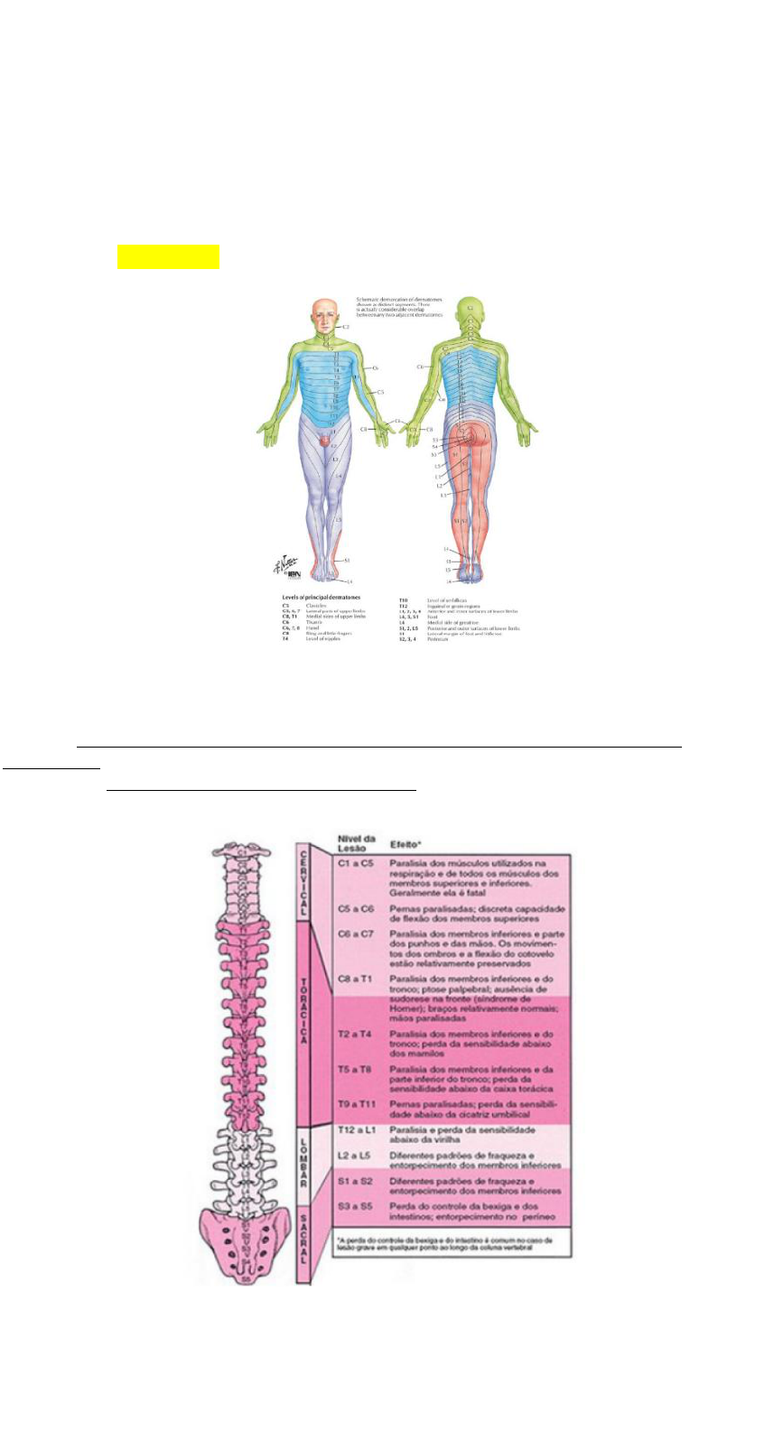 Inervação corporal. O tecido mesodérmico é dividido em 38 a 40 pares de unidades, chamadas somitos. Esses somitos assim como a medula tem organização craniocaudal e obedecem a segmentação medular sendo assim, existem 8 somitos cervicais, 12 torácicos, 5 lombares, 5 sacrais e 8 a 10 coccígeos. Desse modo para cada um dos somitos existe uma vértebra correspondente e um segmento espinhal. Cada segmento fornece inervação motora e sensorial da pele e do músculo da parte do corpo derivada desse somito associado. Os segmentos cervicais inervam a pele e o músculo da parte posterior da cabeça, pescoço e braços, os torácicos inervam o tronco e os segmentos lombares e sacrais inervam as pernas e região perineal. Essas áreas supridas por axônios de uma única raiz são chamadas de dermátomo, que também possuem organização segmentar (ver figura). (Fonte: Google Images) O dermátomo apesar de receber sua maior inervação do segmento correspondente da medula, ramos colaterais de segmentos espinhais adjacentes também suprem o dermátomo. Assim mesmo havendo secção da raiz dorsal correspondente ao dermátomo, não causa perda sensorial completa, pois um segmento abaixo e acima completam a inervação desse dermátomo. Referências: KOEPPEN, B.; SANTON, B. Berne & Levy Fisiologia. 6ª ed. Rio de Janeiro: Elsevier, 2009. MARTIN, John H. Neuroanatomia: texto e atlas. 4ª ed. Porto Alegre: Artmed, 2013.