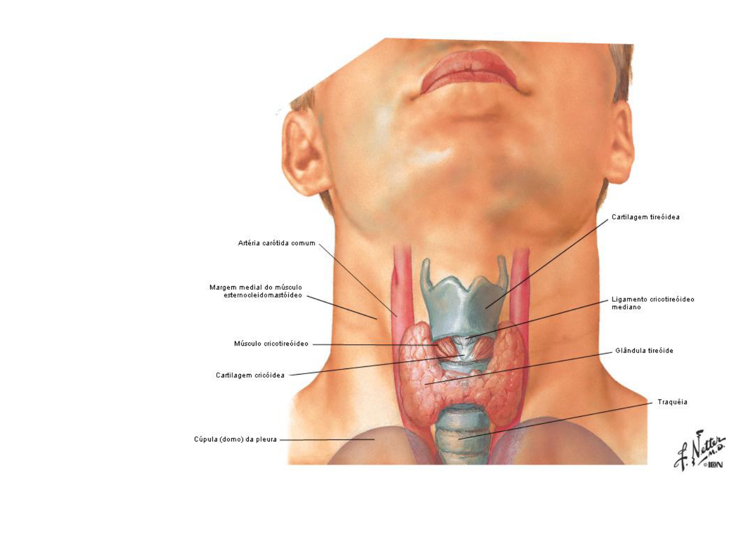 Glândula Tireóide •Situa-se no plano mediano do pescoço, abraçando parte da traqueia e da laringe. •Tem a forma de um H ou de um U. Possui dois lobos (direito e esquerdo) unidos pelo istmo. •Do istmo, eventualmente, sobe um prolongamento em forma de cone, lobo piramidal. •Varia de forma e tamanho. Um pouco maior nas mulheres que nos homens. •Produz os hormônios T3, T4 e calcitonina.