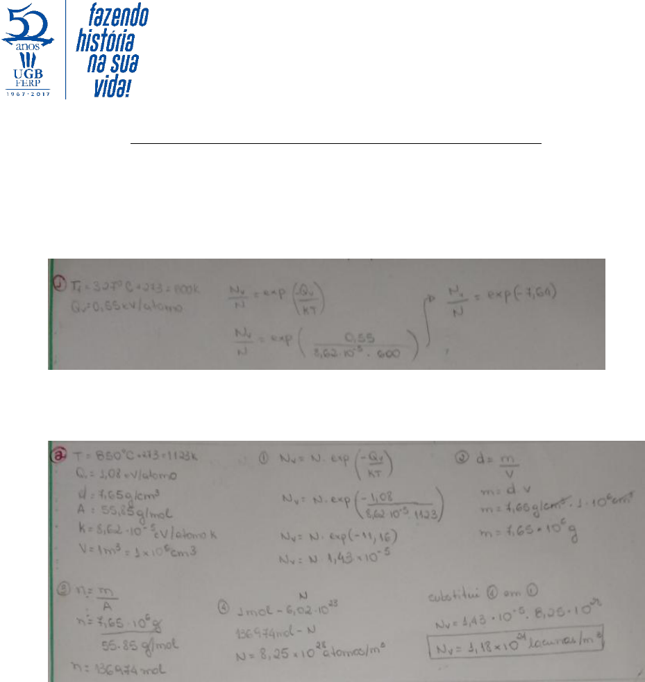 FUNDAÇÃO EDUCACIONAL ROSEMAR PIMENTEL CENTRO UNIVERSITÁRIO GERALDO DI BIASE INSTITUTO DE CIÊNC. EXATAS, DA TERRA E ENG. CURSO DE ENGENHARIA MECÂNICA LISTA DE EXERCÍCIOS - IMPERFEIÇÕES CRISTALINAS Calcule a fração dos sítios atômicos que estão vagos para o chumbo na sua temperatura de fusão de 327°C (600°F). Suponha uma energia para a formação de lacunas equivalente a 0,55 eV/átomo. R: Calcule o número de lacunas por metro cúbico no ferro a 850°C. A energia para a formação de lacunas é de 1,08 eV/átomo. Adicionalmente, a densidade e o peso atômico para o Fe são 7,65 g/cm3 e 55,85 g/mol, respectivamente. R: Abaixo, estão tabulados os valores para o raio atômico, a estrutura cristalina, a eletronegatividade e as valências mais comuns para vários elementos. Para aqueles que são não-metais, apenas os raios atômicos estão indicados. Quais desses elementos você esperaria que formassem o seguinte com o cobre: Uma solução sólida substitucional com solubilidade completa? R: Ni, pois tem a mesma estrutura cristalina e a mesma valência. Uma solução sólida substitucional com solubilidade incompleta? R: Ag, Ar, Co, Fe, Pd, Pt, Zn, apresentam ou estruturas cristalinas diferentes ou raio atômico maior que 15%. Uma solução sólida intersticial? R: C, H, O, pois tem raio atômico muito pequeno. Descreva os tipos de imperfeições cristalinas e exemplifique-os. R: Defeitos Pontuais – É a lacuna, ou seja, a ausência de átomo em uma posição atômica. Defeitos de linha – São as discordâncias onde diversos átomos estão desalinhados e provocam uma distorção na estrutura cristalina. Defeitos de interface – São defeitos superficiais que compreendem regiões do material com diferentes estruturas cristalinas. Defeitos Volumétricos – Podem ser inclusões de impurezas, aglomerados de partículas diferentes da matriz, porosidade devido a presença de gases. Dados dois materiais com diferentes tamanhos de grão, grosseiro e refinado, qual deles apresentará maior resistência mecânica? Justifique a resposta. R: O de maior resistência será o de grão refinado, pois eles possuem um número maior de contornos de grão. O número do tamanho de grão (n na equação N = 2n-1) aumenta ou diminui com a diminuição do tamanho do grão? Por quê? R: n aumenta com o aumento de N. Pois a medida que N aumenta o tamanho do grão diminui,, logo n aumenta com a diminuição do tamanho do grão. REFERÊNCIAS: NOTAS DE AULA CALLISTER JR, W. D. Ciência e engenharia de materiais: uma introdução. Rio de Janeiro, Editora LTC, 2012. ENTREGA: Apresentar na aula da semana que antecede a avaliação, impreterivelmente.