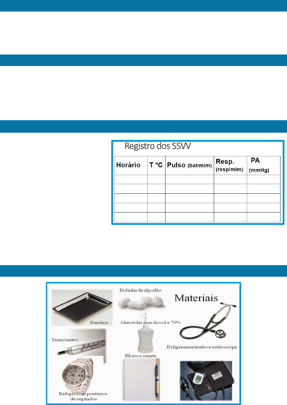 SINAIS VITAIS CONCEITO São os sinais das funções orgânicas básicas, sinais clínicos de vida, que refletem o equilíbrio ou o desequilíbrio resultante das interações entre os sistemas do organismo e determinada doença. Os quatros sinais vitais monitorados rotineiramente são: Pulso, Temperatura, Respiração, Pressão arterial e Dor. FINALIDADES • Monitorar o estado geral; • Identificar anormalidades do funcionamento corporal; • Propor formas de tratamento; • Acompanhar a avaliação da pessoa submetida a exames e tratamentos; • Auxiliar na confirmação da morte. QUANDO VERIFICAR? • Na admissão; • Dentro da rotina de atendimento; • Pré-consulta, consulta hospitalar ou ambulatorial; • Antes e depois de qualquer procedimento cirúrgico; • Antes e depois de qualquer procedimento invasivo de diagnóstico; • Antes e depois da administração de medicamentos que afetam as funções cardiovasculares, respiratórias e de controle da temperatura; • Sempre que o paciente manifestar quaisquer sintomas inespecíficos de desconforto físico. MATERIAIS Becca Realce Becca Realce Becca Realce Becca Realce Becca Realce Becca Realce Becca Realce Becca Realce 2 PULSO • Reflete a quantidade de sangue ejetada a cada batimento cardíaco; • Normal: 60 a 100 bpm • Pulso radial é o mais facilmente acessado; • Nas emergências cardiovasculares, palpe o pulso femoral ou o carotídeo. • Achados anormais: Ritmo de pulso irregular (fibrilação atrial). • Observe frequência, ritmo e amplitude. 1. Frequência e seus valores normais: a) Recém-nascido=120 a 140 bpm b) Lactente=100 a 120 bpm c) Segunda infância=80 a 100 bpm d) Adulto=60 a 80 bpm 2. Volume: distingue subjetivamente se pulso é cheio ou pulso fino. 3. Ritmo: rítmico ou regular e arrítmico ou irregular. • Tipos de pulso: 1. Hipercinético ou célere 2. Hipocinético, fraco ou fino • Locais de aferição do pulso: • Medida do pulso: 1. Lavar as mãos; 2. Orientar o paciente quanto ao procedimento; 3. Colocar o paciente em posição confortável (sentado ou deitado), mas sempre com o braço apoiado; 4. Apalpar o pulso escolhido sem fazer muita compressão; 5. Contar durante 60 seg.; Becca Realce Becca Realce Becca Realce Becca Realce Becca Realce Becca Realce Becca Realce Becca Realce Becca Realce Becca Realce Becca Realce Becca Realce Becca Realce 3 6. Lavar as mãos e registrar no prontuário. RESPIRAÇÃO • Normal: Frequência respiratória (FR) = 16 a 20respirações/minuto. • Determine se a respiração é superficial, moderada ou profunda. • Observe ritmo e simetria • Lembre-se que deformidades esqueléticas, costelas fraturadas e tecido pulmonar colabado podem provocar expansão torácica desigual. • Medida da FR: 1. Paciente em repouso por 5 a 10 min; 2. Assegurar que o tórax esteja exposto; 3. Estando ainda verificando o pulso observar o padrão respiratório; 4. Contar por 30 seg e multiplicar por 2; 5. Se os movimentos respiratórios são anormais contar por 60 seg.; 6. Verificar profundidade das excursões respiratórias; 7. Verificar expansão do tórax e simetria; 8. Registrar se o paciente está recebendo suplementação de oxigênio; 9. Dentro do possível inquirir o paciente sobre a sua percepção de dispneia. • Tipos de movimentos respiratórios: 1. Torácico ou costal 2. Abdominal ou diafragmático • Achados anormais: 1. Uso dos músculos do pescoço(esternocleidomastóideos) e abdominais para respiração; 2. Expiração prolongada, sugerindo estreitamento bronquiolar; 3. Sibilo ou estridor. • Terminologia do Sistema Respiratório: 1. Dispneia: sensação de dificuldade para respirar. 2. Eupneia: respiração normal, silenciosa e sem esforços 3. Taquipneia: aceleração do ritmo respiratório 4. Bradpneia: lentidão anormal da respiração 5. Apneia: suspensão momentânea da respiração 6. Ortopneia: dificuldade respiratória que ocorre quando a pessoa está deitada, fazendo com que a pessoa tenha que dormir elevada na cama (usando vários travesseiros para dormir) ou sentada em uma cadeira 7. Hiperpneia: aceleração e intensificação dos movimentos respiratórios 8. Hiperventilação: condição que se estabelece quando a ventilação pulmonar é maior que a necessária para a eliminação de CO2. TEMPERATURA • Capacidade de o organismo manter a sua temperatura central relativamente estável, mesmo com a variação da temperatura ambiental, proporcionando um bom funcionamento corporal-metabólico. • Mensurada e registrada em Celsius ºC. As vias são timpânica, oral, retal ou axilar. Becca Realce Becca Realce Becca Realce Becca Realce Becca Realce Becca Realce Becca Realce Becca Realce Becca Realce Becca Realce Becca Realce Becca Realce Becca Realce Becca Realce Becca Realce Becca Realce Becca Realce Becca Realce Becca Realce Becca Realce Becca Realce Becca Realce Becca Realce Becca Realce Becca Realce Becca Realce Becca Realce Becca Realce Becca Realce Becca Realce Becca Realce Becca Realce Becca Realce Becca Realce Becca Realce Becca Realce 4 • Tipos de termômetro: • Vias para aferir a temperatura: 1. Via oral: acessível e confortável para o paciente. Entretanto, é afetada pela ingestão de líquidos e alimentos. Contraindicada em pacientes que foram submetidos a cirurgias orais. 2. Via axilar: acessível, segura e não invasiva. Tempo de aferição longo e contraindicado em casos de trauma e queimadura de tórax. 3. Via retal: mais confiável e precisa, entretanto, é constrangedora, exige posicionamento adequado e lubrificação. Contraindicada em casos de diarreia, cirurgias retais e processos inflamatórios locais. 4. Via timpânica: confiável e precisa, porém, não muito utilizado nos hospitais devido ao custo do termômetro. • Características das vias: • Febre: Significa temperatura corpórea acima da faixa de normalidade (entre 36 e 37,4 graus). 1. Causas: patologias, ferimentos e emoções. 2. Início: Pode ser súbito ou gradu