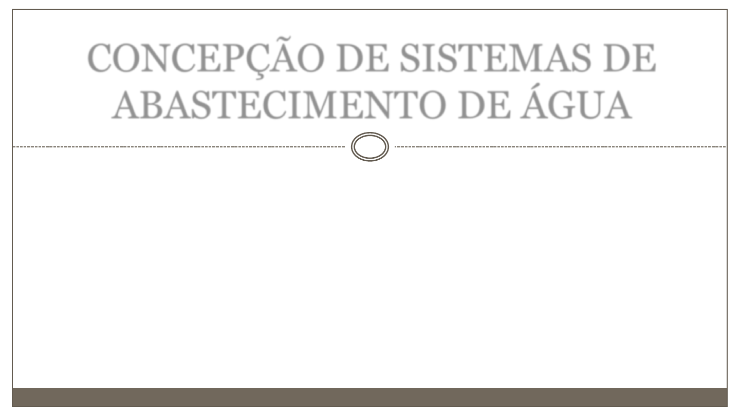 F A C U L D A D E M E T R O P O L I T A N A D E M A N A U S F A M E T R O P R O F . ª D R . L U C I A N E F A R I A S R I B A S A G O S T O - 2 0 1 8 CONCEPÇÃO DE SISTEMAS DE ABASTECIMENTO DE ÁGUA Conteúdo Definição Partes de um sistema de abastecimento de água Normas para projetos de sistemas de abastecimento de água Estudo de concepção de sistema de abastecimento de água Concepção de sistemas de abastecimento de água Consumo de água Definição e objetivos Definição e objetivos Entende-se por concepção de sistema de abastecimento de água um conjunto de estudos e conclusões referentes ao estabelecimento de todas diretrizes, parâmetros e definições necessárias e suficientes para a caracterização completa do sistema a projetar. Definição e objetivos No conjunto de atividades que constitui a elaboração de um sistema de abastecimento de água, a concepção é elaborada na fase inicial do projeto. O estudo de concepção pode, às vezes, ser precedido de um diagnóstico técnico e ambiental da área em estudo ou, até mesmo, de um Plano Diretor da bacia hidrográfica. Definição e objetivos Basicamente, a concepção tem como objetivos: Identificação e quantificação de todos os fatores intervenientes com o sistema de abastecimento de água; Diagnóstico do sistema existente, considerando a situação atual e futura; Estabelecimento de todos os parâmetros básicos de projeto; Pré-dimensionamento das unidades dos sistemas, para as alternativas selecionadas; Escolha da alternativa mais adequada mediante comparação técnica econômica e ambiental, entre as alternativas; Estabelecimento das diretrizes gerais de projeto e estimativas das quantidades de servições que devem ser executados na fase de projeto. Partes de um sistema de abastecimento de água Partes de um sistema de abastecimento de água A concepção deverá estender-se aos diversos componentes do sistema de abastecimento de água e definidas a seguir: Manancial É o corpo de água superficial ou subterrâneo, de onde é retirada a água para o abastecimento. Deve fornecer vazão suficiente para atender a demanda de água no período de projeto, e a qualidade dessa água deve ser adequada sob o ponto de vista sanitário Captação Conjunto de estruturas e dispositivos, construídos ou montados junto ao manancial, para a retirada de água destinada ao sistema de abastecimento. Estação elevatória Conjunto de obras e equipamentos destinados a recalcar a água para a unidade seguinte. Em sistemas de abastecimento de água, geralmente há várias estações elevatórias, tanto para o recalque de água bruta, como para o recalque de água tratada. Também é comum a estação elevatória, tipo “booster”, que se destina a aumentar a pressão e/ou vazão em adutoras ou redes de distribuição de água. Adutora Canalização que se destina conduzir água entre as unidades que precedem a rede de distribuição. Não distribuem a água aos consumidores, mas podem existir as derivações que são sub-adutoras. Estação de tratamento de água Conjunto de unidades destinado a tratar a água de modo a adequar as suas características aos padrões de potabilidade. Reservatório É o elemento do sistema de distribuição de água destinado a regularizar as variações entre as vazões de adução e de distribuição e condicionar as pressões na rede de distribuição. Rede de distribuição Parte do sistema de abastecimento de água formada de tubulações e orgãos acessórios, destinada a colocar água potável à disposição dos consumidores, de forma contínua, em quantidade e pressão recomendada. Partes de um sistema de abastecimento de água A tabela 2.1 apresenta indicadores de custo de implantação de sistema convencional de abastecimento de água. Normas para projetos de sistemas de abastecimento de água Normas para projetos de sistemas de abastecimento de água As normas da ABNT para projetos de sistemas de abastecimento de água: Estudo de concepção de sistema de abastecimento de água Estudo de concepção de sistema de abastecimento de água Para o estudo de concepção de sistemas de abastecimento de água, é necessário o desenvolvimento de uma série de atividades, sendo as principais listadas a seguir: Caracterização da área de estudo Análise do sistema de abastecimento de água existente Levantamento dos estudos e planos existentes Estudos demográficos e de uso e ocupação do solo Critérios e parâmetros de projeto Demanda de água Estudo de mananciais Formulação de alterativas de concepção Pré-dimensionamento das unidades dos sistemas considerados para a escolha da alternativa Estimativa de custo das alternativas propostas Análise de alternativas propostas Concepção escolhida Características Físicas Uso e ocupação do solo Mapa de localização Principais vias e estradas de acesso Topografia, relevo e geologia Vegetação Bacia hidrografica Planos diretores municipais e regionais Identificação de áreas protegidas ambientalmente ou com restrições à ocupação Uso e ocupação atual do solo Caracterização da área de estudo Aspectos sociais e econômicos Sistemas de infra-estrutura e condições sanitárias Atividades econômicas Caracterização do mercado de trabalho e mão-de –obra disponível Distribuição da renda Indicadores sócio-econômicos Abastecimento de água Esgoto sanitário Resíduos sólidos urbanos, industriais, hospitalares e dos sistemas de saneamento: coleta, tratamento e disposição final; Licenciamento ambiental Sistema de drenagem Saúde Sistema viário Energia elétrica Caracterização da área de estudo Descrição do sistema existente Diagnóstico do sistema existente Identificação de todos os elementos do sistema existente com planta geral, croqui e descrição de todas as unidades. Devem ser descritas as características principais das unidades. Área atendida População atendida e nível de atendimento Regularidad