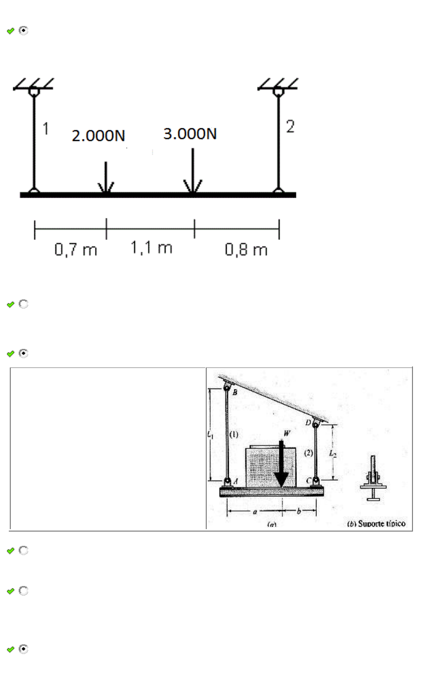 ASSINALE A OPÇÃO CORRETA EM RELAÇÃO A DUCTIBILIDADE: PROPRIEDADE QUE REPRESENTA O GRAU DE DEFORMAÇÃO QUE UM MATERIAL SUPORTA ANTES DE SUA RUPTURA. Calcule as forças de tração nos dois cabos da figura. F1 = 2384,62N; F2 = 2615,38N Marque a alternativa em que se classifica o equilíbrio cujo arranjo de forças atuantes sobre determinado corpo em repouso de modo que a resultante dessas forças tenha módulo igual a zero. Estático A estrutura apresentada foi calculada para suportar uma Máquina de Ar Condicionado de um prédio comercial que pesa W=6 kN e as distâncias a e b valem , respectivamente, 4m e 2m. Responda a afirmativa correta (considere as vigas horizontais rígidas e com peso desprezível). As forças atuantes nas Barras AB e CD valem 2 kN e 4 kN, respectivamente Qual a consequência do aumento do teor de carbono em uma liga de ferro-carbono? Aumento da dureza. Um material pode sofrer um esforço que se desenvolve quando as cargas externas tendem a torcer um segmento do corpo com relação a outro. Este movimento pode levar a fratura de um material. A qual classificação de aplicação de carga representa tal condição? Torque As estruturas podem ser classificadas de acordo com o número de reações de apoio para sustentação de uma estrutura mantendo um equilíbrio estático. Marque a alternativa que representa os tipos de estrutura que não permitem movimento na horizontal nem na vertical, ou seja o número de incógnitas à determinar é igual ao número de equações de equilíbrio. Isoestáticas Marque a afirmativa que considerar correta observando a figura ao lado e considerando que as vidas horizontais: • são rígidas • possuem peso próprio desprezível A Força AH vale 125 N e a DE vale aproximadamente 83 N Considere a estrutura abaixo e determine as reações nos apoios A e B. RAx = 3t; RBy = 2t e RAy = 2t Um fio de cobre, com diâmetro de 3 mm, está submetido a uma carga axial de tração de 400 N, qual a tensão de tração a que estará sujeito. 56,6 MPa Um tudo de diâmetro esterno 30 mm e diâmetro interno 10 mm é submetido a tração por uma força de 2kN. Determine a tensão média que atua na seção reta deste tubo. 3,2 MPa A viga suporta a carga distribuída mostrada. Determine as cargas internas resultantes nas seções transversais que passam pelo ponto C. Considere que as reações nos apoios A e B sejam verticais. Vc = 3,92 KN e Mc = 15,07 KN.m A coluna está submetida a uma força axial de 8 kN no seu topo. Supondo que a seção transversal tenha as dimensões mostradas na figura, determinar a tensão normal média que atua sobre a seção a-a. 1,82 MPa Marque a alternativa que representa a característica do material que quando submetido a ensaio de tração e não apresenta deformação plástica, passando da deformação elástica para o rompimento. Frágil Um fio, com diâmetro de 6 mm, está submetido a uma carga axial de tração de 3 kN, qual a tensão de tração a que estará sujeito. 106 MPa Uma carga P aplicada a uma barra de aço é induzida para um suporte de madeira por intermédio de uma arruela, de diâmetro interno de 30 mm e de diâmetro externo d. A tensão normal axial na barra de aço é de 40 MPa e a tensão média de esmagamento entre a peça de madeira e a arruela não deve exceder a 4 MPa. Calcule o valor da carga aplicada em N. 282,7 Calcular a tensão de cisalhamento no rebite que une as duas chapas de aço conforme mostrado na figura. A força P tem intensidade 20 KN. 7,06 kN/cm2 A grandeza "Tensão", muito empregada em calculo estrutural e resistência dos materiais, é uma grandeza vetorial, cuja definição é muito semelhante a grandeza escalar "pressão", e assim ambas gozam das mesmas unidades de medida. Das alternativas abaixo, assinale a que não corresponde a unidade de medida destas grandezas. kN/lbf2 A barra prismática da figura está submetida a uma força axial de tração. Considerando que a área da seção transversal desta barra é igual a A, a tensão de cisalhamento média τ na seção S inclinada de 60o vale: 0,433P/A Uma barra redonda de aço, com diâmetro de 20mm, apresenta uma carga de ruptura de 9.000kg. Determine a resistência à tração desse aço em kg/cm2. 2866 No conjunto abaixo, o bloco sustentado pela corda tem peso W = 100N. Se o diâmetro da corda vale 10mm, a tensão normal suportada pela mesma vale: 1,27 MPa Calcular o diâmetro de um tirante que sustente, com segurança, uma carga de 10000N. O material do tirante tem limite de escoamento a tração de 600 N / mm2. Considere 2 como coeficiente de segurança 6,52 mm Uma mola não deformada, de comprimento 30 cm e constante elástica 10N/cm, aplica-se um peso se 25 N. Qual o elongamento sofrido por ela, em cm? 2,5 Calcule a tensão verdadeira de ruptura de um fio de cobre, em kgf/mm2, que possui uma tensão de ruptura de 30 kgf/mm2 e apresenta uma estricção de 77%. 130,43 Determine a carga máxima admitida, em kg, por uma barra que suporta 50.000 kg antes da ruptura, onde esta apresenta um coeficiente de segurança igual a 5. 10000 Um edifício de dois pavimentos possui colunas AB no primeiro andar e BC no segundo andar (vide figura). As colunas são carregadas como mostrado na figura, com a carga de teto P1 igual a 445 kN e a carga P2, aplicada no segundo andar, igual a 800 kN. As áreas das seções transversais das colunas superiores e inferiores são 3900 mm2 e 11000 mm2, respectivamente, e cada coluna possui um comprimento a = 3,65 m. Admitindo que E = 200 GPa, calcule o deslocamento vertical c no ponto C devido às cargas aplicadas. 4,15 mm CONSIDERANDO O GRÁFICO DE UM MATERIAL FRÁGIL É CORRETO AFIRMAR QUE: MATERIAL FRÁGIL NÃO OBEDECE A LEI DE HOOKE. Levando em consideração uma estrutura ao solo ou a outras partes da mesma vinculada ao solo, de modo a ficar assegurada sua imobilidade, salve pequenos deslocamentos devidos às deformações. A este conceito pode-se considerar qual tipo de ação? Reação 