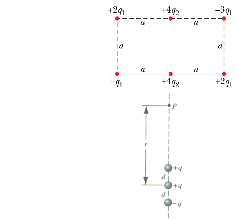 Lista de exercı´cios 3 – Capı´tulo 23 Tipler & Mosca 1. Um campo ele´trico uniforme de 2kN/m atua na direc¸a˜o x. Uma carga puntiforme positiva Q = 3µC e´ abandonada do repouso na origem. (a) qual e´ a direc¸a˜o de potencial V (4m)−V (0)? (b) Qual e´ a variac¸a˜o na energia potencial da carga desde x = 0 ate´ x = 4m? (c) Qual e´ a energia cine´tica da carga quando ela e´ posicionada em x= 4m? (d) Determine a func¸a˜o potencialV (x) considerando que seja nula em x= 0, (e) considerando que seja igual a 4kV em x= 0, e (f) considerando que seja nula em x= 1m. 2. Quatro cargas puntiformes de 2µC sa˜o posicionadas nos ve´rtices de um quadrado de 4m de lado. Deter- mine o potencial no centro do quadrado (relativamente a um potencial nulo no infinito) se (a) todas as cargas forem positivas, (b) treˆs das cargas forem positivas e uma negativa e (c) duas forem positivas e duas forem negativas. 3. Uma esfera com 60cm de raio tem seu centro na origem. Cargas ideˆnticas de 3µC sa˜o colocadas a intervalos de 60◦ ao longo do plano equatorial da esfera. (a) Qual e´ o valor do potencial ele´trico na origem? (b) Qual e´ o valor do potencial ele´trico no po´lo norte? 4. A figura ao lado mostra um conjunto de partı´culas carregadas, com distaˆncia a = 39cm e as cargas mostradas sa˜o mu´ltiplos de q1 = 3,4pC e q2 = 6,0pC. Considerando V = 0 no infinito, qual e´ o valor do potencial no centro do retaˆngulo? 5. Para a configurac¸a˜o de carga mostrado abaixo, mostre que V (r) para pontos sobre o eixo vertical, supondo r� d, e´ dado por V = kq r ( 1+ 2d r ) 1 6. Qual e´ o potencial resultante no ponto P devido a`s quatro car- gas puntiformes, tomando-se V = 0 no infinito, q = 5 fC e d = 4cm? 7. Duas cargas positivas +q sa˜o posicionadas sobre o eixo x em x=+a e x=−a. (a) Determine a func¸a˜o potencial V (x) em func¸a˜o de x para os pontos sobre o eixo x. (b) Fac¸a um esquema da curva representa- tiva da func¸a˜o V (x) versus x. (c) Qual e´ o significado do ponto de mı´nimo nessa curva? 8. Uma carga puntiforme de +3e e´ posicionada na origem e uma segunda carga puntiforme de −2e e´ posicionada sobre o eixo x em x= a. (a) Fac¸a um esquema da func¸a˜o potencial V (x) versus x para todo x. (b) Em que ponto ou pontos o potencial V (x) e´ nulo? (c) Qual e´ o valor do trabalho necessa´rio para trazer uma terceira carga de +e para o ponto x= a/2 sobre o eixo x? 9. Um campo ele´trico uniforme atua no sentido positivo da direc¸a˜o y. Os pontos a e b esta˜o sobre o eixo y, a em y = 2m e b em y = 6m. (a) A diferenc¸a de potencial Vb−Va e´ positiva ou negativa? (b) Se o mo´dulo de Vb−Va for de 2×104V , qual sera´ o mo´dulo E do campo ele´trico? 10. Uma carga q e´ posicionada em x = 0 e uma carga −3q e´ posicionada em x = 1m. (a) Determine V (x) para um ponto gene´rico sobre o eixo x. (b) Determine os pontos sobre o eixo x onde o potencial e´ nulo. (c) Qual e´ o valor do campo ele´trico nesses pontos? (d) Fac¸a um esquema mostrando a curvaV (x) versus x. 11. Treˆs cargas ideˆnticas sa˜o colocadas sobre o plano xy. Duas esta˜o sobre o eixo y em y=−a e y=+a, e a terceira esta´ sobre o eixo x em x = a. (a) Qual e´ o potencialV (x) devido a essas cargas em um ponto qualquer sobre o eixo x? (b) Determine Ex ao longo do eixo x a partir da func¸a˜o potencial V (x). Analise suas respostas para os itens (a) e (b) na origem e em x= ∞ para verificar se elas fornecem os resultados esperados. 12. Uma barra de comprimento L possui carga Q uniformemente distribuı´da ao longo de seu comprimento. A Barra apo´ia-se no eixo y com seu centro na origem. (a) Determine o potencial ele´trico em func¸a˜o da posic¸a˜o ao longo do eixo x. (b) Mostre que o resultado obtido no item (a) reduz-se a V = kQ/x para x� L. 13. Um disco de raio R possui distribuic¸a˜o superficial de carga expressa por σ = σ0R/r. (a) Determine a carga total no disco. (b) Determine o potencial ele´trico sobre o eixo do disco a uma distaˆncia x de seu centro. 2 14. Um disco de raio R possui tem densidade de carga +σ0para r < a e densidade de carga igual e oposta −σ0para a< r< R. A carga total do disco e´ igual a 0. (a) Determine o potencial ele´trico a uma distaˆncia x ao longo do eixo x do disco. (b) Obtenha uma expressa˜o aproximada para V (x) quando x� R. 15. Um disco pla´stico de raio R= 64cm e´ carregado sobre um lado com uma densidade superficial de carga σ = 7,73 fC/m2, e a seguir, treˆs quadrantes do disco sa˜o retirados. O quadrante que resta, e´ mostrado na figura. Com V = 0 no infinito, qual e´ o potencial criado por esse quadrante no ponto P, que esta´ sobre o dentral do disco original a uma distaˆncia D= 25,9cm? 16. A figura abaixo msotra treˆs arcos circulares na˜o-condutores de raio R = 8,50cm. As cargas dos arcos sa˜o q1 = 4,52pC, q2 =−2q1, q3 = +3q1. Com V = 0 no infinito, qual e´ o potencial ele´trico resultante devido aos arcos no centro comum? 17. Um ele´tron e´ solto do repouso no eixo de um dipolo ele´trico que tem carga e e separac¸a˜o d = 20pm e que e´ fixo. O ponto de liberac¸a˜o e´ do lado positivo do dipolo, a uma distaˆncia 7d do centro do dipolo. Qual e´ a velocidade do ele´tron quando ele alcanc¸a um ponto 5d do centro do dipolo? 3 18. A figura abaixo mostra um anel de raio externo R= 13cm, e raio interno r = 0,2R, e densidade de carga superficial uniforme σ = 6,2pC/m2. Com V = 0 no infinito, determine o potencial ele´trico no ponto P no eixo central do anel, a uma distaˆncia z= 2R do centro do anel. 19. Uma casca esfe´rica condutora de raio interno b e raio externo c e´ conceˆntrica com uma pequena esfera meta´lica de raio a < b. A esfera meta´lica apresenta carga positiva Q. A carga total na casca esfe´rica condutora e´ −Q. Qual e´ o potencial ele´trico devido a este sistema nas regio˜es (a) r < a, (b) a < r < b, (c) b< r < c, e (d) r > c? 20. Duas cascas cilı´ndricas co