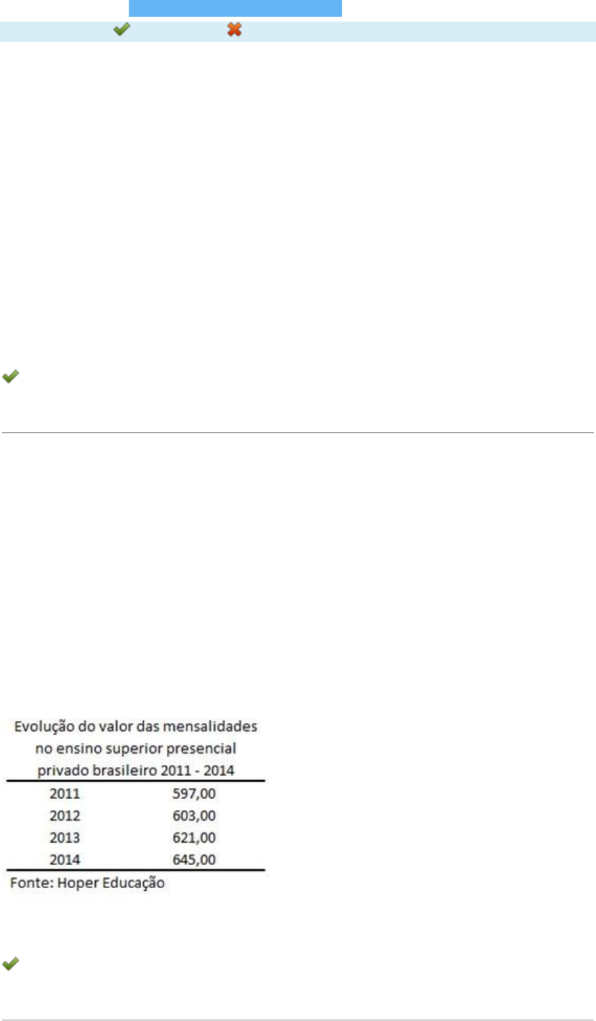 Disciplina: Métodos Quantitativos (ADG13) Avaliação: Avaliação I - Individual FLEX ( Cod.:423584) ( peso.:1,50) Nota da Prova: 10,00 Anexos: Formulário de Métodos Quantitativos Gabarito da Prova: Resposta Certa Sua Resposta Errada 1. Nossos governantes também têm uma gama de informações disponíveis mediante estudos estatísticos, o que possibilita o direcionamento de ações governamentais voltadas para a melhora da qualidade de vida da população. É por meio da medição desses dados que fazemos as análises necessárias para aprovarmos ou não determinado governo. Um exemplo são as pesquisas eleitorais, em que os candidatos, ao receberem os dados, mudam as estratégias de acordo com as necessidades, direcionando suas ações para melhorar seu desempenho, seja em algumas regiões, ou seja, em determinados temas. Já para o administrador, esses dados servem principalmente para a tomada de decisão para novos investimentos e análises de mercados com seus respectivos comportamentos. Essas conclusões somente são possíveis com: I- Análise e interpretação dos dados. II- Séries e gráficos estatísticos. III- Definição de um problema. IV- Planejamento de produção. Assinale a alternativa CORRETA: a) As sentenças II e IV estão corretas. b) As sentenças I e IV estão corretas. c) As sentenças I e II estão corretas. d) As sentenças II e III estão corretas. 2. Nos últimos anos, o Ensino Superior no Brasil teve um salto de números de matrículas e concluintes na modalidade. As empresas privadas estão investindo consideravelmente neste tipo de negócio, tanto na modalidade presencial e principalmente na modalidade a distância. A seguir, a evolução dos valores referentes às mensalidades dos cursos superiores na modalidade presencial no Brasil de 2011 a 2014 levou em conta o valor obtido referente à mediana das mensalidades de todos os cursos de graduação presencial de todas as instituições de Ensino Superior do país com os valores corrigidos pelo IPCA. Após a análise da tabela, analise as seguintes opções: I- Trata-se de uma série histórica ou temporal. II- A Hoper Educação é a responsável pela elaboração das informações contidas na tabela. III- Trata-se de uma série geográfica. IV- O IPCA foi o responsável pela realização da pesquisa. Assinale a alternativa CORRETA: a) As opções II e III estão corretas. b) As opções III e IV estão corretas. c) As opções I e II estão corretas. d) As opções I e IV estão corretas. 3. Estatística é o ramo da Matemática que analisa e interpreta dados coletados. É um processo que envolve a coleta de dados de uma pesquisa, apuração destes dados, apresentação dos dados por meio de gráficos ou tabelas e análise dos resultados. Ao coletarmos um conjunto de informações, é necessário separar essas informações de acordo com o seu tipo, cada tipo de informação está associada a uma variável estatística. Variáveis Estatísticas são valores que assumem determinadas características dentro de uma pesquisa. Quanto à classificação das variáveis estatísticas, assinale a alternativa CORRETA: a) Qualitativa e Polilateral. b) Qualitativa e Quantitativa. c) Linear e Depressão. d) Unilateral e Bilateral. 4. As tabelas e os gráficos estatísticos fazem parte de uma linguagem universal, uma forma de apresentação de dados para descrever informações, com o objetivo de produzir no investigador, no público ou no aluno uma impressão mais rápida e viva do assunto em estudo, os quais, nos dias de hoje, podem ser vistos frequentemente ocupando lugar de destaque nos meios de comunicação escrita e falada. Para a elaboração de uma tabela estatística, devem-se observar algumas regras. Classifique V para as sentenças verdadeiras e F para as falsas: ( ) O cabeçalho é a parte inferior da tabela, indicando a origem dos dados ( ) O título da tabela deve responder a três perguntas referentes aos dados: O quê? Onde? e Quando? ( ) Fonte são os setores ou entidades que forneceram os dados ou elaboraram as informações contidas na tabela. ( ) Corpo: é o conjunto de normas obtidas por meio da ABNT (Associação Brasileira de Normas Técnicas) para a elaboração da tabela. Assinale a alternativa que apresenta a sequência CORRETA: a) V - V - F - F. b) F - V - V - V. c) F - V - V - F. d) V - F - F - V. 5. Nos primeiros anos em que as graduações a distância foram oferecidas no Brasil, há pouco mais de uma década, os alunos que a procuravam eram mais velhos. Em geral, desejavam apenas conquistar um diploma de ensino superior para conseguir melhores cargos no trabalho ou queriam cursar uma segunda graduação e não tinham disponibilidade de tempo para o ensino presencial. Esse perfil de alunos vem mudando ano a ano. De acordo com análises do Censo EAD Brasil 2010, a maioria dos matriculados em cursos de educação a distância ainda estuda e trabalha. Observe os dados e, em seguida, classifique V para as sentenças verdadeiras e F para as falsas: ( ) Ao analisar a pesquisa, a definição do problema a ser pesquisado trata ?o que? vamos analisar na tabela. Neste caso, seria o perfil de alunos do ensino presencial e ensino a distância. ( ) A pesquisa demonstrada na figura trata apenas dos cursos de graduação a distância. ( ) A imagem a seguir refere-se à apresentação dos dados para que possa obter informações referentes aos dados pesquisados. ( ) A pesquisa define como delimitação do problema todas as fases da vida escolar de um indivíduo. Assinale a alternativa que apresenta a sequência CORRETA: a) V - V - F - F. b) V - F - V - F. c) F - V - F - V. d) V - V - V - F. 6. No mundo contemporâneo, existe uma grande importância para o profissional da área de administração ter o domínio das ferramentas estatísticas, pois é por meio delas que podemos direcionar ações diversas para melhorar desempenhos e até economizar nos processos de gestão. Os profissionais em administr