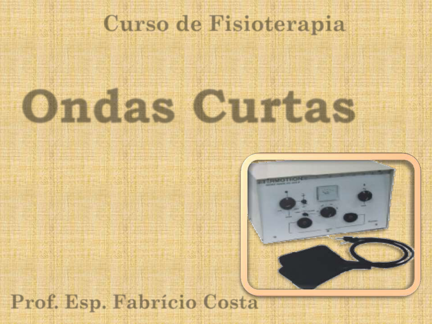 Ondas Curtas Prof. Esp. Fabrício Costa Curso de Fisioterapia Observa-se a níveis fisiológicos: - processos metabólicos; - circulação sanguínea; Termoterapia É uma modalidade de aquecimento profundo, que converte energia eletromagnética de alta freqüência em calor. Lilyana Realce Lilyana Realce Lilyana Realce Ondas Curtas É uma radiação não-ionizante usada por fisioterapeutas para enviar calor para tecidos profundos Definição Geração de ondas eletromagnéticas, que vão interferir no arranjo molecular das células, gerando calor Lilyana Realce Lilyana Realce Lilyana Realce Lilyana Realce Radiação das Ondas Eletromagnéticas • O uso terapêutico das oscilações eletromagnéticas com freqüência maior que 10 Mhz não causa despolarização da fibra nervosa, mas esta energia pode transformar-se em energia térmica no tecido corporal. • Freqüência 27, 12 Mhz – 11,06 m de comprimento de onda. Lilyana Realce Modelo da onda eletromagnética Ondas Curtas Efeitos Fisiológicos • Aumento do fluxo sanguíneo local e do metabolismo • Alterações na velocidade de condução nervosa • Acelera a remoção de metabólitos • Reduz a tensão associada aos tecidos • Aumenta a captação de O2 • Diminui a força muscular e a resistência à fadiga por aproximadamente 2 horas após a aplicação. Lilyana Realce Lilyana Realce Lilyana Realce Lilyana Realce Lilyana Realce Lilyana Realce Lilyana Realce Lilyana Realce Lilyana Realce Efeitos Terapêuticos • Aumenta a extensibilidade do colágeno / fibrinolítico • Diminui a rigidez articular • Alivia dores e espasmos • Ajuda na resolução de inflamação (antiflogístico) • Reabsorção rápida de hematomas e edemas • Acelerar a cicatrização de feridas • Regeneração de tecidos moles Lilyana Realce Lilyana Realce Lilyana Realce Lilyana Realce Lilyana Realce Lilyana Realce Lilyana Realce Lilyana Realce • Aumento atividade celular; • Reabsorção de hematomas; • Redução de edema; • Aumento da taxa deposição de fibrina; • Aumento produção de colágeno. Efeitos Fisiológicos - Atérmicos Lilyana Realce Lilyana Realce Lilyana Realce Lilyana Realce Lilyana Realce Lilyana Realce - Capacitivo. - Indutivos. Métodos de Aplicação Resumo: Método indutivo (corpo “dentro” do gerador) e capacitivo (bipolar – corpo no meio do circuito) Lilyana Realce Lilyana Realce Lilyana Realce Lilyana Realce Lilyana Realce Lilyana Realce Lilyana Realce - Eletrodos flexíveis: - Eletrodos discoidais rígidos: Métodos Capacitivo Lilyana Realce Lilyana Realce Lilyana Realce - Eletrodos discoidais rígidos: - Eletrodos flexíveis: Métodos Capacitivo - Eletrodos flexíveis: - Eletrodos discoidais rígidos: Métodos Capacitivo - Bobina: - Eletrodo espiral: Métodos Indutivos Lilyana Realce Lilyana Realce Lilyana Realce Resumo: Método indutivo (corpo “dentro” do gerador) e capacitivo (bipolar – corpo no meio do circuito) Lilyana Realce Lilyana Realce Lilyana Realce Lilyana Realce - Transversal; - Longitudinal; - Coplanar; - Mista. Posição dos eletrodos Lilyana Realce Lilyana Realce - Transversal; Posição dos eletrodos - Longitudinal; Posição dos eletrodos - Coplanar; Posição dos eletrodos - Mista; - Coplanar; - Mista; Posição dos eletrodos Dose - nas condições crônicas; - nas condições agudas. Lilyana Realce Lilyana Realce Lilyana Realce Dose • A dosagem vai depender da escala de Schliephake e também da sensação de calor referida pelo paciente; da fase que se encontra a enfermidade (aguda ou crônica). Lilyana Realce Lilyana Realce Lilyana Realce Lilyana Realce Lilyana Realce ESCALA DE SCLIEPHAKE * Calor muito débil: imediatamente abaixo da sensação de calor perceptível; * Calor débil: sensação imediata perceptível * Calor médio: sensação de calor clara e agradável * Calor forte: no limite da tolerância DOSE DE DELPIZZO E JOYNER • Alta – claro aumento do calor. • Média – os efeitos térmicos são fracos, porém ainda aparentes. • Baixa – os efeitos térmicos não são observáveis, embora tenham sido relatados efeitos fisiológicos nessas doses. A potência indicada no aparelho representa a potência de saída e não indica energia que penetra em tecidos. Nunca se deve dosar esquematicamente, mas sempre de forma individual. Lilyana Realce Lilyana Realce Lilyana Realce Lilyana Realce -Fases agudas: 5 a 10 minutos; - Fase crônica: 15 a 20 minutos. Tempo A sensação de calor vai depender do tamanho dos eletrodos, da distância eletrodo/pele, da posição dos eletrodos e da região a ser tratada. Lilyana Realce Não faça isso!!!!! Posição dos eletrodos e cabo Indicações • Artrose e artrite crônicas (O.C. Pulsado), • Anquilose, Braquialgia, Bursite crônica, • Ciatalgia, Contusão, Contratura, • Dorsalgia, Distensão, Entorse (crônico), • Epicondilite, Espasmos paravertebrais, • Esporão de calcâneo, Espondilite, Fibrose, • Isquialgia, Lombalgia, Mialgias, Neuralgias, • Neurites, Miogelose, Pré cinesio . Lilyana Realce Lilyana Realce Contra - indicações - Tumores malignos; - Marcapasso; - Gravidez; - Hemorragia; - Febre; - Área isquêmica; - Osteossíntese metálica; - Hipo sensibilidade; - Olhos, testículos, coma, doente mental, fígado, baço. Lilyana Realce Lilyana Realce Contra-Indicações • Processos hemorrágicos, Tuberculose pulmonar e óssea, Febre e processos infecciosos, Região abdominal, Trombose venosa profunda ou flebite, Doenças arteriais. • Gestação, Período pré-menstrual, Infecção renal ou urinária. Perda da sensibilidade, Neoplasias, Marcapassos, Pacientes epiléticos • Feridas abertas, Tecido isquêmico, DIU (abdômen e lombar), Sobre náilon e plástico, Osteomielite. • Antes de 48 h pós – trauma, Áreas isquêmicas ou anestesiadas, Debilidade cognitiva e Edemas. Lilyana Realce Cuidados • Sensibilidade, Obesos, Testículos, • Peles úmidas, Sintonia, • Crianças e idosos, • Cabos e eletr