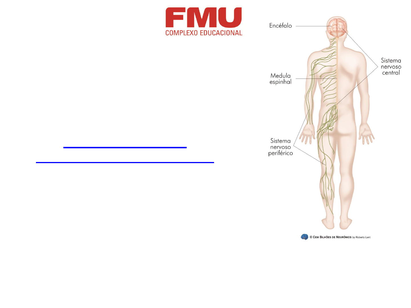 Disciplina Estrutura e Função Sistema Nervoso Prof Dra Daniela Wey Lapa daniela.lapa@fmu.br prof.daniwey.fmu@gmail.com Objetivos a. Identificar as principais estruturas anatômicas que compõem o Sistema Nervoso Central e Periférico Bibliografia TORTORA, G. J.; GRABOWSKI, S. R. Corpo Humano: fundamentos de anatomia e fisiologia. 10.ed. Porto alegre, RS: Artmed, 2016. DRAKE, R. L.; VOGL, W.; MITCHELL, A. W. Gray’s: Anatomia para estudantes. 3. Ed. Rio de Janeiro, RJ: Elsevier, 2015. Neurônio: impulso nervoso através do axônio Neuroglia (glia = cola): sem axônio, não transmite o impulso elétrico 1) Astrócito: envolvido no metabolismo de neurotransmissores, nutrição, desenvolvimento do encéfalo e formam a barreira hematoencefálica 2) Oligodendrócitos: produzem a bainha de mielina no axônio 3) Microglia: pequenas células de defesa e destroem microorganismos e restos celulares 4) Células ependimárias: revestem os ventrículos e o canal da medula: ajudam a circular o líquor 1) Células de Schwann: produzem a bainha de mielina 2) Células satélites: sustentar 2 Figura de um neurônio do sistema nervoso central com oligodendrócitos e astrócitos ao seu redor A) Dendritos: recebem o impulso nervoso (ou potencial de ação) B) Axônio: prolongamento que envia o impulso nervoso C) Terminal do axônio ramificado (telodendro) bulbos e botões sinápticos (neurotransmissores) D) Bainha de Mielina: revestimento lipoproteico, isolamento elétrico que aumenta a velocidade do impulso (sem mielina é mais lento). Degenera na esclerose múltipla E) Nós de Ranvier: espaço entre a bainha de mielina Bainha de mielina e nós de Ranvier: aumentam a velocidade do potencial de ação: impulso saltatório 3 Membrana semipermeável: com canais feitos de proteína que deixam passar íons (sódio, potássio), neurotransmissores e hormônios Potencial de membrana (PM): neurônio em repouso tem o exterior rico em sódio (Na+) e positivo; interior rico em potássio (K+) e é negativo por causa do (Cl-) e de proteínas negativas Potencial de Repouso: acontece por dois processos simultâneos a difusão e a bomba de sódio-potássio. Interior do neurônio no valor de -70mV (carga elétrica) = POLARIZADO Difusão (passivo: sem gasto de energia): ocorre movimento de íons (da maior concentração para a menor concentração): ou seja o K+ tende a sair pois está mais concentrado dentro do neurônio; e o Na+ tende a entrar = pois está mais concentrado fora do neurônio Bomba de Na-K (ativo: com gasto de energia): em repouso manda: 3Na+ para fora 2K+ para dentro: portanto esse processo cria uma diferença de carga negativa dentro do neurônio pois sai mais carga positiva do que entra 4 Quando ocorre o PA: o neurônio sai do repouso e muda o valor de seu potencial de (-70mV) ocorrem 3 etapas: despolarização (interior do neurônio fica mais positivo por causa da entrada de cargas positivas de sódio), repolarização (voltar a ser negativo por causa da saída de cargas positivas de potássio) e hiperpolarização (neurônio muito negativo pois sai muito potássio). Em seguida a bomba e a difusão recuperam o repouso com o interior polarizado 5 Unidirecional. mais lenta Fenda sináptica, vesículas com neurotransmissores, precisa do cálcio e converte o elétrico em sinal químico e depois em sinal elétrico Bidirecional. Transmissão rápida infalível. Sinal sempre elétrico. Junção comunicante (une os dois neurônios) 6 7 Sistema Nervoso Central: dividido em Encéfalo e Medula que são envoltos por três meninges: Dura-máter: externa como couro Aracnoide: teia de aranha (quase não vemos na prática) Pia-máter: fina bem colada no encéfalo com vasos sanguíneos que nutrem e levam oxigênio para o SNC Entre a Pia-mater e a aracnoide existe espaço preenchido com LCR (líquido cefalorraquidiano ou líquor). Funções: proteção de pancadas e nutrição Ventrículos: cavidade interna cheia de líquor Encéfalo: formado por cérebro, cerebelo, tronco encefálico Os hemisférios esquerdo e direito são conectados pelo corpo caloso Córtex (externo): parte externa com substância cinzenta: maior concentração de corpos de neurônios Parte interna: substância branca: maior concentração de fibra nervosa (axônios – bainha de mielina) p.ex. corpo caloso Medula: dentro da coluna vertebral. Percepção sensorial e coordenar movimentos (reflexo medular). Conduz impulsos nervosos e comunica corpo e ambiente. Comunica pele, ossos e articulações e músculos com o encéfalo Substância branca envolve a substância cinzenta Raiz DORSAL (recebe aferências sensoriais das fibras da raiz dorsal): nervos sensitivos da periferia do corpo para o centro (SNC) Raiz VENTRAL (envia axônios até as raízes ventrais que inervam músculos): nervos motores do centro (SNC) para a periferia do corpo Está dividido em nervos, gânglios e terminações nervosas. Os nervos podem sair do encéfalo ou da medula • 31 pares de nervos raquidianos ou medulares ou espinhais relacionam-se com os músculos esqueléticos: oito pares de nervos cervicais; doze pares de nervos torácicos; cinco pares de nervos lombares; seis pares de nervos sagrados ou sacrais. NERVOS CRANIANOS Dos 12 pares de nervos cranianos, 10 saem do tronco encefálico Integram funções sensoriais e motoras Substância negra: fonte da dopamina (neurotransmissor) que modula a motivação e a regulação dos movimentos Substância negra: com neurônios que sintetizam dopamina Doença neurodegenerativa, crônica e progressiva. Perda de cerca de 80% dos neurônios dopaminérgicos da substância negra (ou nigra), que participam do controle dos movimentos do corpo. Apresenta tremores de repouso, rigidez dos músculos, dificuldade para iniciar ou alterar um movimento (caminhar), dificuldade para se equilibrar e engolir Dopamina: neurotransmissor que controla a motivação, regula o movimento, humor, atenção e funções viscerais Precursora da Adrenalina: estimulan