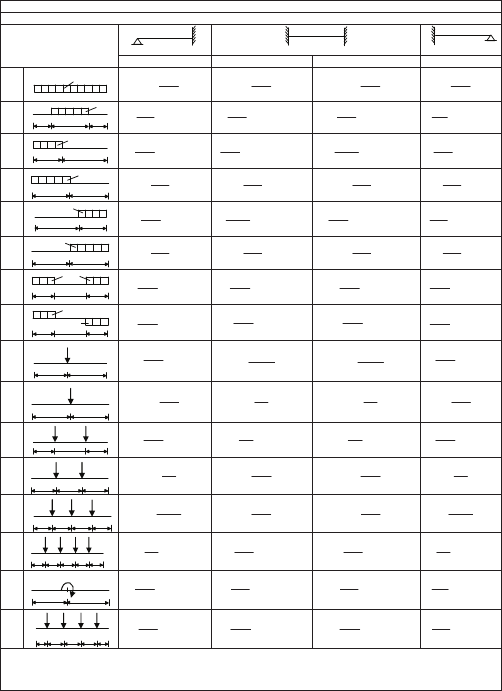 TABELA 3.2a MOMENTOS DE ENGASTAMENTO PERFEITO A B C D FE CARREGAMENTO MBA MCD MDC MEF 1 p 8 p 2 12 p 2 12 p 2 8 p 2 2 p a c a ! "22 c316 pc ! "22 c3 24 pc ! "22 c3 24 pc ! "22 c3 16 pc 3 p c b ! "222 2 c2 8 pc ! "22 2 2 cbc4b6 12 pc ## ! "2 2 2 cbc4 12 pc # ! "2 2 2 b 8 pc # 4 /2 p /2 2p 128 7 2p 192 11 2p 192 5 2p 128 9 5 p ca ! " 2 2 2 a 8 pc # ! "2 2 2 cac4 12 pc # ! "22 2 2 cac4a6 12 pc ## ! "22 2 2 c2 8 pc 6 p /2 /2 2p 128 9 2p 192 5 2p 192 11 2p 128 7 7 aa p ! "a23 4 pa 2 ! "a23 6 pa 2 ! "a23 6 pa 2 ! "a23 4 pa 2 8 aa p p ! "a23 4 pa 2 ! "2 2 2 a 2 pa ! "2 2 2 a 2 pa ! "a23 4 pa 2 9 a P b ! "a 2 Pab 2 # 2 2Pab 2 2bPa ! "b 2 Pab 2 # 10 P /2 /2 16 P3 8 P 8 P 16 P3 11 aa P P ! "a 2 Pa3 ! "aPa ! "aPa ! "a 2 Pa3 12 P P /3 /3 /3 3 P 9 P2 9 P2 3 P 13 P P /4 P /4 /4 /4 32 P15 16 P5 16 P5 32 P15 14 P P a P P (*) a a a a ! "1n n8 P 2 ! "1n n12 P 2 ! "1n n12 P 2 ! "1n n8 P 2 15 a b M ! "22 2 a3 2 M ! " 2b3 Mb 2 ! "a32Ma 2 ! "22 2 b3 2 M 16 P P a/2 P P (*) a a a a/2 ! "1n2 n16 P 2 # ! "1n2 n24 P 2 # ! "1n2 n24 P 2 # ! "1n2 n16 P 2 # Extraída de SOUZA; ANTUNES (1983), JIMENES MONTOYA; GARCIA MESEGUER; MORAN CABRE (1973) e de SCHREYER (1965). Convenção de GRINTER. (*) a/n $ Revista e adaptada por Libânio M. Pinheiro, Bruna Catoia e Thiago Catoia. TABELA 3.2b MOMENTOS DE ENGASTAMENTO PERFEITO A B C D FE CARREGAMENTO MBA MCD MDC MEF 17 p 15 p 2 30 p 2 20 p 2 120 p7 2 18 p 120 p7 2 20 p 2 30 p 2 15 p 2 19 p /2 /2 2p 480 17 30 p 2 2p 160 3 2p 960 41 20 p /2 /2 2p 960 41 2p 160 3 30 p 2 2p 480 17 21 p /2 /2 2p 1920 53 2p 960 7 2p 960 23 2p 1920 37 22 p /2 /2 2p 1920 37 2p 960 23 2p 960 7 2p 1920 53 23 p /2 /2 2p 64 5 2p 96 5 2p 96 5 2p 64 5 24 p p /2 /2 2p 64 3 32 p 2 32 p 2 2p 64 3 25 parábola p 2p 120 11 20 p 2 15 p 2 12 p 2 26 parábola p 24 p 2 60 p 2 30 p 2 30 p 2 27 pparábola 10 p 2 15 p 2 15 p 2 10 p 2 28 p parábola p /2 /2 2p 80 7 2p 120 7 2p 120 7 2p 80 7 29 a EI a3 2 # EI a6 2 # EI a6 2 # EI a3 2 # 30 % EI 3 % # EI 2 % # EI 4 % # --- 31 % --- EI 4 % EI 2 % EI 3 % 32 h t+&t t t h2 EI3 t&%# t h EI t&% t h EI t&%# t h2 EI3 t&% Extraída de SOUZA; ANTUNES (1983), JIMENES MONTOYA; GARCIA MESEGUER; MORAN CABRE (1973) e de SCHREYER (1965). Convenção de GRINTER. Revista e adaptada por Libânio M. Pinheiro, Bruna Catoia e Thiago Catoia. TABELA 3.2c MOMENTOS DE ENGASTAMENTO PERFEITO CARREGAMENTO A B C D FE ' ()ca2(c2)ca(a 8 p M 244 2BA ### $ ' ( ' () *4433 2CD b)cb(3b)cb(4 12 p M # #$ ' ( ' () *4433 2DC a)ca(3a)ca(4 12 p M # # $ 33 p a c b ' ()cb2(c2)cb(b 8 p M 244 2EF ### $ + , - . / 0 1 2 3 4 5 6 # # # # $ c20a30 c28a45 4cac12)a(9)c2a3( 108 pc M 222 2BA ' (322 2CD c17)b3(c15)c2a3()cb3(10 540 pc M ##$ ' (322 2DC c28)a3(c15)c2a3)(cb3(10 540 pc M ## $ 34 p a c b + , - . / 0 1 2 3 4 5 6 # # # #$ c90b270 c17b45 91cbc6)b(9)cb3( 108 pc M 222 2EF + , - . / 0 1 2 3 4 5 6 # # # # $ c90a270 c17a45 91cac6)a(9)ca3( 108 pc M 222 2BA ' (322 2CD c28)b3(c15)c2b3)(ca3(10 540 pc M ##$ ' (322 2DC c17)a3(c15)c2b3()ca3(10 540 pc M ## $ 35 p a c b + , - . / 0 1 2 3 4 5 6 # # # #$ c20b30 c28b45 4cbc12)b(9)c2b3( 108 pc M 222 2EF )c35(c 30 p M 222 2BA $ )c6c1510(c 30 p M 222 2CD # $ )c4c5(c 20 p M 22 2DC $ 36 p c b )c12c4540(c 120 p M 222 2EF # $ Extraída de SCHREYER (1965). Convenção de GRINTER. Revista e adaptada por Libânio M. Pinheiro, Bruna Catoia e Thiago Catoia. TABELA 3.2d MOMENTOS DE ENGASTAMENTO PERFEITO CARREGAMENTO A B C D FE ! "222 2BA c12c4540c 120 p M # $ ! "22 2CD c4c5c 20 p M $ ! "222 2DC c6c1510c 30 p M # $ 37 p a c ! "222 2EF c35c 30 p M $ ! "222 2BA c3c1520c 120 p M # $ ! "22 2CD c3c5c 60 p M $ ! "22 2DC c3a10c 60 p M # $ 38 p a c ! "222 2EF c310c 120 p M $ ! "222 2BA c310c 120 p M $ ! "22 2CD c3b10c 60 p M #$ ! "22 2DC c3c5c 60 p M $ 39 p c b ! "22 2EF c3c1520 120 p M # $ ! "323BA aa2 8 p M # $ ! "323CD aa2 12 p M # $ ! "323DC aa2 12 p M # $ 40 p a c a ! "323EF aa2 8 p M # $ Extraída de SCHREYER (1965). Convenção de GRINTER. Revista e adaptada por Libânio M. Pinheiro, Bruna Catoia e Thiago Catoia. REFERÊNCIAS BIBLIOGRÁFICAS ISNARD, V.; GREKOW, A.; MROZOWICZ, P. Formulario del ingeniero: metodos practicos de calculo de obras de ingenieria. Bilbao, Urmo, 1971. JIMENES MONTOYA, P.; GARCIA MESEGUER, A.; MORAN CABRE, F. Hormigon Armado, 2v. 7.ed. Barcelona, Gustavo Gili, 1973. PINHEIRO, L. M. Concreto armado: tabelas e ábacos. São Carlos, Escola de Engenharia de São Carlos, 1986. SCHIEL, F. Introdução à resistência dos materiais. v.1. 6.ed. São Carlos, Escola de Engenharia de São Carlos, 1976. SCHREYER, H. Estática das construções. v.2. Porto Alegre, Globo, 1965. SOUZA, João Carlos A. O.; ANTUNES, Helena M. C. C. Estática das estruturas: temas complementares. São Carlos, Escola de Engenharia de São Carlos, 1983.