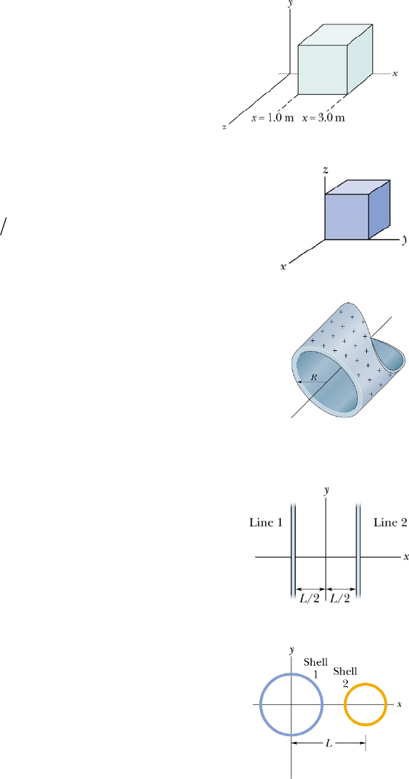 Física Geral II 5ª Lista de Exercícios – Lei de Gauss 1) Uma esfera condutora uniformemente carregada com 1,2 m de diâmetro possui uma densidade superficial de cargas de 8,1 µC/m2. (a) Determine a carga da esfera. (b) Determine o fluxo elétrico através da superfície da esfera. (ref. Exercício 19 – Cap. 23 – 8ª ed) 2) Um campo elétrico dado por 2 ˆˆ4 3(y 2) jE i= − + atravessa um cubo gaussiano com 2,0 m de aresta, posicionado da forma mostrada na figura ao lado. Determine o fluxo elétrico (a) através da face superior, (b) através da face inferior, (c) através da face da esquerda, (d) através da face traseira. (e) Qual é o fluxo elétrico total através do cubo? (ref. Exercício 02 – Cap. 23 – 8ª ed) 3) A figura mostra uma superfície gaussiana com a forma de um cubo de 2,0 m de aresta, imersa em um campo elétrico dado por ˆˆ ˆ(3 4) 6 7E x i j k N C= + + + , com x em metros. Qual é a carga total contida no cubo? (ref. Exercício 14 – Cap. 23 – 8ª ed) 4) A figura mostra uma seção de um tubo longo de metal, de paredes finas, com um raio R = 3,0 cm e uma carga por unidade de comprimento λ = 2,0×10−8 C/m. Determine o módulo E do campo elétrico a uma distância radial (a) r = R/2 e (b) r = 2R. (c) Faça um gráfico de E em função de r para 0 ≤ r ≤ 2R. (ref. Exercício 22 – Cap. 23 – 8ª ed) 5) Na figura ao lado, pequenas partes de duas linhas paralelas de cargas muito compridas são mostrada, fixas no lugar e separadas por uma distância L = 8,0 cm. A densidade uniforme de cargas das linhas é +6,0 μC/m para a linha 1 e –2,0 μC/m para a linha 2. Em que ponto do eixo x o campo elétrico é zero? (ref. Exercício 26 – Cap. 23 – 8ª ed) 6) A figura mostra duas cascas esféricas não-condutoras mantidas fixas no lugar. A casca 1 possui uma densidade superficial de cargas uniforme de +6,0 µC/m2 na superfície externa e um raio de 3,0 cm. A casca 2 possui uma densidade superficial de cargas uniforme de +4,0 µC/m2 na superfície externa e raio de 2,0 cm. Os centros das cascas estão separados por uma distância L = 10 cm. Em termos dos vetores unitários, qual é o campo elétrico no ponto x = 2,0 cm? (ref. Exercício 08 – Cap. 23 – 8ª ed) 7) A figura mostra uma seção de uma barra condutora de raio R1 = 1,3 mm e comprimento L = 11,0 m no interior de uma casca coaxial, de paredes finas, de raio R2 = 10R1 e mesmo comprimento L. A carga da barra é Q1 = +3,4×10−12 C, a carga da casca é Q2 = –2Q1. Determine (a) o módulo E e (b) a direção (para dentro ou para fora) do campo elétrico a uma distância radial r = 2R2. Determine (c) E e (d) a direção do campo elétrico para r = 5R1. Determine a carga (e) na superfície interna e (f) na superfície externa da casca. (ref. Exercício 27 – Cap. 23 – 8ª ed) 8) Na figura, uma pequena esfera não-condutora de massa m = 1,0 mg e carga q = 2,0×10-8 C (distribuída uniformemente em todo o volume) está pendurada em um fio não condutor que faz um ângulo θ = 30º com uma placa vertical, não-condutora, uniformemente carregada (vista de perfil). Considerando a força gravitacional a que a esfera está submetida e supondo que a placa possui uma grande extensão, calcule a densidade superficial de cargas σ da placa. (ref. Exercício 41 – Cap. 23 – 8ª ed) 9) A figura ao lado mostra uma casca esférica com uma densidade volumétrica de cargas uniforme ρ = 1,84 nC/m3, raio interno a = 10 cm e raio externo b = 2a. Determine o módulo do campo elétrico (a) em r = 0, (b) em r = a/2, (c) em r = a, (d) em r = 1,5a, (e) em r = b e (f) em r = 3b. (ref. Exercício 50 – Cap. 23 – 8ª ed) 10) Na figura uma esfera maciça de raio a = 2 cm é concêntrica com uma casca condutora de raio interno b = 2a e raio externo c = 2,4a. A esfera possui uma carga uniforme q1 = +5 fC e a casca possui uma carga q2 = –q1. Determine o módulo do campo elétrico (a) em r = 0, (b) em r = a/2 (c) em r = a, (d) em r = 1,5a, (e) em r = 2,3a e (f) em r = 3,5a. Determine a carga (g) na superfície interna e (h) na superfície externa da casca. (ref. Exercício 51 – Cap. 23 – 8ª ed) 11) Um cilindro muito longo de raio R possui uma distribuição volumétrica de cargas uniforme. (a) Mostre que, a uma distância r < R do eixo do cilindro 02 rE ρ ε = onde ρ é a densidade volumétrica de cargas. (b) Escreva uma expressão para E do lado de fora do cilindro. (ref. Exercício 74 – Cap. 23 – 8ª ed) 12) Aumente sua capacidade: Na figura, um pequeno furo circular de raio R = 1,8 cm foi aberto no meio de uma placa, infinita, não-condutora, com densidade superficial de cargas σ = 4,5 pC/m2. O eixo z, cuja origem está no centro do furo, é perpendicular à placa. Determine, em termos dos vetores unitários, o campo elétrico no ponto P, situado em z = 2,56 cm. Sugestão: use a eq. 22-26 e o princípio da superposição. (ref. Exercício 36 – Cap. 23 – 8ª ed) RESPOSTAS: 1) a) 3,7×10−5 C b) 4,1×106 N.m2/C 2) a) −72 N.m2/C b) +24 N.m2/C c) −16 N.m2/C d) zero e) −48 N.m2/C 3) 2,13×10−10 C 4) a) zero b) 5,99×103 N/C c) gráfico 5) 8 cm 6) 4 ˆ(2,8 10 )N C i− × 7) a) 0,214 N/C b) entrando c) 0,855 N/C d) saindo e) −3,4×10−12 C f) −3,4×10−12 C 8) 5,0×10−9 C/m2 9) a) zero b) zero c) zero d) 7,32 N/C e) 12,1 N/C f) 1,35 N/C 10) a) zero b) 5,62×10−2 N/C c) 0,112 N/C d) 0,0499 N/C e) zero f) zero g) −50 fC h) zero 11) a) demonstração b) 2 02 RE r ρ ε = 12) ˆ(0, 208 )N C k