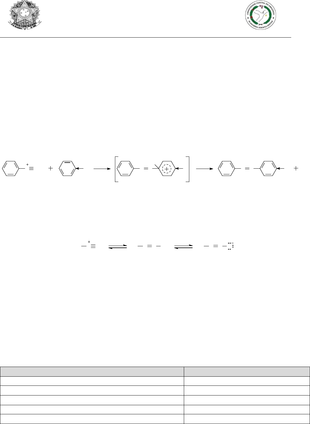 1 PODER EXECUTIVO MINISTÉRIO DA EDUCAÇÃO UNIVERSIDADE FEDERAL DO AMAZONAS INSTITUTO DE CIÊNCIAS EXATAS DEPARTAMENTO DE QUÍMICA Bloco 10 do Setor Sul do Campus Universitário Sen. Arthur Virgílio Filho, Av. Gal. Rodrigo Otávio, 6.200 – Coroado, 69077-000 Manaus, AM. Fone/Fax: (092) 3305-2870. E-mail: dqufam@gmail.com Professor Dr. Emmanoel Vilaça Costa Reações de acoplamento de sais de diazônio INTRODUÇÃO As reações de acoplamento envolvem o ataque do íon diazônio ao anel aromático. Este reagente, por ser fracamente eletrofílico e só é capaz de reagir, na maioria dos casos, com substratos ativos, como fenóis e aminas. O esquema geral da reação pode ser representado como se segue: Esta reação é bastante influenciada pelo pH do meio reacional. Quando fenóis são usados como substrato, a reação é acelerada em meio fracamente alcalino. Sob estas condições, uma boa parte do fenol está presente como íon fenóxido, que é mais reativo. A alcalinidade da solução não deve ser muito alta, entretanto, porque isto inativaria o sal diazônio: As reações de acoplamento com aminas são conduzidas em meio levemente ácido. Nestas condições, o sal diazônio é bastante reativo e o grupo amino não é muito desativado. Os produtos resultantes destas reações são chamados compostos azoicos. Estes compostos são bastante coloridos e são, por isso, utilizados como corantes. A seguir, algumas preparações que envolvem reações de acoplamento de sais de diazônio são realizadas no laboratório. É importante lembrar que, como estes sais são instáveis, são preparados e utilizados imediatamente. 1) PREPARAÇÃO DO ALARANJADO II MATERIAIS E REAGENTES REAGENTES EQUIPAMENTOS E VIDRARIAS 2-Naftol Banho de gelo Ácido clorídrico 6 M Béquer de 50 e 250 mL Ácido sulfanílico Espátula Cloreto de sódio Funil de Büchner Nitrito de sódio Frasco Kitasato de 1000 mL N N X - G N N H G N N G HG X - Ar N N HO - H+ Ar N N OH HO - H+ Ar N N O Acopla Não Acopla Não Acopla 2 Sal de cozinha Papel indicador de pH Solução aquosa de carbonato de sódio a 5% (200 mL) Proveta de 25 mL Solução aquosa de hidróxido de sódio a 1% (200 mL) Pissete Solução recém-preparada de cloreto de p-sulfo-benzenodiazônio (durante a prática) Termômetro de -5 a 100 oC a) Cloreto de p-sulfo-benzenodiazônio PROCEDIMENTO EXPERIMENTAL Em um béquer de 250 mL colocar 50 mL de solução aquosa de carbonato de sódio a 5% e 5 g de ácido sulfanílico. Agitar bem e aquecer, se necessário, para que o ácido se dissolva. Juntar, então, uma solução contendo 2 g de nitrito de sódio em 10 mL de água e resfriar a mistura reacional abaixo de 3 oC, utilizando banho de gelo e sal. Adicionar, a seguir, lentamente e com agitação,, 20 mL de ácido clorídrico 6 M. Durante a adição, a temperatura do meio não deve ultrapassar 5 oC. O sal de diazônio formado é mantido a 5 oC. b) p-(-2-HIDRÓXI-1-NAFTILAZO)-BENZENOSSULFONATO DE SÓDIO (ALARANJADO II) PROCEDIMENTO EXPERIMENTAL Em um béquer de 50 mL preparar uma solução contendo 3,6 g de 2-naftol e 20 mL de solução aquosa de hidróxido de sódio a 10%. Resfriar a 5 oC e adicioná-la, lentamente e com agitação, ao sal diazônio recém preparado mantido a 5 oC. Verificar se a solução está alcalina com papel indicador de pH. Caso isto não aconteça, adicionar mais solução de hidróxido de sódio. Adicionar 10 g de cloreto de sódio dissolvidos em um mínimo de água, agitar e deixar em repouso durante 30 minutos. Filtrar, lavar com água gelada e secar ao ar. O corante assim obtido contém cerca de 20% de cloreto de sódio. Sua purificação é desnecessária caso seja em tinturaria. Para a obtenção do produto puro e cristalino, é necessário dissolvê-lo no volume mínimo de água quente, esfriar a 80 oC e adicionar o dobro de volume de metanol; deixar esfriar, filtrar a vácuo e lavar com uma pequena quantidade de metanol. Rendimento: 85% a 95%. Tempo: 3h. Caracterização: Sólido alaranjado; teste químico: dissolver uma pequena porção do corante em uma solução aquosa de hidróxido de potássio a 5 % e observar uma coloração vermelha intensa. Aplicações: O alaranjado II é um dos corantes mais utilizados. A presença do grupo sulfônico torna o corante importante, industrialmente, porque aumenta a solubilidade em água. Emprego em tecidos: colocar, em um béquer de 100 mL, um pedaço de tecido (lã, seda ou algodão) e 25 mL de solução aquosa de sulfato duplo de NH3 SO3 Na2CO3 NH2 SO3Na NaNO2, HCl N2 SO3H Cl - N2 SO3H Cl - OH NaOH N N HO NaO3S 3 alumínio e potássio a 10 %, deixando em contato durante 40 min. Secar o tecido em estufa e, em seguida, mergulhá-lo em uma solução aquosa de alaranjado II a 0,5 %. Aquecer a 80 oC, durante 15 minutos, e secar em estufa. QUESTIONÁRIO 1) Qual é a função do carbonato de sódio na presença do sal de diazônio? 2) Sugerir um mecanismo para a formação do sal de diazônio. 3) Por que as reações de diazotação e acoplamento devem ser conduzidas a baixas temperaturas? 4) Qual é a função do cloreto de sódio? 5) Por que os corantes com grupos polares são mais utilizados em tecidos? 2) PREPARAÇÃO DO ÁCIDO P-(4-N-N-DIMETILAMINO-FENILAZO)-BENZENOSSULFÔNICO (ALARANJADO DE METILA) MATERIAIS E REAGENTES REAGENTES EQUIPAMENTOS E VIDRARIAS Ácido acético glacial Béquer de 50 mL Álcool etílico Frasco Kitasato de 500 mL Éter etílico Funil de Büchner N,N-dimetil-anilina Pissete Solução aquosa de hidróxido de sódio a 25% (150 mL) Solução recém preparada de cloreto de p-sulfo-benzenodiazônio PROCEDIMENTO EXPERIMENTAL Em um béquer de 50 mL, dissolver 4 mL de N,N-dimetil-anilina em 2 mL de ácido acético glacial. Adicionar esta solução ao sal de diazônio preparado na seção anterior, agitar bem e deixar em repouso, durante 10 minutos em banho de gelo. Adicionar, lentamente e com agitação, 25 mL de solução aquosa de hidróxido de sódio a 25%. Forma-se um co