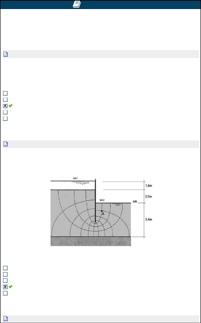 MECÂNICA DOS SOLOS Avaliando Aprend.: CCE0255_SM_201603250883 V.1 Aluno(a): CLERISTON NASCIMENTO DA SILVA Matrícula: 201603250883 Desemp.: 0,5 de 0,5 09/11/2018 10:38:52 (Finalizada) 1a Questão (Ref.:201604052564) Pontos: 0,1 / 0,1 Um ensaio de permeabilidade fornece os seguintes valores: L = 40 cm ; A = área da amostra = 190 cm2 ; Diferença de carga, h = 40cm ; água coletada em um período de 5 minutos = 285 cm3. Calcule a condutividade hidráulica em cm/s. Demonstre os cálculos. 5,10 5,15 5,00 5,03 5,05 2a Questão (Ref.:201603394975) Pontos: 0,1 / 0,1 A figura abaixo mostra uma rede de fluxo, solução gráfica do problema de fluxo permanente 2D, ao redor de uma cortina impermeável em uma camada de solo isotrópico e homogêneo. A rede é constituída por 5 linhas de fluxo e 10 linhas equipotenciais, com o nível de referência (NR) coincidindo com a posição da linha equipotencial mínima (nível d'água NA2). Qual o valor da carga hidráulica h no ponto A situado na profundidade 1,40 m abaixo do NR? 1,76 m. 0,20 m. 5,76 m. 0,36 m. 1,40 m. 3a Questão (Ref.:201604059799) Pontos: 0,1 / 0,1 Um ensaio de permeabilidade fornece os seguintes valores: L = 80 cm ; A = área da amostra = 200 cm2 ; Diferença de carga, h = 200cm ; água coletada em um período de 5 minutos = 360 cm3. Calcule a condutividade hidráulica em cm/s. Demonstre os cálculos. 3,0 x 10-3 2,4 x 10-3 2,8 x 10-3 2,6 x 10-3 2,5 x 10-3 4a Questão (Ref.:201604285376) Pontos: 0,1 / 0,1 Sobre o Estado de Tensões num plano, podemos determinar através do Círculo de Mohr. Sobre este, todas as afirmativas estão erradas. EXCETO Em análise do Círculo de Mohr, podemos dizer que a máxima tenção de cisalhamento em módulo, ocorre em planos que formam ângulos de 90°. Em análise do Círculo de Mohr, podemos dizer que as tensões de cisalhamento em planos ortogonais são numericamente iguais e de mesmo sinais. O estado de tensões atuantes em todos os planos que passam por um ponto pode ser representado graficamente num sistema de coordenadas em que as ordenadas são as tensões normais e as abscissas são as tensões cisalhantes. Nesse sistema, as equações definem um círculo, que é o círculo de Mohr. O estado de tensões atuantes em todos os planos que passam por um ponto pode ser representado graficamente num sistema de coordenadas em que as abscissas são as tensões normais e as ordenadas são as tensões cisalhantes. Nesse sistema, as equações definem um círculo, que é o círculo de Mohr. Em análise do Círculo de Mohr, podemos dizer que a máxima tenção de cisalhamento é igual a um quarto da diferença das Tensões principais. 5a Questão (Ref.:201604309751) Pontos: 0,1 / 0,1 No desenho abaixo, mostra uma barragem de concreto armazenando uma certa altura de água. Qual é a altura da coluna de água que a barragem está contendo, sabendo que a poropressão e a carga de elevação no ponto A são, respectivamente, 150 kPa e 5m? Demonstre os cálculos. 20m 40m 10m 50m 30m