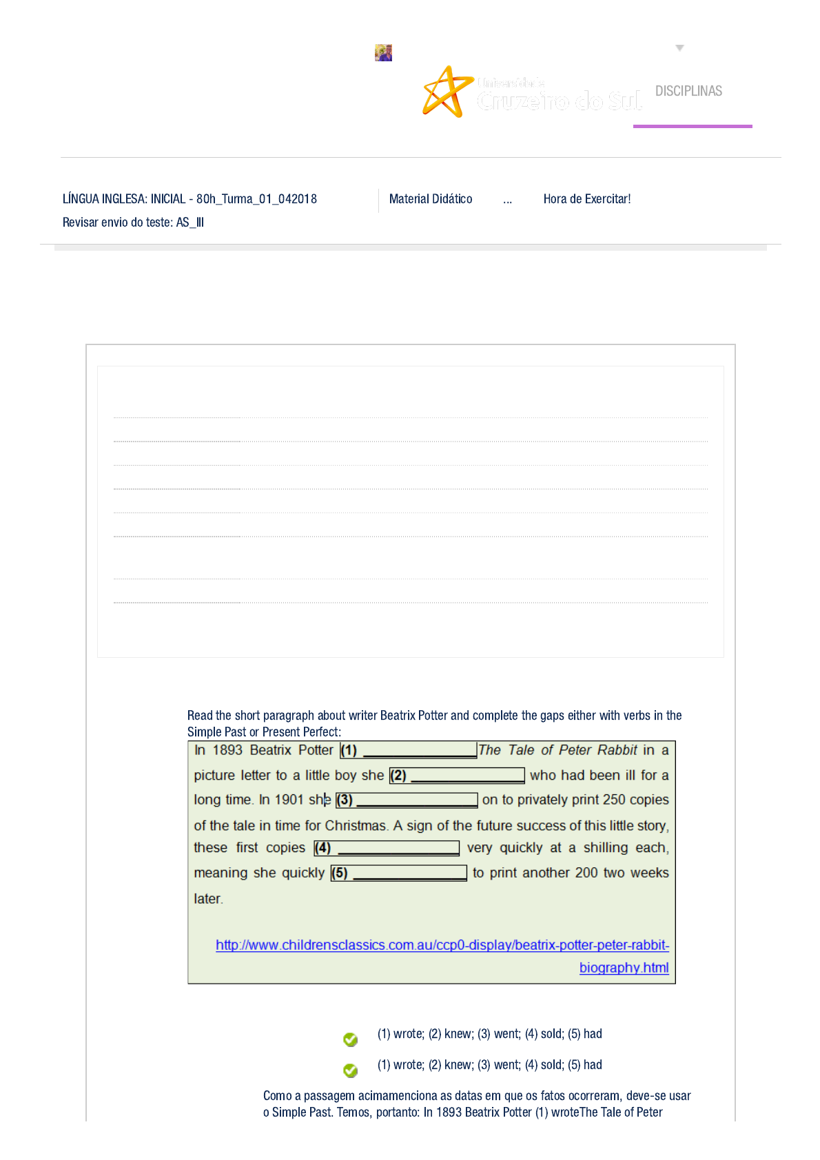 13/05/2018 Revisar envio do teste: AS_III – LÍNGUA INGLESA: INICIAL... https://bb.cruzeirodosulvirtual.com.br/webapps/assessment/review/review.jsp?attempt_id=_31778029_1&course_id=_507362_1&content_id=_3821403_1&outco LÍNGUA INGLESA: INICIAL - 80h_Turma_01_042018 Material Didático ... Hora de Exercitar! Revisar envio do teste: AS_III REVISAR ENVIO DO TESTE: AS_III Usuário Marlon Rocha Louzada CRUZ_EAD_Letras - Português e Inglês (Licenciatura)_2A_20181 Curso LÍNGUA INGLESA: INICIAL - 80h_Turma_01_042018 Teste AS_III Iniciado 05/04/18 11:21 Enviado 05/04/18 11:23 Status Completada Resultado da tentativa 0,7 em 0,7 pontos Tempo decorrido 2 minutos Resultados exibidos Respostas enviadas, Respostas corretas, Comentários Pergunta 1 Resposta Selecionada: b. Resposta Correta: b. Feedback Read the short paragraph about writer Beatrix Potter and complete the gaps either with verbs in the Simple Past or Present Perfect: (1) wrote; (2) knew; (3) went; (4) sold; (5) had (1) wrote; (2) knew; (3) went; (4) sold; (5) had Como a passagem acimamenciona as datas em que os fatos ocorreram, deve-se usar o Simple Past. Temos, portanto: In 1893 Beatrix Potter (1) wroteThe Tale of Peter DISCIPLINAS 0,175 em 0,175 pontos Marlon Rocha Louzada CRUZ_EAD_Letras ... 13/05/2018 Revisar envio do teste: AS_III – LÍNGUA INGLESA: INICIAL... https://bb.cruzeirodosulvirtual.com.br/webapps/assessment/review/review.jsp?attempt_id=_31778029_1&course_id=_507362_1&content_id=_3821403_1&outco da resposta: Rabbit in a picture letter to a little boy she (2) knew who had been ill for a long time. In 1901 she (3) went on to privately print 250 copies of the tale in time for Christmas. A sign of the future success of this little story, these first copies (4) sold very quickly at a shilling each, meaning she quickly (5) had to print another 200 two weeks later. Pergunta 2 Resposta Selecionada: b. Resposta Correta: b. Feedback da resposta: Read the short paragraph and complete the gaps with the most suitable verbs in the Simple Past: (1) went; (2) spent; (3) bought; (4) was; (5) walked; (6) saved (1) went; (2) spent; (3) bought; (4) was; (5) walked; (6) saved O pequeno trecho é completado da seguinte maneira: Every day when she (1) went to the shops, she (2) spent very little money. She (3) bought the cheapest meat and the cheapest vegetables. And when she (4) was tired, she still (5) walked round and round the shops to find the cheapest food. She (6) saved every little cent possible. (…) Ou seja, todos os dias quando ela ia às lojas, gastava muito pouco dinheiro. Ela comprava a carne mais barata e os vegetais mais baratos. E quando estava cansada, ela ainda caminhava ao redor das lojas para achar a comida mais barata. Ela economizava cada centavo possível. Pergunta 3 Read the followingpassage from the spooky story “The Ash-Tree”, and complete the gaps (1 – 10) with verbs in the Simple Past in order to give sense to it: 0,175 em 0,175 pontos 0,175 em 0,175 pontos 13/05/2018 Revisar envio do teste: AS_III – LÍNGUA INGLESA: INICIAL... https://bb.cruzeirodosulvirtual.com.br/webapps/assessment/review/review.jsp?attempt_id=_31778029_1&course_id=_507362_1&content_id=_3821403_1&outco Resposta Selecionada: a. Resposta Correta: a. Feedback da resposta: (1) found; (2) described; (3) used to; (4) carried; (5) talked; (6) disappeared; (7) knocked; (8) came; (9) agreed; (10) died (1) found; (2) described; (3) used to; (4) carried; (5) talked; (6) disappeared; (7) knocked; (8) came; (9) agreed; (10) died This story begins in 1690 with a strange lonely old woman, Mrs. Mothersole, who was (1) found guilty of being a witch. Sir Matthew Fell, the owner of Castringham Hall at that time, (2) described how she (3) used to climb into the ash-tree outside his bedroom every time there was a full moon. He said that she usually (4) carried a strange knife to cut o� parts of the tree and that she (5) talked to herself. Once he followed her home, but she (6) disappeared and when he (7) knockedon the door of her house, she (8) came downstairs in her night clothes looking sleepy. He and the villagers (9) agreed that it was certain she did these things by magic and so she was hanged. Before she (10) died, she fought and shouted, and her last strange words were: 'There will be guests at the Hall.' As lacunas são completadas com os verbos no Simple Pastda alternativa (A), para que a história tenha sentido. Assim temos: Pergunta 4 Resposta Selecionada: b. Read the answergiven and choose the best question to it: What has he done so far? 0,175 em 0,175 pontos 13/05/2018 Revisar envio do teste: AS_III – LÍNGUA INGLESA: INICIAL... https://bb.cruzeirodosulvirtual.com.br/webapps/assessment/review/review.jsp?attempt_id=_31778029_1&course_id=_507362_1&content_id=_3821403_1&outco Domingo, 13 de Maio de 2018 19h50min48s BRT Resposta Correta: b. Feedback da resposta: What has he done so far? Como temos na resposta o Present Perfect (He has done everything to me), a pergunta deve ser feita com o mesmo tempo verbal. Portanto, devemos ter o verbo auxiliar (has) e o Past Participle do verbo principal (done). ← OK