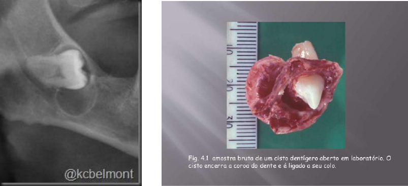 Cistos Odontogênicos Com raras exceções, cistos revestidos por epitélio nos ossos do corpo são observados somente nos ossos gnáticos. A maioria dos cistos dos ossos gnáticos são revestidos por epitélio derivado de epitélio odontogênico. Eles são denominados cistos odontogênicos. De acordo com sua origem, os cistos odontogênicos são subclassificados em cistos de desenvolvimento ou inflamatórios. Os inflamatórios é o que já vimos. Diferença: Cisto odontogenico desenvolvimento: dente hígido, sem alteração, origem de tecido epitelial odontogenico. Já o inflamatório, vem de restos epiteliais inflamados. Por que o cisto periapical é o mais comum? Pois a carie é a lesão mais comum, que por sua vez pode levar a pulpite, que pode levar à cisto periapical. Se eu faço teste de vitalidade e o dente está hígido, não é cisto periapical. Pois o dente pra ter cisto periapical tem de estar necrosado. Qual cisto mais comum de desenvolvimento? Cisto dentigero. De onde é originado o cisto de desenvolvimento? – Lamina dentaria, órgão do esmalte e epitélio reduzido do esmalte. Pq esses tecidos se proliferaram? Não se sabe. CISTO DENTÍGERO (FOLICULAR) O cisto dentígero é definido como um cisto que se origina pela separação do folículo que fica ao redor da coroa de um dente incluso. Muitas vezes um dente não irrompido pode estar sendo retido por um cisto. O cisto dentígero envolve a coroa de um dente impactado e se conecta ao dente pela junção amelocementária. A patogênese desse cisto é incerta, mas aparentemente ele se desenvolve pelo acúmulo de fluido entre o epitélio reduzido do esmalte e a coroa do dente. Mais comum em terceiros molares e em caninos superiores. CISTO DENTIGERO CIRCUNFERENCIAL – RECOBRE O DENTE INTEIRO Indolor, assintomático(exceto em casos de infecção), intra-osseo. Caracteristicas radiográficas: alo radiográfico com espaço radiolucido. VARIANTE: CISTO DENTIGERO LATERAL, QUANDO UM DOS DOIS LADOS ESTÁ ENVOLVIDO, CIRCUNDANDO E INDO PARA O LADO. Os cistos dentigeros raramente envolvem dentes decíduos inclusos. Embora o cisto dentígero possa ser encontrado em pacientes com uma ampla variação de idade, eles são descobertos mais frequentemente em pacientes entre 10 e 30 anos CISTOS DENTIGEROS EM GERAL SÃO COMPLETAMENTE ASSINTOMATICOS. Cistos dentigeros podem deslocar o dente envolvido. HISTOLOGICO Geralmente tem uma cápsula de tecido que é frouxo, e camadas de células epiteliais bem fininhas. Do epitélio ao tecido conjuntivo, o aspecto é todo plano. Podemos encontrar pouquíssimas células inflamatórias no infiltrado, neste caso, haverá dor. Um cisto dentigero infectado mostra aspecto de pouca delimitação. CISTO DE ERUPÇÃO (HEMATOMA DE ERUPÇÃO) O cisto de erupção é o análogo, nos tecidos moles, do cisto dentígero. O cisto se desenvolve como resultado da separação do folículo dentário da coroa de um dente em erupção que já está posicionado nos tecidos moles que recobrem o osso alveolar. O cisto de erupção surge como um aumento de volume de consistência mole, frequentemente translúcido, na mucosa gengival que recobre a coroa de um dente decíduo ou permanente em erupção. A maioria dos exemplos é observada em crianças com menos de 10 anos de idade. É A CONTRAPARTE DO DENTIGERO, LEMBRAR DISSO. Mais comumente associada a incisivos centrais decíduos inferiores, a primeiros molares permanentes e a incisivos decíduos superiores. Se o dente não tiver força de erupção, pode romper o cisto para facilitar o trabalho. No histológico vejo revestimento normal, com epitélio inflamado ou não, não há queratina na membrana do cisto, assim como o dentígero. Alteração na radiografia apenas gengival, pois não há nada de diferente no osso. Ulotomia – Incisar o cisto. Ulectomia – remoção da cápsula. CISTO GENGIVAL DO RECÉM – NASCIDO Indolor. Os cistos gengivais do recém-nascido são pequenos, superficiais e com conteúdo de ceratina, que são encontrados na mucosa alveolar de crianças. Esses cistos se originam dos remanescentes da lâmina dental. São lesões comuns, tendo sido descritas em até a metade de todos os recém-nascidos. SÃO QUERATINIZADOS, MUITAS VEZES TEM ROMPIMENTO ESPONTANEO. Cistos de inclusão similares (p. ex., pérolas de Epstein ou os nódulos de Bohn) são encontrados na linha média palatina ou lateralmente nos palatos duro e mole, NÃO É ODONTOGENICO, É DE INCLUSÃO. Perolas de Epstein AMBOS SÃO CISTOS DE INCLUSÃO. CISTO GENGIVAL DO ADULTO NÃO HÁ ALTERAÇÃO RADIOGRÁFICA, JÁ QUE É GENGIVAL. CAUSA: REMANESCENTES EPITELIAIS DO ESPAÇO DO LIGAMENTO PERIODONTAL. ANÁLOGO DO CISTO PERIODONTAL LATERAL. Localizados quase que invariavelmente na gengiva vestibular ou na mucosa alveolar. Ele é bem pouco comum. Muito comum entre caninos inferiores e pré molares superiores. GERALMENTE NÃO HÁ RECIDIVA, TENDO EM VISTA QUE ESSES CISTOS CONSEGUEM SEREM RETIRADOS, POIS SÃO ENCAPSULADOS. Mais comum em adultos idosos. CISTO PERIODONTAL LATERAL ENTRE OS PRE MOLARES. Chamado de cisto odontogênico BOTRIOIDE. Ocorre tipicamente ao longo da superfície radicular lateral de um dente. Acredita-se que surja dos restos da lâmina dental e represente a contraparte intraóssea do cisto gengival do adulto CARACTERÍSTICAS CLINICAS/RADIOGRÁFICAS Ocorre mais em adultos de quinta a sétima década de vida. Ocasionalmente, a lesão pode apresentar um aspecto policístico; tais exemplos foram denominados cistos odontogênicos botrioides. Macro e microscopicamente, exibem um aspecto de cachos de uva devido aos pequenos cistos individuais. Geralmente consideram-se tais lesões como representantes de uma variante do cisto periodontal lateral, possivelmente surgindo como resultado de degeneração cística e subsequente fusão de focos adjacentes de restos da lâmina dental. Histologico: nodulações que parecem redemoinhos de células. Ceratocisto odontogênico Potencial AGRESSIVO E INV