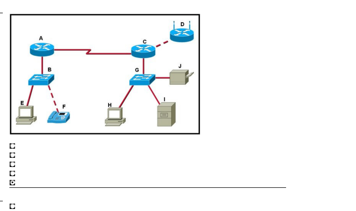 PROVA 1 1 Analise a imagem. Qual conjunto de dispositivos contém somente dispositivos finais? A, C, D B, E, G, H C, D, G, H, I, J D, E, F, H, I, J E, F, H, I, J 2 Qual é a ordem adequada das camadas do modelo OSI, da camada mais superior para a camada mais inferior? física, rede, aplicação, enlace de dados, apresentação, sessão, transporte aplicação, física, sessão, transporte, rede, enlace de dados, apresentação aplicação, apresentação, física, sessão, enlace de dados, transporte, rede aplicação, apresentação, sessão, transporte, rede, enlace de dados, física apresentação, enlace de dados, sessão, transporte, rede, física, aplicação 3 Quais sentenças identificam corretamente o papel dos dispositivos intermediários na rede? (Escolha três.) determinar caminhos para os dados iniciar comunicações de dados retemporizar e retransmitir os sinais de dados originar o fluxo de dados gerenciar fluxos de dados ponto final para o fluxo de dados 4 Qual camada encapsula o segmento em pacotes? física enlace de dados rede transporte 5 Analise a imagem. Qual tipo de rede é exibida? WAN MAN LAN WLAN Fazer avaliação - ENetwork Chapter 2 - CCNA Exploration: Fundamentos de Redes (Versão 4.0) Tempo restante: 00:42:00 6 Analise a imagem. Quais rótulos identificam corretamente os tipos de rede para os segmentos de rede exibidos? (Escolha três.) Rede A -- WAN Rede B -- WAN Rede C -- LAN Rede B -- MAN Rede C -- WAN Rede A -- LAN 7 Quais são as pricipais funções do encapsulamento? (Escolha três.) permite modificação dos dados originais antes da transmissão identifica pedaços de dados como parte da mesma comunicação permite caminhos de rede consistentes para comunicação garante que pedaços de dados possam ser direcionados ao dispositivo de recebimento correto permite a remontagem de mensagens completas rastreia o atraso entre dispositivos finais 8 Analise a imagem. Qual termo de rede descreve o processo de intercalação de dados representado na imagem? piping PDU fluxo multiplexação encapsulamento 9 Durante o processo de encapsulamento, o que ocorre na camada de enlace de dados? Nenhum endereço é adicionado. O endereço lógico é adicionado. O endereço físico é adicionado. O número da porta do processo é adicionado. 10 Qual é o propósito da camada de Acesso à Rede do modelo TCP/IP? determinação de caminho e comutação de pacote representação de dados, codificação e controle confiabilidade, controle de fluxo e detecção de erro detalhamento dos componentes que compõem o link físico e como acessá-lo a divisão de segmentos em pacotes 11 Quais as sentenças que melhor descrevem uma rede local (LAN)? (Escolha três.) Uma LAN está geralmente em uma única área geográfica. A rede é administrada por uma única organização. A conexão entre segmentos na LAN é prporcionada geralmente por uma conexão alugada. A segurança e o controle de acesso da rede são controlados por um provedor de serviços. Uma LAN fornece serviços de rede e acesso a aplicações para usuários de uma organização comum. Cada extremidade da rede é geralmente conectada a um Provedor de Serviços de Telecomunicação (TSP). 12 Analise a imagem. O "Celular A" no endereço IP 10.0.0.34 estabeleceu uma sessão IP com o "Telefone IP 1" no endereço IP 172.16.1.103. Com base na imagem, qual tipo de dispositivo melhor descreve a função do dispositivo sem fio "Celular A?" o dispositivo de destino um dispositivo final um dispositivo intermediário um dispositivo de meio 13 O que pode ser identificado examinando o cabeçalho de camada de rede? o dispositivo de destino no meio local o caminho a ser usado para se alcançar o host de destino os bits que serão transferidos no meio a aplicação ou processo de origem criando os dados 14 Qual é uma função básica das informações do cabeçalho adicionadas pelo encapsulamento da camada de enlace de dados? suporta detecção de erro garante chegada ordenada de dados fornece entrega para o destino correto identifica os dispositivos na rede local auxilia dispositivos intermediários com processamento e seleção de caminho 15 Qual é o principal propósito da atribuição de porta da Camada 4? identificar dispositivos no meio local identificar os saltos entre origem e destino identificar aos dispositivos intermediários o melhor caminho pela rede identificar os dispositivos finais de origem e destino que estão se comunicando identificar os processos ou serviços que estão se comunicando nos dispositivos finais Fazer avaliação - ENetwork Chapter 2 - CCNA Exploration: Fundamentos de Redes (Versão 4.0) Tempo restante: 00:28:18 16 Analise a imagem. Qual termo identifica corretamente o tipo de dispositivo incluído na área verde? origem destino transferência intermediário 17 Selecione as sentenças que estão corretas sobre protocolos de rede. (Escolha três.) definir a estrutura da camada específica da PDU ditar como realizar funções da camada informar as funções necessárias para comunicações entre camadas limitar compatibilidade de hardware exigir encapsulamentos dependentes da camada eliminar padronização entre fornecedores 18 O que é uma PDU? corrupção de um quadro durante uma transmissão dados reagrupados no destino pacotes retransmitidos devido a comunicação perdida um encapsulamento específico de camada 19 Quais são as duas camadas do modelo OSI que possuem as mesmas funções que a Camada de Acesso à Rede do modelo TCP/IP? (Escolha duas.) Rede Transporte Física Enlace de Dados Sessão 20 Qual característica refere-se corretamente a dispositivos finais em uma rede? gerenciar fluxos de dados originar fluxo de dados redefinir tempo e retransmitir sinais de dados determinar caminhos para dados 21 Qual dispositivo é considerado um dispositivo intermediário? servidor de arquivos telefone IP laptop impressora switch PROVA 2 1 Quais são as características das redes ponto-a-ponto (peer-to-peer)? 