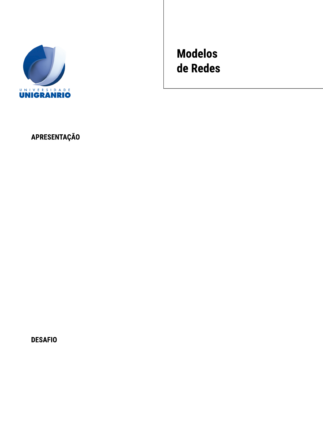 Olá! Nesta Unidade de Aprendizagem você vai estudar os modelos de rede, mais especificamente os modelos OSI e internet - este também conhecido como modelo TCP/IP. Por meio do estudo dos modelos de rede, é possível verificar todas as tarefas que ocorrem para envio e recebimento de dados pelas redes de computadores, a par*r do momento, por exemplo, em que um usuário usa um aplica*vo de e-mail para enviar uma mensagem. Os modelos de rede definem tudo o que ocorre até que essa mensagem chegue na placa de rede do disposi*vo para ser enviada pelo meio de transmissão até sua chegada no aplica*vo de e-mail do des*natário. Bons estudos! Ao final desta unidade você deve apresentar os seguintes aprendizados: Reconhecer os modelos de rede OSI e TCP/IP. Iden*ficar as funcionalidades de cada uma de suas camadas. Comparar as diferenças entre as camadas dos modelos OSI e TCP/IP. Você trabalha na empresa XTelComY e sua atribuição, no momento, é apresentar em uma reunião um resumo explicando as principais funções das 7 camadas OSI, entre outros assuntos. Com isso, seu desafio é criar um infográfico mostrando as 7 camadas juntamente com um resumo explicando cada uma. Obs.: Infográfico é uma ferramenta que serve para transmi*r informações através do uso de imagens, desenhos e • • • Unidade de Aprendizado https://sagahcm.sagah.com.br/sagahcm/ua/9139/3/36/indexprint.html 1 de 16 29/08/2018 10:02 demais elementos visuais gráficos. site web Os modelos de redes são modelos conceituais u*lizados para definir todos os processos envolvidos no envio e no recebimento de pacotes de dados em redes. Para aprofundar seus estudos, acompanhe a obra Comunicação de dados e redes de computadores, de Behrouz A. Forouzan. Inicie sua leitura no 7tulo "Conjunto de protocolos TCP/IP". Unidade de Aprendizado https://sagahcm.sagah.com.br/sagahcm/ua/9139/3/36/indexprint.html 2 de 16 29/08/2018 10:02 Unidade de Aprendizado https://sagahcm.sagah.com.br/sagahcm/ua/9139/3/36/indexprint.html 3 de 16 29/08/2018 10:02 Unidade de Aprendizado https://sagahcm.sagah.com.br/sagahcm/ua/9139/3/36/indexprint.html 4 de 16 29/08/2018 10:02 Unidade de Aprendizado https://sagahcm.sagah.com.br/sagahcm/ua/9139/3/36/indexprint.html 5 de 16 29/08/2018 10:02 Unidade de Aprendizado https://sagahcm.sagah.com.br/sagahcm/ua/9139/3/36/indexprint.html 6 de 16 29/08/2018 10:02 Unidade de Aprendizado https://sagahcm.sagah.com.br/sagahcm/ua/9139/3/36/indexprint.html 7 de 16 29/08/2018 10:02 Unidade de Aprendizado https://sagahcm.sagah.com.br/sagahcm/ua/9139/3/36/indexprint.html 8 de 16 29/08/2018 10:02 Unidade de Aprendizado https://sagahcm.sagah.com.br/sagahcm/ua/9139/3/36/indexprint.html 9 de 16 29/08/2018 10:02 Unidade de Aprendizado https://sagahcm.sagah.com.br/sagahcm/ua/9139/3/36/indexprint.html 10 de 16 29/08/2018 10:02 Unidade de Aprendizado https://sagahcm.sagah.com.br/sagahcm/ua/9139/3/36/indexprint.html 11 de 16 29/08/2018 10:02 Um modelo de rede é diferente da estrutura 9sica de uma rede. Assista ao vídeo para entender essa diferença e como o modelo de rede complementa as a*vidades de envio de dados pelas redes. 1) A imagem refere-se a um datagrama gerado em um determinado computador e mostra a representação do modelo OSI. Analise a imagem e marque a alterna+va que iden+fica CORRETAMENTE o serviço de rede envolvido, o protocolo de transporte e também o servidor responsável por atender à solicitação. Unidade de Aprendizado https://sagahcm.sagah.com.br/sagahcm/ua/9139/3/36/indexprint.html 12 de 16 29/08/2018 10:02 a) O serviço refere-se a uma consulta DNS, o protocolo responsável por transportar esta solicitação é o TCP, e o servidor que responde a esta consulta é o que possui o IP 10.10.10.4. b) O serviço refere-se ao acesso a um site, o protocolo responsável por transportar esta solicitação é o TCP, e o servidor envolvido possui o IP 10.10.10.4. c) O serviço refere-se ao acesso a um site, o protocolo responsável por transportar esta solicitação é o UDP, e o servidor que responde a esta consulta é o que possui o IP 10.10.10.4. d) O serviço refere-se ao acesso a um site, o protocolo responsável por transportar esta solicitação é o TCP, e o servidor envolvido possui o IP 10.10.10.40. e) O serviço refere-se a uma consulta DNS, o protocolo responsável por transportar esta solicitação é o UDP, e o servidor envolvido possui o IP 10.10.10.40. 2) O modelo OSI é composto por sete camadas ordenadas: ● Física (camada 1) ● Enlace (camada 2) ● Rede (camada 3) ● Transporte (camada 4) ● Sessão (camada 5) ● Apresentação (camada 6) ● Aplicação (camada 7) Estas camadas são relacionadas entre si, cada uma das quais definindo uma parte do processo de transferência de informações através de uma rede. Os pacotes de dados passam por todas as camadas, porém, dentre elas há apenas uma, cujo a função é faculta+va, ou seja, poderá ou não ter alguma tarefa a realizar dependendo do +po de informação a ser enviada pela rede. Marque a alterna+va que iden+fica CORRETAMENTE essa camada. a) Camada de enlace. b) Camada de transporte. c) Camada de sessão. Unidade de Aprendizado https://sagahcm.sagah.com.br/sagahcm/ua/9139/3/36/indexprint.html 13 de 16 29/08/2018 10:02 d) Camada de apresentação. e) Camada de rede. 3) Diferente do modelo OSI, o modelo TCP/IP foi dividido em apenas quatro camadas, porém todas as informações e funções para o envio do pacote de dados pela rede são realizadas no modelo TCP/IP, ou seja, algumas funções das camadas do modelo OSI foram agrupadas em camadas do modelo TCP/IP. Analise as camadas do modelo TCP/IP e marque a alterna+va que iden+fica CORRETAMENTE a equivalência entre as camadas do modelo OSI. a) Camada de aplicação: Agrupa as funções das camadas de aplicação, de apresentação e de sessão do modelo OSI. Camada de transporte: Representa as mesmas funções da camada de transporte do modelo OSI. Camada de internet: Equivale a camad