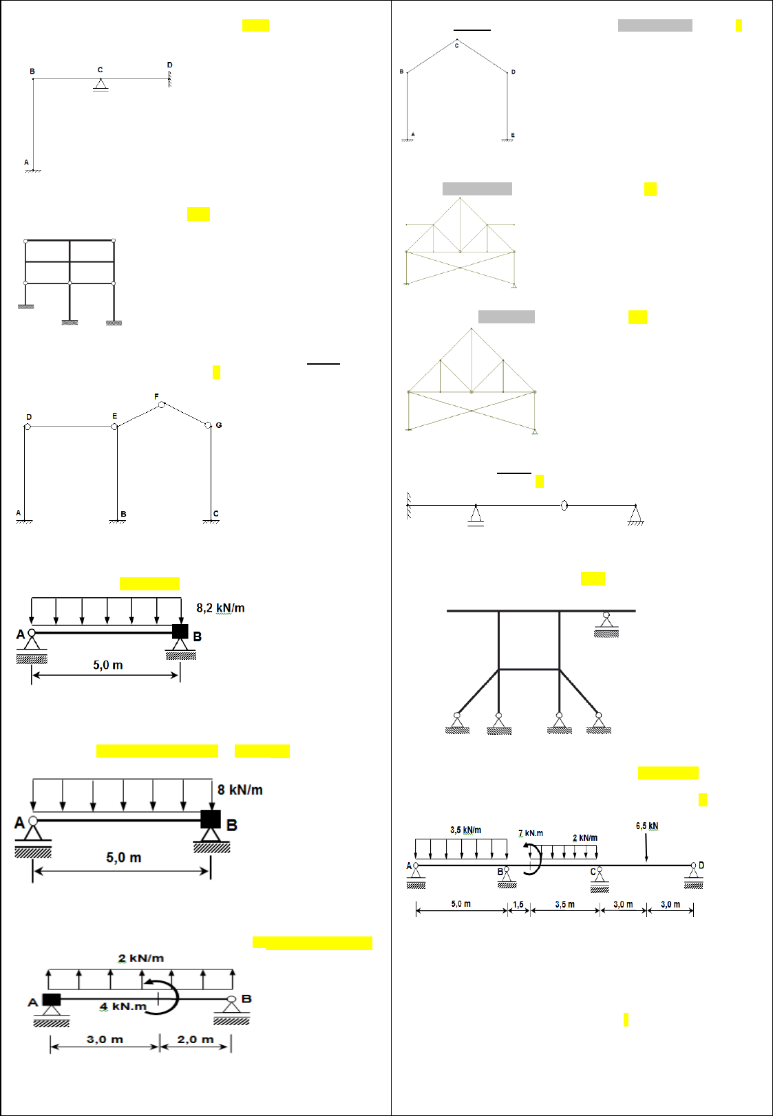 Com base na figura abaixo, assinale a alternativa CORRETA que apresenta o valor da deslocabilidade interna da estrutura. Di = 2 _______________________________________________________ Com base na figura abaixo, assinale a alternativa CORRETA que apresenta o valor da deslocabilidade interna da Estrutura di = 4 . ________________________________________________________ Com base na estrutura representada abaixo, assinale a alternativa correta que apresenta o grau de deslocabilidade externa. 2. _______________________________________________________ Assinale a alternativa correta que apresenta o valor do momento de engastamento perfeito na extremidade B da barra AB apoiada-engastada, sabendo que no ponto B existe uma chapa rígida. -25,625 kN.m ______________________________________________________ Para o trecho AB de uma viga representado na figura abaixo, assinale a alternativa que apresenta os valores dos Momentos de Engastamento Perfeito (MEPs). Considere que sobre o ponto B há uma chapa rígida, restringindo as possibilidades de deslocamentos. MAB = 0 e MBA = -25 KN.m ou -25,625KNm ____________________________________________________ Com base na situação de carregamento de barra referente ao cálculo de ilustrado abaixo, assinale a alternativa correta que apresenta os MEPs atuantes em cada extremidade de barra. Utilize a convenção de Grinter. MAB = -5,21 kN.m e MBA = 0 Com base na viga ilustrada a seguir, marque a alternativa que apresenta o valor correto da reação de apoio vertical no ponto C. Para tanto, utilize o método das deformações e considere o produto E.I = constante. 110,43 kN Com base na viga ilustrada, a seguir, marque a alternativa que apresenta o valor aproximado do momento, em módulo, no ponto B. Para tanto, considere E e I constantes. Para a resolução, utilize o método das deformações. 41,65 kN.m _____________________________________________________ Para a estrutura a seguir, considerando um recalque para baixo no nó F, assinale a alternativa correta: Considerando as barras inextensíveis, as barras afetadas pelo recalque seriam a AB e a CD. ____________________________________________________ Para a estrutura a seguir, assinale a alternativa correta. Considere todas as simplificações. Todos os nós, exceto F,G e H, possuem uma deslocabilidade interna e os dois pavimentos podem sofrer deslocamento na horizontal. Desta forma, há duas deslocabilidades externas. ___________________________________________________________ Com base no pórtico abaixo assinale a alternativa CORRETA que apresenta os valores dos coeficientes de distribuição do processo de Cross, referentes às barras 1,2 e 3 respectivamente. 0,3478 ; 0,4348 ; 0,2174; Com base na estrutura representada abaixo, assinale a alternativa correta que apresenta o grau de deslocabilidade interna. 3 ____________________________________ Calcule a deslocabilidade externa da estrutura abaixo: – 1 ______________________________________________________________ Calcule o grau de estaticidade da estrutura abaixo. – 19 ______________________________________________________________ Assinale a alternativa correta que apresenta o valor da deslocabilidade interna “di” da viga ilustrada a seguir. 1. ______________________________________________________________ Com base na figura abaixo, assinale a alternativa CORRETA que apresenta o valor da deslocabilidade interna da estrutura. Di = 4 ___________________________________________________________ Com base na viga esquematizada determine as deslocabilidades interna e externa da mesma. Considere que a viga possui EI constante. di = 2 ; de = 0 Calcule o grau de estaticidade da estrutura esquematizada abaixo, -2 _____________________________________________________________ "Sabe-se que o coeficiente de distribuição de momento de uma barra com relação a um nó é a razão entre o coeficiente de rigidez à rotação da barra e o somatório dos coeficientes de rigidez à rotação de todas as barras que convergem no nó". Com base na informação anterior assinale a alternativa CORRETA que apresenta o valor do somatório de todos os coeficientes de distribuição de momento de todas as barras adjacentes a um determinado nó. 1 Calcule as reações de apoio da figura abaixo, sabendo que :L1 = 6,00m; L2 = 5,50 m; L3 = 5,80 m; L4 = 4,90 m; q1 = 28,50kN/m; q2 = 46,50 kN/m; q3=39,70 kN/m; q4 = 23,80 kN/m;EI1 = 1; EI2 = 2; EI3= 3; EI4 =1. VA = 64,74kN; VB =235,19 kN; VC = 248,35kN; VD =183,71 kN; VE = 41,65kN; _____________________________________________________________ Observe a viga representada na figura abaixo. Utilizando o método de Cross, determine o coeficiente de distribuição no nó B. Em seguida, marque a alternativa que apresenta a resposta correta. 0,43 e 0,57 ________________________________________________________________ Calcule os momentos fletores da estrutura representada na figura abaixo, sabendo que :barra AB ,EI1 = 5;Barra BC, EI2 = 3;barra CD, EI3= 8. MA = 0 Kn.m; MB =39,6 kN.m; MC = 21,1 kN.m; MD =49,5kN.m. Calcule os momentos fletores da estrutura representada na figura abaixo, sabendo que :barra AB ,EI1 = 3;Barra BC, EI2 = 6;barra CD, EI3= 4. MA = 0 Kn.m; MB =49,1 kN.m; MC = 27,7 kN.m; MD =46,2kN.m; _________________________________________________________ Para o pórtico apresentado a seguir, assinale a alternativa correta, considerando EI=6tf.m²: Adotando o SH com uma chapa no nó B e um apoio horizontal no nó B, numerados nesta sequência, teremos no caso (1) uma rotação do nó B Determine, por meio do Processo de Cross, a reação de apoio VB. Adote os apoios A,B, e C sequencialmente da esquerda para direita. Considere todas as barras do mesmo material e de inércia constante 140,64 Determine, por meio do Processo de Cross, o momento máximo no ponto B. Adote uma precisão de 0,01 KN.m para os momentos e os apoios A,B, e C sequencialmente da esquerda para direita. Considere todas as barras do mesmo material e de inércia constant