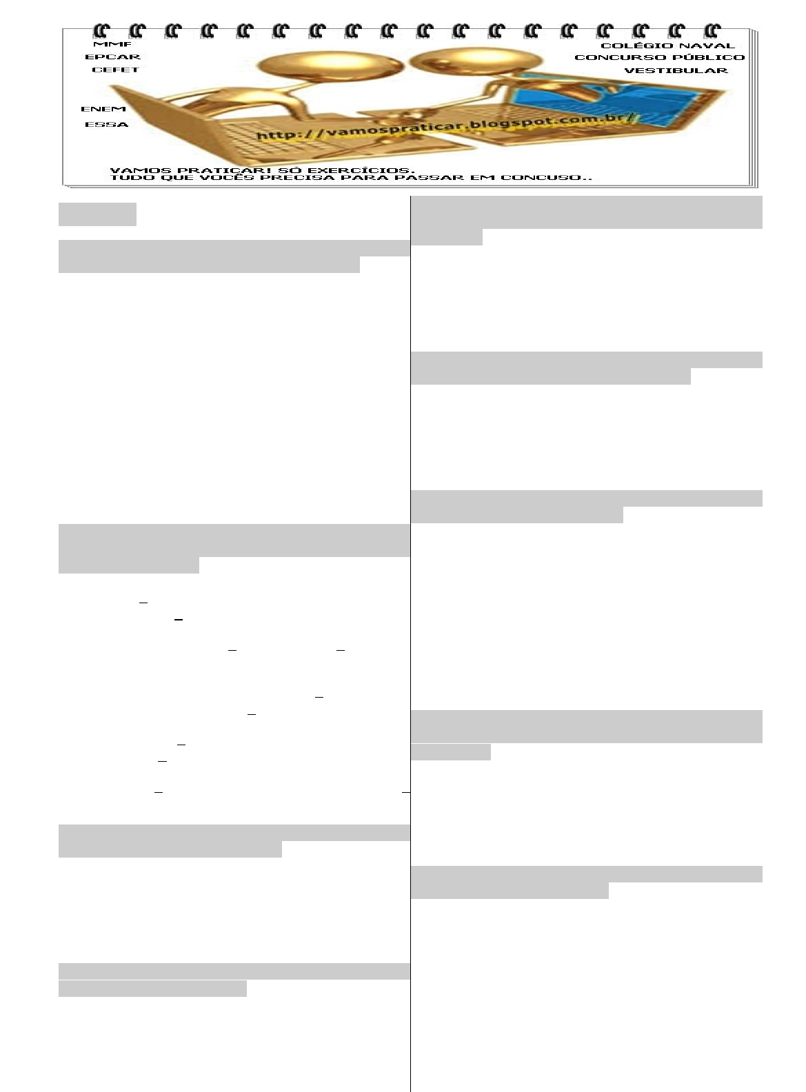 CRASE 1. (IBGE) Assinale a opção incorreta com relação ao emprego do acento indicativo de crase: O pesquisador deu maior atenção à cidade menos privilegiada. Este resultado estatístico poderia pertencer à qualquer população carente. Mesmo atrasado, o recenseador compareceu à entrevista. A verba aprovada destina-se somente àquela cidade sertaneja. Veranópolis soube unir a atividade à prosperidade. 2. (IBGE) Assinale a opção em que o A sublinhado nas duas frases deve receber acento grave indicativo de crase: 1. Fui a Lisboa receber o prêmio. / Paulo começou a falar em voz alta. 2. Pedimos silêncio a todos. Pouco a pouco, a praça central se esvaziava. 3. Esta música foi dedicada a ele. / Os romeiros chegaram a Bahia. 4. Bateram a porta fui atender. / O carro entrou a direita da rua. 5. Todos a aplaudiram. / Escreve a redação a tinta. 3. (UF-RS) Disse ..... ela que não insistisse em amar ..... quem não ..... queria. a) a - a - a d) à - à - à b) a - a - à e) a - à - à c) à - a - a 4. (UF-RS) Quanto ..... suas exigências, recuso- me ..... levá-las ..... sério. a) às - à - a d) à - a - à b) a - a - a e) as - a - a c) as - à - à 5. (UC-BA) Já estavam ..... poucos metros da clareira, ..... qual foram ter por um atalho aberto ..... foice. a) à - à - a d) à - a - à b) a - à - a e) à - à - à c) a - a - à 6. (UC-BA) Afeito ..... solidão, esquivava-se ..... comparecer ..... comemorações sociais. a) à - a - a d) a - à - a b) à - à - a e) a - a - à c) à - a - à 7. (TTN) Preencha as lacunas da frase abaixo e assinale a alternativa correta: "Comunicamos ..... Vossa Senhoria que encaminhamos ..... petição anexa ..... Divisão de Fiscalização que está apta ..... prestar ..... informações solicitadas." a) a, a, à, a, as d) à, à, a, à, às b) à, a, à, a, às e) à, a, à, à, as c) a, à, a, à, as 8. (UF-RS) Somente ..... longo prazo será possível ajustar-se esse mecanismo ..... finalidade ..... que se destina. a) a - à - a d) à - a - a b) à - a - à e) à - à - a c) à - à - à 9. (UF-RS) Entregue a carta ..... homem ..... que você se referiu ..... tempos. a) aquele - à - á d) àquele - à - à b) àquele - à - há e) àquele - a - há c) aquele - a - a 10. (BB) Há crase: a) Responda a todas as perguntas. b) Avise a moça que chegou a encomenda. c) Volte sempre a esta casa. d) Dirija-se a qualquer caixa. e) Entregue o pedido a alguém na portaria. 11. (CARLOS CHAGAS-BA) A casa fica ..... direita de quem sobe a rua, ..... duas quadras da avenida do Cortorno. a) à - há d) à - a b) a - à e) à - à c) a - há 12. (CARLOS CHAGAS-BA) Não nos víamos ..... tanto tempo, que ..... primeira vista não ..... reconheci. a) a - à - a d) há - à - a b) a - à - há e) a - a - a c) há - a - há 13. (SANTA CASA) Aconselhei-o ..... que, daí ..... pouco, assistissse .... novela. a) a - à - a d) à - à - a b) a - a - à e) à - a - à c) a - a - a 14. (CESESP-PE) Observe as alternativas e assinale a que não contiver erro em relação à crase: 1. Rabiscava todos os seus textos à lápis para depois escrevê-los à máquina. 2. Sem dúvida que, com novos óculos, ele veria a distância do perigo, aquela hora do dia. 3. Referia-se com ternura ao menino, afeto às meninas e, com respeito, a várias pessoas menos íntimas. 4. Àquela distância, os carros só poderiam bater; não obedeceram as regras do trânsito. 5. Fui à Maceió provar um sururu à região. 15. (FUVEST) ....... noite, todos os operários voltaram ....... fábrica e só deixaram o serviço ....... uma hora da manhã. a) Há, à, à d) À, a, há b) A, a, a e) A, à, a c) À, à, à 16. (CESCEM) Garanto ....... você que compete ....... ela, pelo menos ....... meu ver, tomar as providências para resolver o caso. a) a, a, a d) a, à, a b) à, à, a e) à, a à c) a, à, à 17. (CESCEM) Sentou ....... máquina e pôs-se ....... reescrever uma ....... uma as páginas do relatório. a) a - a - à d) à - à - à b) a - à - a e) à - à - a c) à - a - a 18. (MACK) Assinale a alternativa que completa corretamente as lacunas no seguinte período: "Agradeço ....... Vossa Senhoria ....... oportunidade para manifestar minha opinião ....... respeito." a) à - a - à d) a - a - a b) à - a - a e) à - à - a c) a - a - à 19. (SANTA CASA) ....... dias não se conseguem chegar ....... nenhuma das localidades ....... que os socorros se destinam. a) Há - à - a d) Há - a - a b) A - a - à e) À - a - à c) À - à - a 20. (SANTA CASA) Fique ....... vontade; estou ....... seu inteiro dispor para ouvir o que tem ....... dizer. a) a - à - a d) à - à - à b) à - a - a e) a - a - à c) à - à - a 21. (FMU) Assinale a alternativa em que não deve haver o sinal da crase: a) O sonho de todo astronauta é voltar a Terra. b) As vezes, as verdades são duras de se ouvir. c) Enriqueço, a medida que trabalho. d) Filiei-me a entidade, sem querer. e) O sonho de todo marinheiro é voltar a terra. 22. (FUVEST) De ..... muito, ele se desinteressou em chegar a ocupar cargo tão importante. ..... coisas mais simples na vida e que valem mais que a posse momentânea de certos postos de relevo ..... que tantos ambiciosos por amor ..... ostentação. a) a - Há - à - à d) a - Hão - a - à b) há - As - a - a e) há - A - a - a c) há - Há - a - à 23. (FGV) ..... tarde, acampadas já ..... horas, as tropas verificaram ..... perdas sofridas. a) Há - a - às d) Há - à - as b) À - há - as e) A - há - as c) À - a - às 24. (BB) Dizer ....... toda gente o que pensava ....... respeito das coisas era sua maior ambição, mas não ....... confessava sequer ....... sua melhor amiga. a) a, à, a, à d) a, à, à, à b) à, à, a, a e) à, a, a, a c) a, a, a, a 25. (BB) A amiga, ....... quem devia tanta atenção, não chegou ....... ouvir os agradecimentos que ....... muito esperava. a) a, a, a d) à, à, a b) a, a, há e) à, a, a c) à, à, há 26. (BB) Estarei ....... frente do prédio