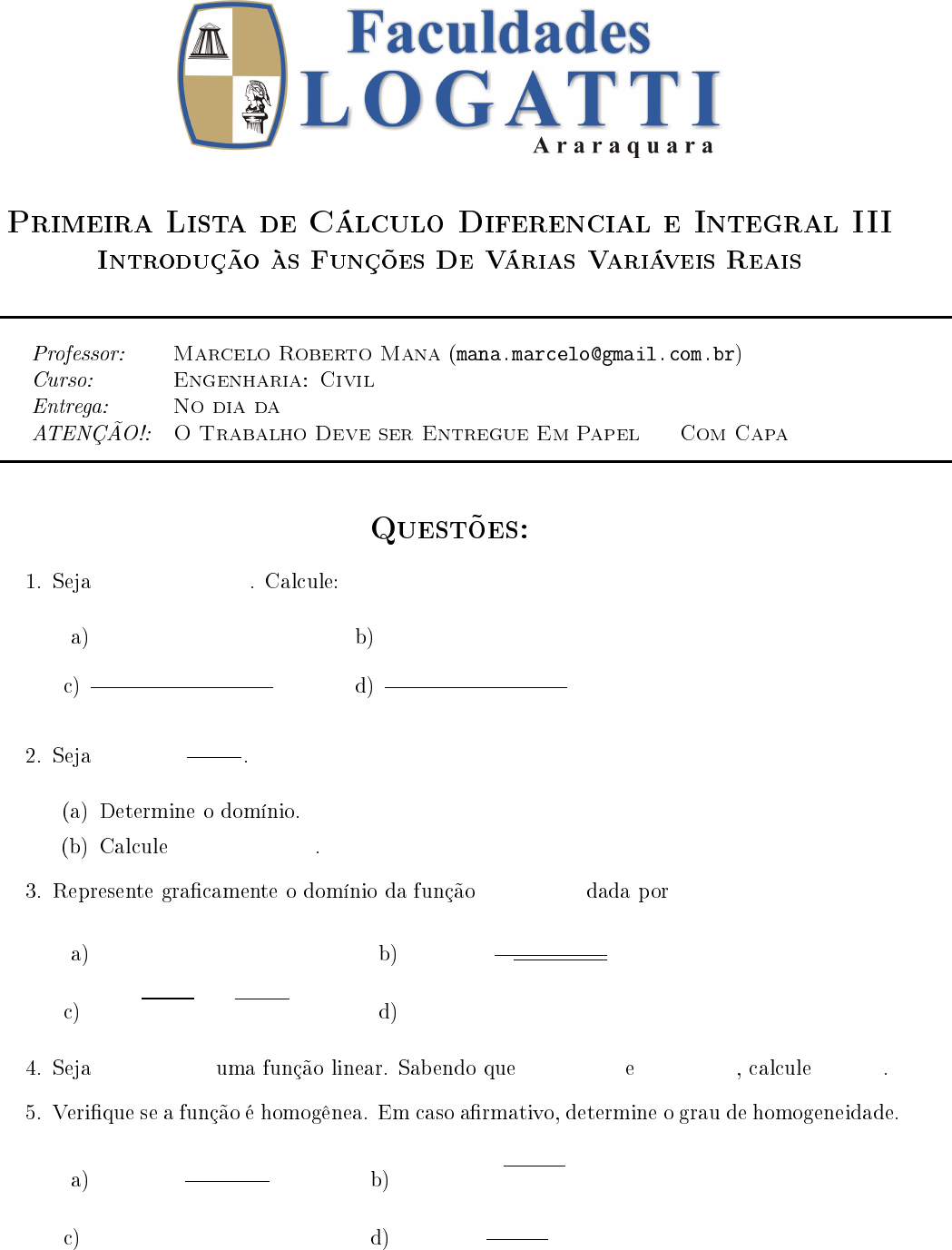 Primeira Lista de Cálculo Diferencial e Integral III Introdução às Funções De Várias Variáveis Reais Professor: Marcelo Roberto Mana (mana.marcelo@gmail.com.br) Curso: Engenharia: Civil Entrega: No dia da P1 ATENÇÃO!: O Trabalho Deve ser Entregue Em Papel A4 Com Capa Questões: 1. Seja f(x, y) = 3x + 2y. Calcule: a) f(1,−1) b)f(a, x) c) f(x + h, y) − f(x, y) h d) f(x, y + k) − f(x, y) k 2. Seja f(x, y) = x − y x + 2y . (a) Determine o domínio. (b) Calcule f(2u + v, v − u). 3. Represente graficamente o domínio da função z = f(x, y) dada por a) x + y − 1 + z2 = 0, z ≥ 0 b) f(x, y) = x − y√ 1 − x2 − y2 c) z =√y − x2 +√2x − y d) z = ln(2x2 + y2 − 1) 4. Seja f ∶ R2 Ð→ R uma função linear. Sabendo que f(1,0) = 2 e f(0,1) = 3, calcule f(x, y). 5. Verifique se a função é homogênea. Em caso afirmativo, determine o grau de homogeneidade. a) f(x, y) = x3 + 2xy2 x3 − y3 b) f(x, y) =√x4 + y4 c) f(x, y) = 5x3y + x4 + 3 d) f(x, y) = 2 x2 + y2 6. Suponha que f ∶ R2 Ð→ R seja homogênea de grau 2 e f(a, b) = a para todo (a, b), com a2 + b2 = 1. Calcule: (a) f(4√3,4) (b) f(0,3) (c) f(x, y), (x, y) ≠ (0,0) 7. Desenhe as curvas de nível das funções dadas: a) f(x, y) = 1 − x2 − y2 b) f(x, y) = x + 3y c) z = 4x2 + y2 d) f(x, y) = 1 + x2 + y2 8. Suponha que T (x, y) = 4x2 + 9y2 represente uma distribuição de temperatura no plano xy: T (x, y) é a temperatura, que podemos supor em 0C, no ponto (x, y). Desenhe a isoterma correspondente à temperatura de 360C. 9. Represente geometricamente o domínio da função dada: (a) f(x, y, z) =√1 − x2 − y2 − z2 (b) f(x, y, z) =√1 − z 10. Desenhe a superfície de nível correspondente a c = 1. a) f(x, y, z) = x b) f(x, y, z) = z c) f(x, y, z) = x2 + y2 d) f(x, y, z) = x2 + 4y2 + z2 2