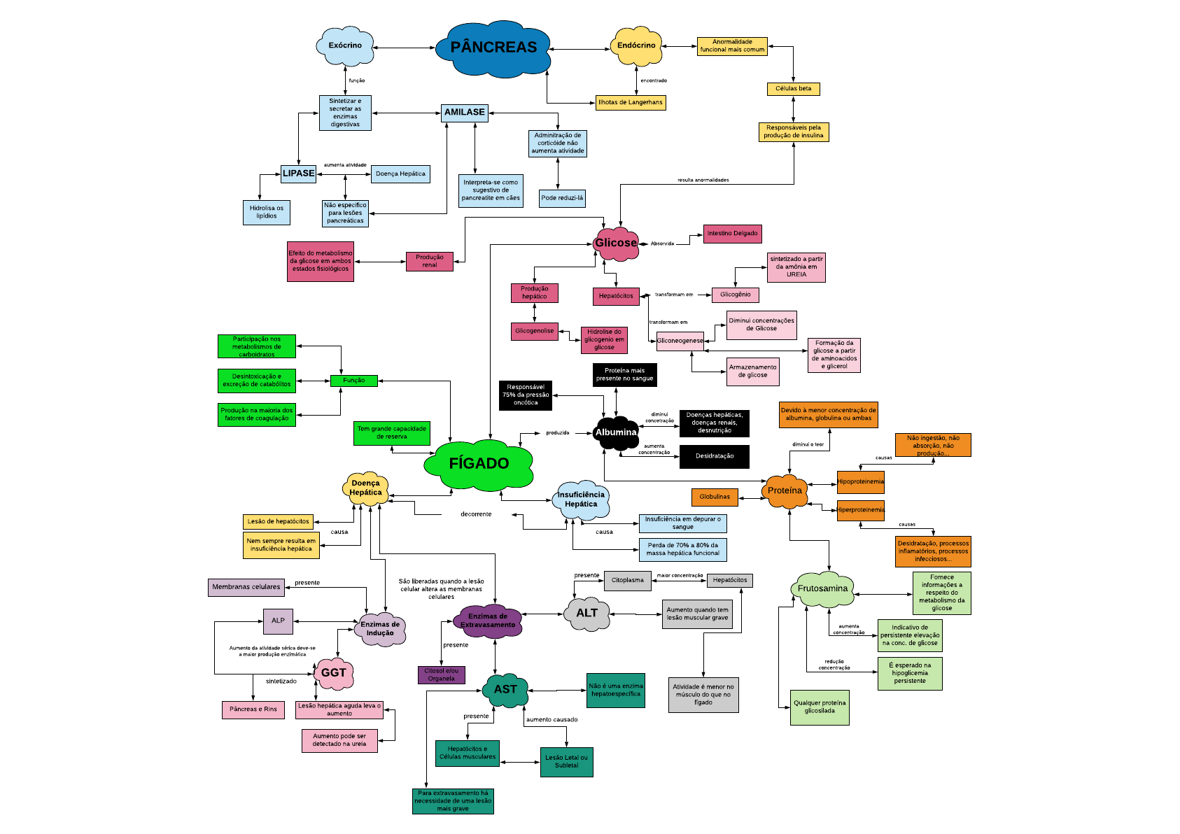 FÍGADO Doença Hepática Insuficiência Hepática causa Nem sempre resulta em insuficiência hepática Lesão de hepatócitos decorrente Insuficiência em depurar o sangue causa Perda de 70% a 80% da massa hepática funcional Enzimas de Indução Enzimas de Extravasamento São liberadas quando a lesão celular altera as membranas celulares Membranas celulares presente GGT Pâncreas e Rins sintetizado Lesão hepática aguda leva o aumento Aumento pode ser detectado na ureia ALP Aumento da atividade sérica deve-se a maior produção enzimática Citosol e/ou Organela presente AST Para extravasamento há necessidade de uma lesão mais grave Hepatócitos e Células musculares presente Lesão Letal ou Subletal aumento causado Não é uma enzima hepatoespecífica ALT Citoplasma presente Hepatócitos maior concentração Aumento quando tem lesão muscular grave Atividade é menor no músculo do que no fígado Tem grande capacidade de reserva Função Participação nos metabolismos de carboidratos Desintoxicação e excreção de catabólitos Glicose Intestino Delgado Absorvida Hepatócitos Glicogênio Gliconeogenese transformam em transformam em sintetizado a partir da amônia em UREIA Diminui concentrações de Glicose Armazenamento de glicose Albumina Proteína mais presente no sangue produzida Doenças hepáticas, doenças renais, desnutrição diminui concetração Desidratação aumenta concentração Proteína Globulinas Devido à menor concentração de albumina, globulina ou ambas diminui o teor Responsável 75% da pressão oncótica Hipoproteinemia Não ingestão, não absorção, não produção... causas Hiperproteinemia Desidratação, processos inflamatórios, processos infecciosos... causas Frutosamina Qualquer proteína glicosilada Indicativo de persistente elevação na conc. de glicose aumenta concentração É esperado na hipoglicemia persistente redução concentração Fornece informações a respeito do metabolismo da glicose função Produção na maioria dos fatores de coagulação aumenta atividade PÂNCREASExócrino Endócrino Sintetizar e secretar as enzimas digestivas LIPASE Hidrolisa os lipídios Doença Hepática Não especifico para lesões pancreáticas AMILASE Interpreta-se como sugestivo de pancreatite em cães Adminitração de corticóide não aumenta atividade Pode reduzi-lá Ilhotas de Langerhans encontrado Anormalidade funcional mais comum Células beta Responsáveis pela produção de insulina resulta anormalidades Produção renal Formação da glicose a partir de aminoacidos e glicerol Produção hepático Glicogenolise Hidrolise do glicogenio em glicose Efeito do metabolismo da glicose em ambos estados fisiológicos