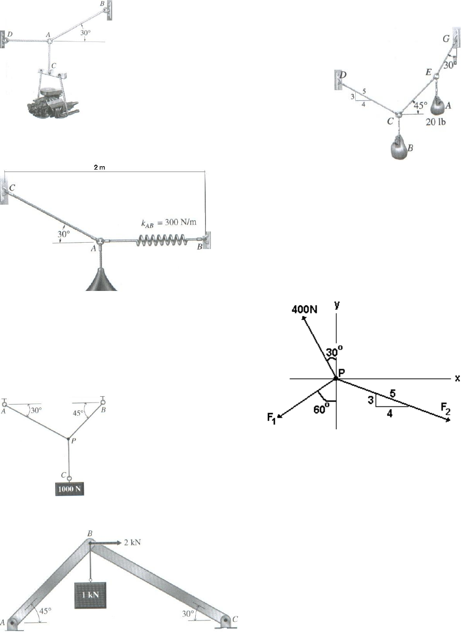 IFSC/Campus de Chapecó Lista 2 de Física – Sistemas com e sem Equilíbrio Nome: 1. Determine a tensão nos cabos AB e AD para equilibrar o motor de 250 kg mostrado na fig. Resposta: TAB = 4,90 kN; TAD = 4, 25 kN Considere g = 9,81 m/s2 2. Se o saco da fig. tiver peso de 20 N em A, determine o peso dele em B e a força necessária em cada corda para manter o sistema na posição de equilíbrio mostrada. Resposta: TEC = 38,6 N; TEG = 54,6 N; TCD = 34,2 N; WB = 47,8 N 3. Determine o comprimento da corda AC da fig. de modo que a luminária de 8 kg seja suspensa na posição mostrada. O comprimento não deformado da mola AB é l' AB = 0,4 m e a mola tem rigidez kAB = 300 N/m. Resposta: lAC = 1,32 m 4. Determine as intensidades de F1 e F2 de modo que o ponto material P esteja em equilíbrio. Resposta: F2 = 435 N; F1 = 171 N 5. Um peso de 1000 N é mantido em equilíbrio por três cabos PA, PB e PC, como mostra a fig. Os cabos PA e PB formam ângulos de 30° e 45°, respectivamente, com direção horizontal. Determine a força em cada cabo. Resposta: T1 = 732 N; T2 = 896,6 N 6. Determine as forças que os membros exercem na junta B da estrutura mostrada na fig. 7. Determine o peso máximo do motor que pode ser suportado sem exceder uma força de 450 lb na corrente AB e de 480 lb na corrente AC. Resposta: W = 240 lb. 8 - O duplo plano inclinado abaixo apresenta coeficientes de atrito estático e dinâmico iguais a 0,45 e 0,35. Determine os valores da massa A para as seguintes condições: a) a massa mínima de A para que o sistema fique parado; b) a massa máxima de A para que o sistema fique parado; c) a massa de A para que o sistema se desloque em MRU no sentido horário; d) a massa de A para que o sistema se desloque em MRU no sentido anti-horário; e) a massa de A para que o sistema se desloque no sentido horário com aceleração de 1,5 m/s2; f)a massa de A para que o sistema se desloque no sentido anti-horário com aceleração de 1,5 m/s2; 9 - Determine a aceleração com que o móvel se desloca horizontalmente devido a aplicação da Força de 60 N conforme mostra a figura à direita, acima. 10 - No sistema abaixo, C é uma cesta de massa desprezível que você, cliente desta disciplina, pode preencher com massa até identificar: a) a massa mínima colocada em C para que o sistema fique parado; b) a massa máxima colocada em C para que o sistema fique parado; c) a massa colocada em C para que o sistema se desloque em MRU no sentido horário; d) a massa colocada em C para que o sistema se desloque em MRU no sentido anti-horário; e) a massa colocada em C para que o sistema se desloque no sentido horário com aceleração de 1,5 m/s2; f)a massa colocada em C para que o sistema se desloque no sentido anti-horário com aceleração de 1,5 m/s2. 11 - Por ocasião do lançamento do veículo Corsa Wagon 1.6 MPFI, em 1998, a equipe de Marketing da GM do Brasil divulgou “... confortável, espaçoso, podendo render 102 CV a 5.600 rpm, 10% a mais que os modelos 5 portas similares existentes no mercado.” Para verificar a veracidade da propaganda, é feito o teste de rendimento pelo INMETRO, em pistas especiais, resultado publicado pela QUATRO RODAS. “... o conjunto (piloto + veículo) apresentam 1.520 Kg de massa total e no teste de pista , a média de três avaliações válidas atingiu de 0 a 100 Km/h em 8,2 segundos.” Com base nas informações de Quatro Rodas, verifique a veracidade da propaganda da GM, classificando o resultado como: a) a potência divulgada pelo marketing foi minimizada; b) a potência divulgada pelo marketing foi fiel à capacidade do motor; c) a potência divulgada pelo marketing foi exagerada, constituindo-se em propaganda enganosa. 12 – Um elevador de carga apresenta massa de 1820 Kg e sobe 86 m em 10 segundos, com velocidade constante. Determine: a) a velocidade b) a energia cinética c) o trabalho realizado; d) a potência do motor que traciona o elevador. 13 Um automóvel de teste de impacto (sem motorista) acelera a partir do repouso com 3 m/s2 durante 42 segundos, quando se choca com um muro. A massa do automóvel e 800 Kg. Calcule: a) a força com que o carro se choca contra o muro; b) o trabalho realizado por esta força; c) a energia cinética de choque; d) qual a potência do motor que foi utilizada. 14 – Do alto de um edifício com 98 metros cai uma laranja com 400 gramas. Mostre que, em queda livre, a energia total é conservativa escolhendo quatro pontos distintos da queda. 15 – A figura ao lado mostra um sistema se deslocando. Calcule: a) o valor de F para um MRU; b) o valor de F para aceleração de 2 m/s2; c) com esta aceleração, qual o trabalho realizado pela força motriz e pela força de atrito; d) sendo o bloco deslocado por 30 metros, qual o tempo e a velocidade final do movimento; e) qual é a variação da energia cinética? Lista 3 sobre Conservação de Energia 1. Um pêndulo simples, cuja esfera pendular tem massa de 1,0 kg, é abandonado na posição A, indicada na figura. No local, a aceleração da gravidade é g=10m/s2 e a resistência do ar é desprezível. Determine, quando a esfera passa pela posição B: a) Sua energia cinética; b) Sua velocidade escalar. θ A 3,2 m B 2. Calcular o que se pede. m = 300 Kg V0 = 0 A C g = 10 m/s2. 5 m 4 m a) VB; B b) Ecc. 3. Uma tartaruga de massa 40 Kg parte do repouso de uma altura de 10 metros, desliza ao longo de um tobogã e atinge a parte mais baixa com velocidade de 5 m/s. Admitindo a aceleração da gravidade igual a 10 m/s2, calcular a energia mecânica dissipada pelas força não conservativas, durante a descida da tartaruga. 10 m V = 5 m/s 4. No esquema da figura, o bloco tem massa 3 Kg e encontra-se inicialmente parado num ponto da rampa, cuja a altura é 1m. Uma vez abandonado, o bloco desce atingindo a mola de k=1x103N/m, que sofre uma compressão máxima de 20cm. Sendo g=10m/s2, calcular a energia mecânica dissipada no processo. A B 1 m 5. No arranjo experimental da figura