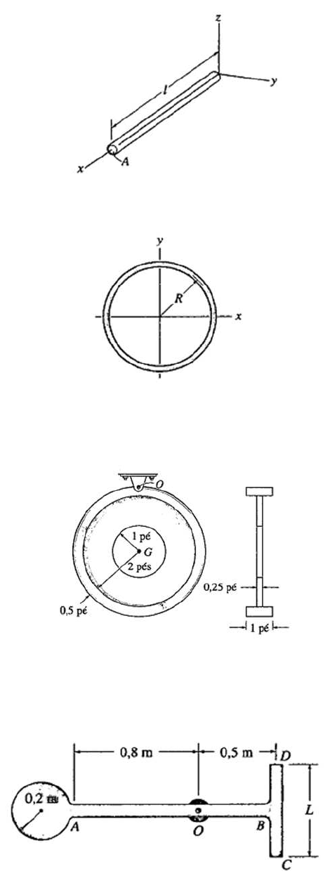 Lista de Exercícios 7 1) Determine o momento de inercia Iy para a barra delgada. A densidade ρ e a área da seção transversal da barra são constantes. Expresse o resultado em termos da massa total m da barra. 2) Determine o momento de inercia do anel fino, de massa, em relação ao eixo z. 3) Determine o momento de inercia d peça mostrada na figura, em relação a um eixo que é perpendicular á página e passa pelo ponto O. O material tem peso específico γ=90lb/ft³. 4) O sistema consiste num disco de 6kg e duas barras delgadas AB e DC, cada uma com 2kg/m. Se L=0,75m, determine o momento de inercia do sistema em relação ao eixo que é perpendicular à pagina e passa por O. Suponha que as barras e o disco são homogêneos. 5) Cada barra delgada pesa 3lb/ft. Determine o momento de inercia da peça em relação a um eixo que é perpendicular à página e passa pelo pino A. 6) Determine a aceleração vertical máxima a do sistema de forma que os elementos de ligação AB e CD fiquem submetidos a forças de no máximo 30kN e os elementos EF e GF, as forças de no máximos 34kN. 7) A estrutura tem massa de 8t e está sendo elevada pelo sistema de pau-de-carga e polia. Se o guincho em B enrola o cabo com uma aceleração de 2m/s², determine a força de compressão no cilindro hidráulico necessária para suportar o pau-de-carga que tem massa de 2t e centro de massa G. 8) O mecanismo de elevação tem massa de 70kg e centro de massa em G. Se ele ergue uma bobina de 120kg com uma aceleração de 3m/s², determine as reações de cada uma das quatro rodas sobre o solo. O carregamento é simétrico. Despreze a massa do braço móvel CD. Determine também a máxima aceleração para cima da bobina, de forma que nenhuma reação das rodas sobre o piso exceda 600N. 9) O tubo tem massa de 800kg e está sendo rebocado pelo veículo. Se � � 30�, determine a aceleração do veículo e a tensão no cabo. O coeficiente de atrito cinético entre o tubo e o solo é �� � 0,1. 10) O carro acelera uniformemente a partir do repouso a 88 ft/s em 15 segundos. Se ele tem peso de 3800lb e centro de gravidade em G, determine a reação normal de cada roda sobre o pavimento durante o movimento. Considere tração dianteira e que as rodas traseiras rola livremente. Despreze a massa das rodas e considere os seguintes valores dos coeficientes de atrito: �� � 0,2 e �� � 0,4. 11) O tubo curvado tem 80kg e está apoiado na superfície da plataforma. Durante o transporte de um nível ao outro, verifica-se que � � 0,25 ���/�² e ω � 0,5 ���/�, no instante em que � � 30�. Se ele não escorrega, determine suas reações sobre a plataforma nesse instante. 12) O disco de 80kg é suportado pelo pino em A. Se ele é solto a partir do repouso na posição mostrada na figura, determine os valores iniciais dos componentes da reação no pino. 13) A bobina está apoiada em pequenos roletes em A e B. Determine a força constante P que deve ser aplicada ao cabo para desenrolar 8m de cabo em 4s, a partir do repouso. Calcule também as forças em A e B durante esse tempo. A bobina tem massa de 60kg e raio de giração ko=0.65m. Despreze em seus cálculos as massas do cabo e dos roletes em A e B. 14) O rolo de papel, com 20kg tem raio de giração kA=90mm, em relação a um eixo que passa pelo ponto A e é suportado em ambas as extremidades por hastes AB ligadas a pinos. Se o rolo se apoia contra uma parede para a qual o coeficiente de atrito cinético é �� � 0,2 e uma força vertical F = 30N é aplicada á extremidade do papel, determine a aceleração angular do rolo á medida que o papel se desenrola. 15) A porta se fecha automaticamente usando molas de torção nas dobradiças. Se o torque em cada dobradiça é � � ��, onde � é medido em radianos, determine a rigidez k para que a porta se feche (� � 0�� com velocidade angular � � 2 ���/� quando solta do repouso em � � 90�. Em seus cálculos, considere a porta como uma placa fina tendo massa de 70kg. 16) A barra fina de 4kg é suportada horizontalmente por uma mola em A e uma corda em B. Determine a aceleração angular da barra e a aceleração de seu centro de massa no instante em que se corta a corda em B. Dica: a rigidez da mola não é relevante para esse cálculo. 17) O disco tem massa de 20kg e está inicialmente girando com velocidade angular � � 60 ���/� na extremidade do suporte BC. Se o disco é encostado na parede, para a qual o coeficiente de atrito cinético é �� � 0,3, determine o tempo necessário para o movimento cessar. Qual é a força no braço BC durante esse tempo? 18) A roda tem massa de 25kg e raio de giração kb=0,15m. Ela está girando inicialmente com velocidade angular �� � 40 ���/�. Se a roda é então posta no solo, para o qual, o �� � 0,5, determine o tempo necessário para cessar o movimento. Quais são os componentes horizontal e vertical da reação que o pino A exerce em AB durante esse tempo? Despreze a massa de AB. 19) O saco de treinamento tem 20kg e raio de giração kG=0,4m, em relação ao centro de massa G. Se ele está inicialmente em repouso e é submetido a uma força horizontal F = 30N, determine a aceleração angular inicial do saco e a tensão no cabo de suporte AB. 20) O foguete tem peso de 20000lb, centro de massa em G e raio de giração kG=21ft, em torno de seu centro de massa, no instante do inicio da ignição. Cada um dos motores fornece um empuxo T = 50000lb. Num dado instante, o motor A falha repentinamente. Determine a aceleração angular do foguete e a aceleração do ponto B. 21) A bobina tem massa de 500kg e raio de giração kG=1,30m. Ela está apoiada na superfície de uma esteira transportadora que apresenta coeficientes de atrito iguais a 0,5 (estático) e 0,4 (cinético). Se a esteira acelera a uma taxa de 1m/s², determine a tensão inicial no fio e a aceleração angular d